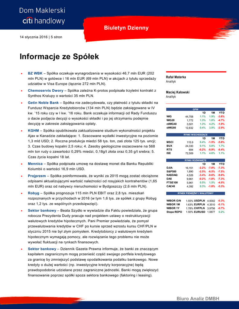 Biuletyn Dzienny 14 stycznia 2016 | 5 stron Informacje ze Spółek BZ WBK – Spółka oczekuje wynagrodzenia w wysokości 46,7 mln EUR (202 mln PLN) w gotówce i 16 mln EUR (69 mln PLN) w akcjach z tytułu sprzedaży udziałów w Visa Europe (łącznie 272 mln PLN). Rafał Materka Chemoservis Dwory – Spółka zależna K-protos podpisała trzyletni kontrakt z Synthos Kralupy o wartości 35 mln PLN. Maciej Kałowski Analityk Analityk Getin Noble Bank – Spółka nie zadecydowała, czy płatność z tytułu składki na Fundusz Wsparcia Kredytobiorców (134 mln PLN) będzie zaksięgowane w IV kw. ’15 roku czy w I kw. ’16 roku. Bank oczekuje informacji od Rady Funduszu o dacie podjęcia decyzji o wysokości składki i po jej otrzymaniu podejmie decyzję w zakresie zaksięgowania opłaty. KGHM – Spółka opublikowała zaktualizowane studium wykonalności projektu Ajax w Kanadzie zakładające: 1. Szacowane wydatki inwestycyjne na poziomie 1,3 mld USD; 2. Roczna produkcja miedzi 58 tys. ton, zaś złota 125 tys. uncji; 3. Czas budowy kopalni 2,5 roku; 4. Zasoby geologiczne oszacowane na 568 mln ton rudy o zawartości 0,29% miedzi, 0,18g/t złota oraz 0,35 g/t srebra; 5. GPW WIG WIG20 mWIG40 sWIG80 44,708 1,772 3,501 12,832 1D 1.1% 1.3% 1.3% 0.4% 1M 1.9% 1.0% 4.2% 3.9% YTD -3.8% -4.7% -1.9% -2.9% 1D 1M 0.4% -1.5% 0.1% 5.8% -0.2% -8.9% 1.1% 4.6% YTD -5.8% 1.7% -8.4% 1.1% RYNKI WSCHODZĄCE MSCI BUX RTS ISE 115.9 24,330 694 72,509 Czas życia kopalni 18 lat. RYNKI ROZWINIĘTE Mennica – Spółka podpisała umowę na dostawę monet dla Banku Republiki Kolumbii o wartości 16,9 mln USD. Projprzem – Spółka poinformowała, że wyniki za 2015 mogą zostać obciążone odpisami aktualizującymi wartość należności od rosyjskich kontrahentów (1,65 mln EUR) oraz od nabywcy nieruchomości w Bydgoszczy (2,6 mln PLN). Robyg – Spółka prognozuje 115 mln PLN EBIT oraz 2,8 tys. mieszkań rozpoznanych w przychodach w 2016 (w tym 1,6 tys. ze spółek z grupy Robyg oraz 1,2 tys. ze wspólnych przedsięwzięć). Sektor bankowy – Beata Szydło w wywiadzie dla Faktu powiedziała, że grupa DJIA S&P500 NASDAQ DAX FTSE100 CAC40 16,151 1,890 4,526 9,961 5,961 4,392 1D -2.2% -2.5% -3.4% -0.2% 0.5% 0.3% 1M -7.0% -6.5% -8.6% -1.8% 1.5% -1.8% YTD -7.3% -7.5% -9.6% -7.3% -4.5% -5.3% RYNEK PIENIĘŻNY I WALUTOWY WIBOR O/N WIBOR 1M WIBOR 1Y Stopa REPO 1.55% 1.63% 1.78% 1.50% USDPLN EURPLN CHFPLN EURUSD 4.0002 4.3510 3.9756 1.0877 -0.3% -0.1% -0.7% 0.2% robocza Prezydenta Dudy pracuje nad projektem ustawy o restrukturyzacji walutowych kredytów hipotecznych. Pani Premier powiedziała, że pomysł przewalutowania kredytów w CHF po kursie sprzed wzrostu kursu CHF/PLN w styczniu 2015 nie był złym pomysłem. Kredytobiorcy z walutowym kredytem hipotecznym wymagają pomocy, ale rozwiązanie tego problemu nie może wywołać fluktuacji na rynkach finansowych. Sektor bankowy – Dziennik Gazeta Prawna informuje, że banki ze znaczącym kapitałem zagranicznym mogą przenieść część swojego portfela kredytowego za granicę by zmniejszyć podstawę opodatkowania podatku bankowego. Nowe kredyty o dużej wartości (np. inwestycyjne kredyty korporacyjne) będą prawdopodobnie udzielane przez zagraniczne jednostki. Banki mogą zwiększyć finansowanie poprzez spółki spoza sektora bankowego (faktoring i leasing). Biuro Analiz DMBH Biuletyn dzienny 14 stycznia 2016 Trans Polonia – Trans Polonia prowadzi rozmowy w sprawie zakupu od spółek powiązanych z PKN Orlen 100% udziałów w Petrotrans. Ponadto spółka podpisała z Syntaxis II Luxembourg Capital umowę zapewniającą finansowanie przejęcia Petrotans oraz Orlen Transport. Transakcje Altus TFI – Osiecki Inwestycje sprzedał 2.163.753 akcji po 13,1 PLN za udział i obecnie kontroluje 22 .924.819 akcji (38,27% kapitału). Bumech – Dariusz Dźwigoł (Wiceprezes Zarządu) nabył 30.015 akcji po 0,72 PLN za udział . Comperia – Bartosz Michałek (Prezes Zarządu) nabył 2.811 akcji po 7-9 PLN za udział. Kalendarium Spółki Emperia Holding – Pierwszy dzień obrotu 4.773 akcji serii P. Gremi Media – Zmiana nazwy spółki na Gremi Inwestycje (GIW). Indykpol – NWZA w sprawie ustanowienia ograniczonego prawa rzeczowego na zorganizowanej części przedsiębiorstwa spółki. Interferie – NWZA w sprawie wyrażenia zgody na nabycie prawa użytkowania wieczystego nieruchomości położonych w Dąbkach. Open Finance – NWZA w sprawie połączenia Spółki Open Finance S.A. ze Spółką HB Finanse Spółka z o.o. Paged – Pierwszy dzień obrotu 400.000 akcji serii F oraz 7.000.000 akcji serii G. Triton Development – NWZA w sprawie ustalenia liczby członków rady nadzorczej, powołania członków rady nadzorczej, wyboru Przewodniczącego Rady Nadzorczej, wyznaczenia terminu pierwszego zebrania rady nadzorczej, ustalenia wysokości wynagrodzenia należnego członkom rady nadzorczej oraz ustalenia wysokości osobnego wynagrodzenia należnego członkom rady nadzorczej delegowanym do stałego indywidualnego wykonywania czynności nadzorczych. Kalendarium Makro NBP – Decyzja RPP w zakresie poziomu stóp procentowych (oczekiwane jest utrzymanie stóp na dotychczasowy m poziomie; stopa referencyjna wynosi obecnie 1,5%). NBP – Podaż pieniądza M3 w grudniu (oczekiwane +9,6% r/r w stosunku do +9,8% r/r w listopadzie). Makro NBP – Saldo rachunku bieżącego wyniosło w listopadzie +620 mln EUR (oczekiwano -303 mln EUR w stosunku do -163 mln EUR w październiku). Wezwania Duon – Fortum Holding głosił wezwanie do sprzedaży 115.572.647 akcji (100% udziałów), oferowana cena 3,85 PLN za udział. Zapisy potrwają od 28 stycznia do 26 lutego 2016. Magellan – Banca Farmafactoring głosił wezwanie do sprzedaży 6.720.037 akcji (100% udziałów), oferowana cena 64 PLN za udział. Zapisy potrwają od 28 stycznia do 29 lutego 2016. Quantum Software – Quantum Qguar głosił wezwanie do sprzedaży 235.000 akcji (15,87% udziałów), oferowana cena 6,15 PLN