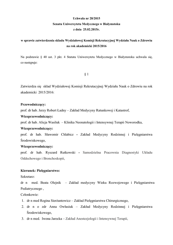 Uchwała nr 28/2015 Senatu Uniwersytetu Medycznego w Białymstoku z dnia 25.02.2015r. w sprawie zatwierdzenia składu Wydziałowej Komisji Rekrutacyjnej Wydziału Nauk o Zdrowiu na rok akademicki 2015/2016 Na podstawie § 40 ust. 3 pkt. 4 Statutu Uniwersytetu Medycznego w Białymstoku uchwala się, co następuje: §1 Zatwierdza się skład Wydziałowej Komisji Rekrutacyjnej Wydziału Nauk o Zdrowiu na rok akademicki 2015/2016: Przewodniczący: prof. dr hab. Jerzy Robert Ładny – Zakład Medycyny Ratunkowej i Katastrof, Wiceprzewodniczący: prof. dr hab. Alicja Wasiluk – Klinika Neonatologii i Intensywnej Terapii Noworodka, Wiceprzewodniczący: prof. dr hab. Sławomir Chlabicz - Zakład Medycyny Rodzinnej i Pielęgniarstwa Środowiskowego, Wiceprzewodniczący: prof. dr hab. Ryszard Rutkowski - Samodzielna Pracownia Diagnostyki Układu Oddechowego i Bronchoskopii, Kierunek: Pielęgniarstwo: Sekretarz: dr n med. Beata Olejnik – Zakład medycyny Wieku Rozwojowego i Pielęgniarstwa Pediatrycznego , Członkowie: 1. dr n med Regina Sierżantowicz – Zakład Pielęgniarstwa Chirurgicznego, 2. dr n o zdr Anna Owłasiuk – Zakład Medycyny Rodzinnej i Pielęgniarstwa Środowiskowego, 3. dr n med. Iwona Jarocka – Zakład Anestezjologii i Intensywnej Terapii, Kierunek: Położnictwo: Sekretarz: dr n med. Bożena Kulesza–Brończyk - Zakład Położnictwa, Ginekologii i Opieki PołożniczoGinekologicznej, Członkowie: 1. dr n med. Krystyna Piekut – Zakład Położnictwa, Ginekologii i Opieki PołożniczoGinekologicznej, 2. mgr Anna Kalisz – Zakład Położnictwa, Ginekologii i Opieki PołożniczoGinekologicznej, 3. dr n o zdr Irena Fiedorczuk – Zakład Med. Rodzinnej i Pielęgniarstwa Środowiskowego, Kierunek: Fizjoterapia: Sekretarz: dr n med. Bożena Okurowska – Zawada – Klinika Rehabilitacji Dziecięcej z Ośrodkiem Wczesnej Pomocy Dzieciom Upośledzonym "Dać Szansę", Członkowie: 1. dr n med Robert Terlikowski – Klinika Rehabilitacji, 2. mgr Anna Kalinowska – Klinika Rehabilitacji Dziecięcej z Ośrodkiem Wczesnej Pomocy Dzieciom Upośledzonym "Dać Szansę", 3. mgr Joanna Rutkowska-Talipska – Klinika Rehabilitacji, Kierunki: Zdrowie Publiczne: Sekretarz: prof. dr hab. Andrzej Szpak – Zakład Zdrowia Publicznego, Członkowie: 1. dr Agnieszka Genowska – Zakład Zdrowia Publicznego, 2. dr Dominik Maślach – Zakład Zdrowia Publicznego, 3. dr Bogusława Karczewska - Zakład Zdrowia Publicznego Kierunek: Dietetyka: Sekretarz: dr hab. Lucyna Ostrowska – Zakład Dietetyki i Żywienia Klinicznego, Członkowie: 1. dr Małgorzata Zujko - Zakład Technologii i Towaroznawstwa Żywności, 2. dr Ewa Stefańska - Zakład Dietetyki i Żywienia Klinicznego, 3. mgr Diana Wasiluk – Zakład Dietetyki i Żywienia Klinicznego. Kierunek: Ratownictwo Medyczne: Sekretarz: dr n med. Marzena Wojewódzka – Żelezniakowicz – Zakład Medycyny Ratunkowej i Katastrof, Członkowie: 1. lek. Agnieszka Borysiewicz – Zakład Medycyny Ratunkowej i Katastrof, 2. lek. Maciej Badoński – Zakład Medycyny Ratunkowej i Katastrof, 3. dr Anna Walesiuk – Zakład Medycyny Ratunkowej i Katastrof, Kierunek: Elektroradiologia: Sekretarz: lek. Marta Trypuć – Zakład Radiologii, Członkowie: 1. dr hab. Andrzej Ustymowicz – Zakład Radiologii, 2. dr Olga Sobotko – Waszczeniuk – Zakład Radiologii, Kierunek: Logopedia z Fonoaudiologią: Sekretarz: prof. dr hab. Bożena Kosztyła – Hojna – Zakład Fonoaudiologii Klinicznej i Logopedii, Członkowie: 1. mgr Anna Kraszewska - Zakład Fonoaudiologii Klinicznej i Logopedii, 2. dr Diana Moskal - Zakład Fonoaudiologii Klinicznej i Logopedii 3. mgr Dawid Falkowski - Zakład Fonoaudiologii Klinicznej i Logopedii. §2 Uchwała wchodzi w życie z dniem podjęcia. Przewodniczący Senatu Rektor Prof. dr hab. Jacek Nikliński