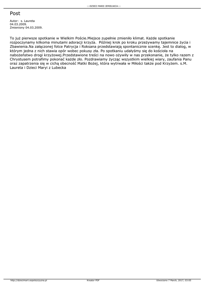 :::DZIECI MARII JEMIELNICA::: Post Autor: s. Laureta 04.03.2009. Zmieniony 04.03.2009. To już pierwsze spotkanie w Wielkim Poście.Miejsce zupełnie zmieniło klimat. Każde spotkanie rozpoczynamy kilkoma minutami adoracji krzyża. Później krok po kroku przeżywamy tajemnice życia i Zbawienia.Na załączonej fotce Patrycja i Roksana przedstawiają spontanicznie scenkę. Jest to dialog, w którym jedna z nich stawia opór wobec pokusy zła. Po spotkaniu udałyśmy się do kościoła na nabożeństwo drogi krzyżowej.Przedstawione treści na nowo ożywiły w nas przekonanie, że tylko razem z Chrystusem potrafimy pokonać każde zło. Pozdrawiamy życząc wszystkim wielkiej wiary, zaufania Panu oraz zapatrzenia się w cichą obecność Matki Bożej, która wytrwała w Miłości także pod Krzyżem. s.M. Laureta i Dzieci Maryi z Lubecka http://dziecimarii.eopolszczyzna.pl Kreator PDF Utworzono 7 March, 2017, 03:05