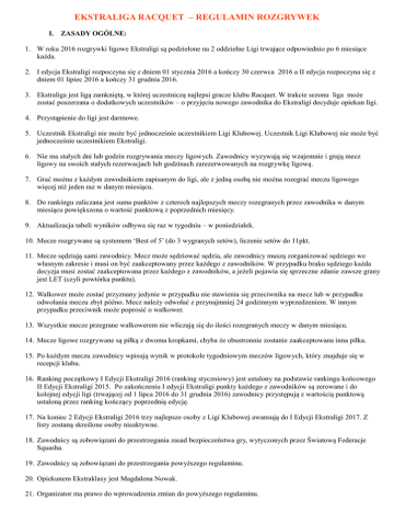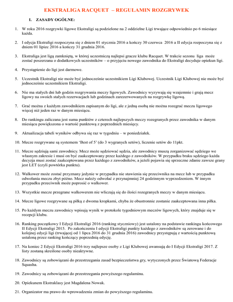 EKSTRALIGA RACQUET – REGULAMIN ROZGRYWEK I. ZASADY OGÓLNE: 1. W roku 2016 rozgrywki ligowe Ekstraligi są podzielone na 2 oddzielne Ligi trwające odpowiednio po 6 miesiące każda. 2. I edycja Ekstraligi rozpoczyna się z dniem 01 stycznia 2016 a kończy 30 czerwca 2016 a II edycja rozpoczyna się z dniem 01 lipiec 2016 a kończy 31 grudnia 2016. 3. Ekstraliga jest ligą zamkniętą, w której uczestniczą najlepsi gracze klubu Racquet. W trakcie sezonu liga może zostać poszerzana o dodatkowych uczestników – o przyjęciu nowego zawodnika do Ekstraligi decyduje opiekun ligi. 4. Przystąpienie do ligi jest darmowe. 5. Uczestnik Ekstraligi nie może być jednocześnie uczestnikiem Ligi Klubowej. Uczestnik Ligi Klubowej nie może być jednocześnie uczestnikiem Ekstraligi. 6. Nie ma stałych dni lub godzin rozgrywania meczy ligowych. Zawodnicy wyzywają się wzajemnie i grają mecz ligowy na swoich stałych rezerwacjach lub godzinach zarezerwowanych na rozgrywkę ligową. 7. Grać można z każdym zawodnikiem zapisanym do ligi, ale z jedną osobą nie można rozegrać meczu ligowego więcej niż jeden raz w danym miesiącu. 8. Do rankingu zaliczana jest suma punktów z czterech najlepszych meczy rozegranych przez zawodnika w danym miesiącu powiększona o wartość punktową z poprzednich miesięcy. 9. Aktualizacja tabeli wyników odbywa się raz w tygodniu – w poniedziałek. 10. Mecze rozgrywane są systemem ‘Best of 5’ (do 3 wygranych setów), liczenie setów do 11pkt. 11. Mecze sędziują sami zawodnicy. Mecz może sędziować sędzia, ale zawodnicy muszą zorganizować sędziego we własnym zakresie i musi on być zaakceptowany przez każdego z zawodników. W przypadku braku sędziego każda decyzja musi zostać zaakceptowana przez każdego z zawodników, a jeżeli pojawia się sprzeczne zdanie zawsze grany jest LET (czyli powtórka punktu). 12. Walkower może zostać przyznany jedynie w przypadku nie stawienia się przeciwnika na mecz lub w przypadku odwołania meczu zbyt późno. Mecz należy odwołać z przynajmniej 24 godzinnym wyprzedzeniem. W innym przypadku przeciwnik może poprosić o walkower. 13. Wszystkie mecze przegrane walkowerem nie wliczają się do ilości rozegranych meczy w danym miesiącu. 14. Mecze ligowe rozgrywane są piłką z dwoma kropkami, chyba że obustronnie zostanie zaakceptowana inna piłka. 15. Po każdym meczu zawodnicy wpisują wynik w protokole tygodniowym meczów ligowych, który znajduje się w recepcji klubu. 16. Ranking początkowy I Edycji Ekstraligi 2016 (ranking styczniowy) jest ustalony na podstawie rankingu końcowego II Edycji Ekstraligi 2015. Po zakończeniu I edycji Ekstraligi punkty każdego z zawodników są zerowane i do kolejnej edycji ligi (trwającej od 1 lipca 2016 do 31 grudnia 2016) zawodnicy przystępują z wartością punktową ustaloną przez ranking kończący poprzednią edycję. 17. Na koniec 2 Edycji Ekstraligi 2016 trzy najlepsze osoby z Ligi Klubowej awansują do I Edycji Ekstraligi 2017. Z listy zostaną skreślone osoby nieaktywne. 18. Zawodnicy są zobowiązani do przestrzegania zasad bezpieczeństwa gry, wytyczonych przez Światową Federacje Squasha. 19. Zawodnicy są zobowiązani do przestrzegania powyższego regulaminu. 20. Opiekunem Ekstraklasy jest Magdalena Nowak. 21. Organizator ma prawo do wprowadzenia zmian do powyższego regulaminu. II. PUNKTACJA: 1. Za wygrany mecz, niezależnie od wyniku zawodnik otrzymuje 100% wartości punktowej przeciwnika. Zawodnik pokonany otrzymuje punkty za każdy wygrany set: W przypadku przegranej w stosunku 0:3 nie otrzymuje punktów, W przypadku przegranej w stosunku 1:3 otrzymuje 20% wartości punktowej przeciwnika, W przypadku przegranej w stosunku 2:3 otrzymuje 40% wartości punktowe przeciwnika. 2. Wartość punktowa zawodników: Miejsce Wartość punktowa 1 100 2 95 3 90 4 85 5 80 6-8 75 9-11 70 12-14 65 15-19 60 20-24 55 25-29 50 30-34 45 35-39 40 40-44 35 45-.... 30 3. Przy takiej samej liczbie punktów w rankingu , zawodnicy zajmują miejsca ex quo. 4. Aktualizacja rankingu odbywa się co miesiąc. Będzie on dostępny na tablicy ogłoszeń w klubie oraz na stronie internetowej klubu. Wyniki każdego z meczy rozegranych w danym tygodniu będą podawane tylko i wyłącznie w internecie pod adresem www.racquet.pl. III. NAGRODY ORAZ PROFITY: 1. Na koniec każdej edycji Ekstraligi ogłaszany jest ranking końcowy, a najlepsi zawodnicy otrzymają nagrody w postaci pamiątkowych pucharów oraz nagród rzeczowych ufundowanych przez sponsorów. 2. Najaktywniejszy zawodnik każdej edycji Ekstraligi otrzymuje nagrodę rzeczową ufundowaną przez sponsora. 3. Najaktywniejszym zawodnikiem ligi zostaje osoba, która w przeciągu 6 miesięcy trwania Ekstraligi rozegra najwięcej spotkań ligowych. 4. Raz w miesiącu spośród wszystkich zawodników, którzy rozegrają w miesiącu poprzedzającym minimum 4 mecze ligowe, rozlosowany zostanie LIGOWY KARNET OPEN na 10 dni do wykorzystania na mecze ligowe. 5. LIGOWY KARNET OPEN jest imienny i przysługuje tylko na połowę kortu danego zawodnika. 6. Na koniec I edycji oraz II edycji Ekstraligi 2016 wszyscy zawodnicy, którzy rozegrają minimum 40 meczów ligowych w Ekstralidze otrzymają koszulki klubowe. 7. Na mecze ligowe wszystkim ligowiczom, przysługują zniżki na zasadach określonych poniżej: Ilość rozegranych meczów w miesiącu poprzedzającym Zniżka na mecze ligowe w danym miesiącu Zniżka w Gabinecie Masażu i Rehabilitacji Racquet w danym miesiącu Minimum 4 mecze 5,00% 5,00% 5–7 15,00% 15,00% 8 – 11 25,00% 25,00% 12 – 14. 35,00% 35,00% 15 i więcej 40,00% 40,00% 8. Zniżka na mecze ligowe oraz w gabinecie Racquet jest liczona od cen podstawowych wg obowiązującego cennika. Nie dotyczy HAPPY HOURS oraz innych czasowych promocji.
