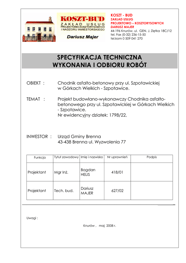 KOSZT - BUD ZAKŁAD USŁUG PROJEKTOWO – KOSZTORYSOWYCH DARIUSZ MAJER 44-196 Knurów, ul. GEN. J. Ziętka 18C/12 tel. Fax (0-32) 236-15-50 tel.kom 0 509 041 270 SPECYFIKACJA TECHNICZNA WYKONANIA I ODBIORU ROBÓT OBIEKT : Chodnik asfalto-betonowy przy ul. Szpotawickiej w Górkach Wielkich - Szpotawice. TEMAT : Projekt budowlano-wykonawczy Chodnika asfaltobetonowego przy ul. Szpotawickiej w Górkach Wielkich - Szpotawice. Nr ewidencyjny działek: 1798/22, INWESTOR : Urząd Gminy Brenna 43-438 Brenna ul. Wyzwolenia 77 Funkcja Tytuł zawodowy Imię i nazwisko Nr uprawnień Projektant Mgr InŜ. Bogdan HELIS 418/01 Projektant Tech. bud. Dariusz MAJER 627/02 Podpis ______________________________________________________________ Uwagi : Knurów , maj 2008 r. _ KOSZT-BUD Specyfikacja techniczna wykonania i odbioru robót Projekt budowlano-wykonawczy chodnika o nawierzchni z betonu asfaltowego przy ul Szpotawickiej w Górkach Wielkich Str. 2 SPIS TREŚCI CZĘŚĆ OPISOWA ZAWIERA : 1. Przedmiot i zakres robót........................................................................... 2. Dokumentacja robót................................................................................ 3. Technologia robót..................................................................................... 3.1. Odwodnienie......................................................................................... 3.2. Chodnik................................................................................................... 3.3. Galanteria betonowa.......................................................................... 4. Materiał....................................................................................................... 5. Sprzęt........................................................................................................... 6. Podstawowe uwagi dla wykonawców robót budowlanych.............. 3 3 3 3 3 5 6 6 6 KOSZT-BUD Specyfikacja techniczna wykonania i odbioru robót Projekt budowlano-wykonawczy chodnika o nawierzchni z betonu asfaltowego przy ul Szpotawickiej w Górkach Wielkich Str. 3 1. Przedmiot i zakres robót. Roboty budowlane obejmują wykonanie chodnika o nawierzchni z betonu asfaltowego przy drodze powiatowej Górki Wielkie – Grodziec na odcinku od ulicy. Szpotawickiej do ul Do Raju w Górkach Wielkich. 2. Dokumentacja robót. • Inwentaryzacja i projekt budowlany - wykonawczy chodnika przy ul. Szpotawickiej w Górkach Wielkich. • RMBiPMB z 28 marca l972 r. w sprawie bezpieczeństwa i higieny pracy przy wykonywaniu robót budowlano - montaŜowych. • Waninki Techniczne Wykonania i Odbioru Robót Budowlano - MontaŜowych • Polskie Normy 3. Technologia robót 3.1. Odwodnienie. Wykonać zgodnie z PN-S-02204 „Drogi Samochodowe. Odwodnienie wód”. Odwodnienie w postaci przykanalików z rur betonowych ∅ 200 ułoŜonych pod nawierzchnia chodnika. UKŁADANIE RUR Rury naleŜy układać z zachowaniem projektowanego spadku tak aby umoŜliwić odprowadzenie wód opadowych. Rury naleŜy układać na 10 cm warstwie piasku. Podczas opuszczania rury do wykopu naleŜy uwaŜać aby nikt nie stał pod opuszczana rurą. Kielich rur po ułoŜeniu uszczelnić. Kanały rurowe zasypywać równomiernie z obu stron, aby nie przesunąć przewodów. 3.2. Chodnik Wykonać zgodnie z PN-S-96021 „Nawierzchnie dla ruchu lekkiego z betonu asfaltowego” Nawierzchnia wykonana z betonu asfaltowego z następujących warstw: - podłoŜa naturalnego, - podbudowy - warstwa kruszywa łamanego o fr. 0-64 i grubości 15,0 cm, - warstwy klinującej – piasek o fr. 0-20 grubości 3 cm, - warstwy wiąŜącej asfaltobetonu grubości 4 cm, - warstwy ścieralnej asfaltobetonu grubości 2 cm. PODŁOśE NATURALNE Powierzchnia ta powinna być wyprofilowana, tzn. ukształtowana wg załoŜonych w projekcie spadków, jak równieŜ wyrównana. Powierzchnia gruntu winna być dobrze zagęszczona, tzn. jej stan zagęszczenia powinien osiągnąć zaprojektowany wskaźnik zagęszczenia gruntu. KOSZT-BUD Specyfikacja techniczna wykonania i odbioru robót Projekt budowlano-wykonawczy chodnika o nawierzchni z betonu asfaltowego przy ul Szpotawickiej w Górkach Wielkich Str. 4 Roboty ziemne wykonać zgodne z zaleceniami PN-S-02205:1998 „Drogi samochodowe. Roboty ziemne. Wymagania i badania” PODBUDOWA Podbudowę wykonać zgodnie z PN-S-06102:1997 „Drogi samochodowe. Podbudowa z kruszywa stabilizowanego mechanicznie” Spełnia ona rolę warstwy nośnej, filtracyjnej i mrozoodpornej. Niezwykle istotną rolę w budowie nawierzchni spełnia podbudowa, dlatego tak waŜne jest prawidłowe wykonanie poszczególnych jej warstw, jak równieŜ ich zagęszczenie. Tylko na prawidłowo wykonanych podbudowach moŜliwa jest długoletnia i bezawaryjna eksploatacja górnej części nawierzchni wykonanej z asfaltobetonu itp.. Warstwa powinna być właściwie zagęszczona. Materiałem do wykonania podbudowy jest tłuczeń kamienny. Wszystkie materiały zastosowane do wykonania podbudowy powinny posiadać atesty uprawnionych instytucji określające ich przydatność do stosowania na podbudowy. Do wykonania podbudowy przyjęto: warstwa z kruszywa łamanego o fr. 0-64 i grubości 15,0 cm, WARSTWA KLINUJĄCA Materiałem, który jest uŜyty do wykonania warstwy klinującej to piasek płukany o uziarnieniu 0- 20mm. Równe ułoŜenie podsypki uzyskuje się poprzez wyrównanie jej łatą drewnianą lub metalową. MoŜe to być wykonane ręcznie lub mechanicznie. WARSTWA WIĄśĄCA ASFALTOBETONU. Warstwę asfaltobetonu wykonać zgodnie z PN-S-96021:1997 „Drogi samochodowe. Nawierzchnie dla ruchu lekkiego z betonu asfaltowego. Beton asfaltowy do wykonania warstwy wiąŜącej powinien mieć następujący skład: Zawartość asfaltu D70 7% Zawartość agregatu mineralnego 93% w tym: grys i grysik 60% wypełniacz 9% piasek 31% Dozowanie kruszywa i wypełniaczy powinno odbywać się wagowo z dokładnością odpowiednio ±2.5% i ±1.0% masy całkowitej 