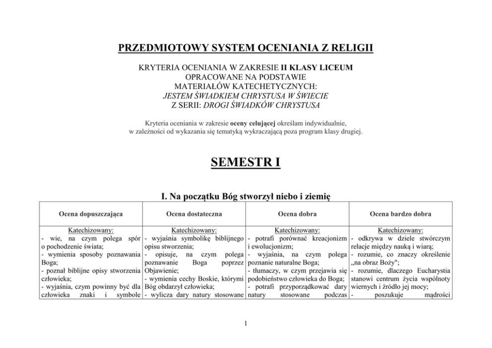 PRZEDMIOTOWY SYSTEM OCENIANIA Z RELIGII KRYTERIA OCENIANIA W ZAKRESIE II KLASY LICEUM OPRACOWANE NA PODSTAWIE MATERIAŁÓW KATECHETYCZNYCH: JESTEM ŚWIADKIEM CHRYSTUSA W ŚWIECIE Z SERII: DROGI ŚWIADKÓW CHRYSTUSA Kryteria oceniania w zakresie oceny celującej określam indywidualnie, w zależności od wykazania się tematyką wykraczającą poza program klasy drugiej. SEMESTR I I. Na początku Bóg stworzył niebo i ziemię Ocena dopuszczająca Ocena dostateczna Ocena dobra Ocena bardzo dobra Katechizowany: - wie, na czym polega spór o pochodzenie świata; - wymienia sposoby poznawania Boga; - poznał biblijne opisy stworzenia człowieka; - wyjaśnia, czym powinny być dla człowieka znaki i symbole Katechizowany: - wyjaśnia symbolikę biblijnego opisu stworzenia; - opisuje, na czym polega poznawanie Boga poprzez Objawienie; - wymienia cechy Boskie, którymi Bóg obdarzył człowieka; - wylicza dary natury stosowane Katechizowany: - potrafi porównać kreacjonizm i ewolucjonizm; - wyjaśnia, na czym polega poznanie naturalne Boga; - tłumaczy, w czym przejawia się podobieństwo człowieka do Boga; - potrafi przyporządkować dary natury stosowane podczas Katechizowany: - odkrywa w dziele stwórczym relacje między nauką i wiarą; - rozumie, co znaczy określenie „na obraz Boży"; - rozumie, dlaczego Eucharystia stanowi centrum życia wspólnoty wiernych i źródło jej mocy; poszukuje mądrości 1 liturgiczne; - opisuje, w czym przejawia się mądrość stwarzająca; - wyjaśnia, w jaki sposób stworzony świat świadczy o miłości Boga; - poznał teksty biblijne podkreślające chwałę Boga; - wie, jaki jest udział całej Trójcy Świętej w stworzeniu świata; - wie, kim są aniołowie; - uzasadnia, że świat jest stworzony przez Boga; - wie, kto jest patronem ekologów; - wie, jakie są zadania człowieka wierzącego wobec świata; -jest świadomy, że świat potrzebuje modlitwy; - wyjaśnia, na czym polega życie w prawdzie; - wymienia, w jakich formach jest wyrażana religijność człowieka; - wie, jaka jest relacja Kościoła katolickiego do innych religii i wyznań; - poznał przesłanie Uroczystości Chrystusa Króla. w obrzędach liturgicznych; - wyjaśnia termin „mądrość"; poznał wybrane teksty podkreślające miłość Boga; - wie, w czym przejawia się postawa uwielbienia; - opowiada fragmenty biblijne ukazujące dzieło Trójcy Świętej; - wierzy w istnienie istot niewidzialnych (aniołów); wskazuje teksty biblijne traktujące o stworzeniu świata widzialnego; - opisuje, czym jest Magnificat; - modli się za sprawy świata; - umie modlić się Koronką do Bożego Miłosierdzia; - rozumie, na czym polega poszukiwanie prawdy; -jest świadomy, gdzie tkwi źródło religijności człowieka; - wskazuje, co zagraża religijności człowieka; - potrafi odszukać powiązania biblijne w tekstach liturgicznych z Uroczystości Chrystusa Króla. udzielania sakramentów świętych; - odpowiada Bogu i ludziom miłością; - wyjaśnia termin„chwała Boża"; - przedstawia wybrane treści z nauczania papieskiego o Trójcy świętej; - opisuje rolę i miejsce aniołów w dziele stwórczym; - wyjaśnia, na czym polega odpowiedzialność chrześcijanina za stworzony przez Boga świat; - rozumie termin „ekologia chrześcijańska"; wyjaśnia, czego dotyczy Arcykapłańska Modlitwa Jezusa; - poznał Akt zawierzenia świata Miłosierdziu Bożemu; - troszczy się o poszukiwanie prawdy; -jest świadomy własnej dyspozycyjności religijnej; - poznał fragmenty dokumentów Kościoła katolickiego o znaczeniu i postawie wobec innych religii; - wyjaśnia, w jaki sposób dokonuje się królowanie Jezusa Chrystusa. 2 zakorzenionej w dziele stwórczym Boga; -rozumie, na jakiej podstawie można twierdzić, że chrześcijaństwo jest religią miłości; - potrafi wskazać zobowiązania człowieka wobec Boga, by ukazała się większa chwała Boga; - pragnie zjednoczenia z Trójcą Świętą w wieczności; - wskazuje fragmenty biblijne opisujące działalność aniołów; - podejmuje odpowiedzialność za dzieje stworzonego świata; - wyjaśnia, na czym polega zobowiązanie moralne człowieka wobec świata; - ukazuje wartość Sanktuarium Bożego Miłosierdzia w KrakowieŁagiewnikach ; - uzasadnia, dlaczego chrześcijanie wierzą, że jedyną prawdą jest sam Bóg; - wie, na jakie pytania człowiek szuka odpowiedzi w wyznawanej przez siebie religii; - zauważa wartość dialogu ekumenicznego; - oczekuje z nadzieją na powtórne przyjście Chrystusa. II. Tak Bóg umiłował świat Ocena dopuszczająca Ocena dostateczna Ocena dobra Ocena bardzo dobra Katechizowany: - odkrywa życzliwość Boga; - wie, czym jest wiara; - wyjaśnia, dlaczego wiara powinna korzystać z osiągnięć nauki i cywilizacji; okazuje szacunek„starszym braciom w wierze"; - rozumie niebezpieczeństwo, które tkwi w poddawaniu się skłonnościom do zła; - wie, na czym polega istota grzechu; - rozumie, na czym polega wyzwolenie przyniesione przez Jezusa; - wierzy w Jezusa Chrystusa; - wyjaśnia, co znaczy, że Jezus stał się człowiekiem; - wyjaśnia, że przez Krzyż dokonuje się pojednanie; - pragnie rozumieć, co znaczy być naprawdę wolnym; - wie, jaka jest nauka Kościoła na temat zjawiska homoseksualizmu; Katechizowany: -jest świadomy, do czego zobowiązuje nas miłość i życzliwość Boga względem człowieka; - wyjaśnia, dlaczego wiara bez uczynków jest martwa; - rozumie pojęcia: fideizm, determinizm; - wyjaśnia, dlaczego Żydzi zostali nazwani starszymi braćmi w wierze; - jest przekonany o istnieniu szatana; - rozumie biblijne opowiadanie o grzechu pierworodnym; - jest wdzięczny za łaskę Bożą; - wyjaśnia, kim dla chrześcijan jest Jezus Chrystus; - uznaje Jezusa za prawdziwego Boga i człowieka; - uzasadnia sens męki i śmierci Jezusa, wynikający z Bożego zamysłu; - zauważa konieczność rozwijania Katechizowany: - wymienia znaki życzliwości Boga; - rozumie, na czym polega chrze