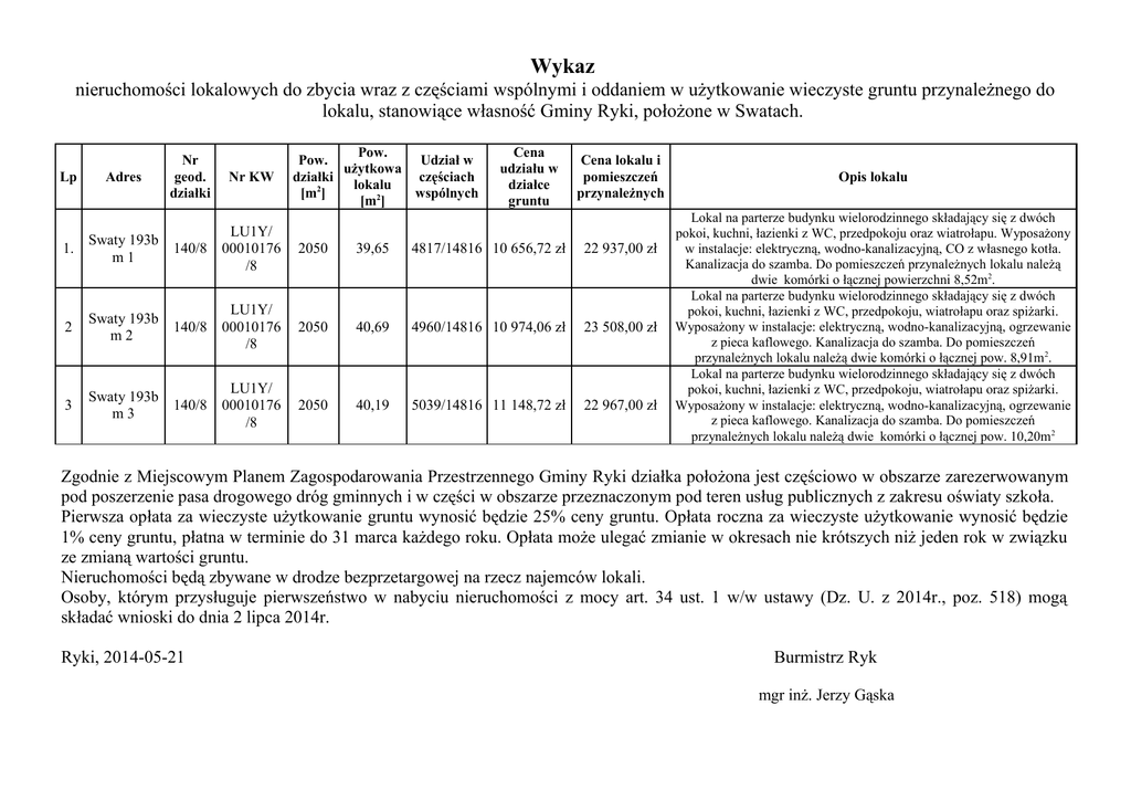 Wykaz nieruchomości lokalowych do zbycia wraz z częściami wspólnymi i oddaniem w użytkowanie wieczyste gruntu przynależnego do lokalu, stanowiące własność Gminy Ryki, położone w Swatach. Lp Adres Pow. Pow. Udział w użytkowa działki częściach lokalu [m2] wspólnych [m2] Cena udziału w działce gruntu Nr geod. działki Nr KW Cena lokalu i pomieszczeń przynależnych 2050 39,65 4817/14816 10 656,72 zł 22 937,00 zł 1. Swaty 193b m1 140/8 LU1Y/ 00010176 /8 2 Swaty 193b m2 140/8 LU1Y/ 00010176 /8 2050 40,69 4960/14816 10 974,06 zł 23 508,00 zł 3 Swaty 193b m3 140/8 LU1Y/ 00010176 /8 2050 40,19 5039/14816 11 148,72 zł 22 967,00 zł Opis lokalu Lokal na parterze budynku wielorodzinnego składający się z dwóch pokoi, kuchni, łazienki z WC, przedpokoju oraz wiatrołapu. Wyposażony w instalacje: elektryczną, wodno-kanalizacyjną, CO z własnego kotła. Kanalizacja do szamba. Do pomieszczeń przynależnych lokalu należą dwie komórki o łącznej powierzchni 8,52m2. Lokal na parterze budynku wielorodzinnego składający się z dwóch pokoi, kuchni, łazienki z WC, przedpokoju, wiatrołapu oraz spiżarki. Wyposażony w instalacje: elektryczną, wodno-kanalizacyjną, ogrzewanie z pieca kaflowego. Kanalizacja do szamba. Do pomieszczeń przynależnych lokalu należą dwie komórki o łącznej pow. 8,91m2. Lokal na parterze budynku wielorodzinnego składający się z dwóch pokoi, kuchni, łazienki z WC, przedpokoju, wiatrołapu oraz spiżarki. Wyposażony w instalacje: elektryczną, wodno-kanalizacyjną, ogrzewanie z pieca kaflowego. Kanalizacja do szamba. Do pomieszczeń przynależnych lokalu należą dwie komórki o łącznej pow. 10,20m2 Zgodnie z Miejscowym Planem Zagospodarowania Przestrzennego Gminy Ryki działka położona jest częściowo w obszarze zarezerwowanym pod poszerzenie pasa drogowego dróg gminnych i w części w obszarze przeznaczonym pod teren usług publicznych z zakresu oświaty szkoła. Pierwsza opłata za wieczyste użytkowanie gruntu wynosić będzie 25% ceny gruntu. Opłata roczna za wieczyste użytkowanie wynosić będzie 1% ceny gruntu, płatna w terminie do 31 marca każdego roku. Opłata może ulegać zmianie w okresach nie krótszych niż jeden rok w związku ze zmianą wartości gruntu. Nieruchomości będą zbywane w drodze bezprzetargowej na rzecz najemców lokali. Osoby, którym przysługuje pierwszeństwo w nabyciu nieruchomości z mocy art. 34 ust. 1 w/w ustawy (Dz. U. z 2014r., poz. 518) mogą składać wnioski do dnia 2 lipca 2014r. Ryki, 2014-05-21 Burmistrz Ryk mgr inż. Jerzy Gąska