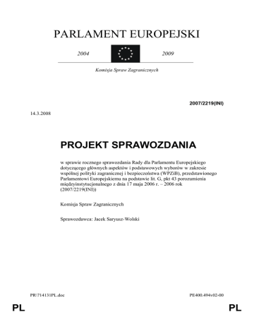 PARLAMENT EUROPEJSKI 2004 2009 Komisja Spraw Zagranicznych 2007/2219(INI) 14.3.2008 PROJEKT SPRAWOZDANIA w sprawie rocznego sprawozdania Rady dla Parlamentu Europejskiego dotyczącego głównych aspektów i podstawowych wyborów w zakresie wspólnej polityki zagranicznej i bezpieczeństwa (WPZiB), przedstawionego Parlamentowi Europejskiemu na podstawie lit. G, pkt 43 porozumienia międzyinstytucjonalnego z dnia 17 maja 2006 r. – 2006 rok (2007/2219(INI)) Komisja Spraw Zagranicznych Sprawozdawca: Jacek Saryusz-Wolski PR\714131PL.doc PL PE400.494v02-00 PL PR_INI_art112-1 SPIS TREŚCI Strona PROJEKT REZOLUCJI PARLAMENTU EUROPEJSKIEGO ..............................................3 PE400.494v02-00 PL 2/14 PR\714131PL.doc PROJEKT REZOLUCJI PARLAMENTU EUROPEJSKIEGO w sprawie rocznego sprawozdania Rady dla Parlamentu Europejskiego dotyczącego głównych aspektów i podstawowych wyborów w zakresie wspólnej polityki zagranicznej i bezpieczeństwa (WPZiB), przedstawionego Parlamentowi Europejskiemu na podstawie lit. G, pkt 43 porozumienia międzyinstytucjonalnego z dnia 17 maja 2006 r. – 2006 rok (2007/2219(INI)) Parlament Europejski, – uwzględniając roczne sprawozdanie Rady dla Parlamentu Europejskiego dotyczące głównych aspektów i podstawowych wyborów w zakresie wspólnej polityki zagranicznej i bezpieczeństwa (WPZiB), przedstawione Parlamentowi Europejskiemu w ramach zastosowania lit. G, pkt 43 porozumienia międzyinstytucjonalnego z dnia 17 maja 2006 r. – 2006 rok, – uwzględniając art. 21 traktatu UE, – uwzględniając Traktat zmieniający Traktat o Unii Europejskiej oraz Traktat ustanawiający Wspólnotę Europejską (traktat z Lizbony), podpisany w Lizbonie w dniu 13 grudnia 2007 r. oraz Kartę praw podstawowych Unii Europejskiej proklamowaną 12 grudnia 2007 r., – uwzględniając europejską strategię bezpieczeństwa (ESS) przyjętą przez Radę Europejską 12 grudnia 2003 r., – uwzględniając Porozumienie międzyinstytucjonalne z dnia 17 maja 2006 r. w sprawie dyscypliny budżetowej i należytego zarządzania finansami1, – uwzględniając konkluzje prezydencji z posiedzenia Rady Europejskiej w Brukseli w dniu 14 grudnia 2007 r. oraz jej wezwanie do szybkiego zakończenia krajowych procesów ratyfikacyjnych, tak aby traktat z Lizbony wszedł w życie w dniu 1 stycznia 2009 r., – uwzględniając konkluzje prezydencji z posiedzenia Rady Europejskiej w Brukseli w dniu 16 grudnia 2005 r. w sprawie perspektywy finansowej na lata 2007–2013, – uwzględniając własną rezolucję z dnia 20 lutego 2008 r. w sprawie traktatu z Lizbony2, – uwzględniając własną rezolucję z dnia 23 maja 2007 r. w sprawie wspólnej polityki zagranicznej i bezpieczeństwa w roku 20053, – uwzględniając własną rezolucję z dnia 16 listopada 2006 r. w sprawie wdrożenia europejskiej strategii bezpieczeństwa w kontekście europejskiej polityki bezpieczeństwa 1 Dz.U. C 139 z 14.6.2006, str. 1. Teksty przyjęte, P6_TA(2008)0055. 3 Teksty przyjęte, P6_TA (2007)0205. 2 PR\714131PL.doc 3/14 PE400.494v02-00 PL i obrony (EPBiO)1, – uwzględniając swoją rezolucję z dnia 16 lutego 2006 r. w sprawie nowego instrumentu finansowego na rzecz rozwoju w związku z celami milenijnymi2, – uwzględniając własne rezolucje z dnia 10 maja i 14 listopada 2007 r. w sprawie szczytów UE–Rosja3 oraz z dnia 19 czerwca 2007 r. w sprawie stosunków gospodarczych i handlowych UE z Rosją4, – uwzględniając własne rezolucje z dnia 1 czerwca 2006 r. w sprawie poprawy stosunków UE–USA w ramach porozumienia o partnerstwie transatlantyckim oraz w sprawie transatlantyckich stosunków gospodarczych między UE a Stanami Zjednoczonymi5, – uwzględniając własną rezolucję z dnia 12 lipca 2007 r. w sprawie Bliskiego Wschodu6, – uwzględniając własną rezolucję z dnia 13 grudnia 2007 r. w sprawie szczytu UE–Chiny oraz prowadzonego między UE a Chinami dialogu dotyczącego praw człowieka7, – uwzględniając własną rezolucję z dnia 25 października 2007 r. w sprawie stosunków między UE a Afryką8 oraz rezolucję z dnia 10 maja 2007 r. w sprawie partnerstwa UE w Rogu Afryki9, – uwzględniając własną rezolucję z dnia 10 maja 2007 r. w sprawie strategii UE dotyczącej reform w świecie arabskim10, – uwzględniając własną rezolucję z dnia 27 kwietnia 2006 r. w sprawie silniejszego partnerstwa między Unią Europejską a Ameryką Łacińską11, – uwzględniając własną rezolucję z dnia 10 marca 2005 r. w sprawie przeglądu traktatu o nierozprzestrzenianiu broni masowej zagłady – broń nuklearna w Korei Północnej i w Iranie12, potwierdzającą, że UE będzie przestrzegać zasady udostępniania środków finansowych tylko w zamian za ustępstwa (no say, no pay) w kontaktach z Półwyspem Koreańskim; uwzględniając swoją rezolucję z dnia 25 października 2007 r. w sprawie Iranu13, – uwzględniając własną rezolucję z dnia 25 października 2007 r. w sprawie specjalnych 1 Dz.U. C 314 E z 21.12.2006, str. 334. Dz.U. C 290 E z 29.11.2006, str. 396. 3 Teksty przyjęte P6_TA(2007)0178 i teksty przyjęte P6_TA(2007)0528. 4 Teksty przyjęte, P6_TA (2007)0262. 5 Dz.U. C 298 E z 8.12.2006, str. 226 i 235. 6 Teksty przyjęte, P6_TA (2007)0350. 7 Teksty przyjęte, P6_TA (2007)0622. 8 Teksty przyjęte, P6_TA(2007)0483. 9 Teksty przyjęte, P6_TA(2007)0180. 10 Teksty przyjęte, P6_TA (2007)0179. 11 Dz.U. C 296 E z 6.12.2006, str. 123. 12 Dz.U. C 320 E z 15.12.2005, str. 253. 13 Teksty przyjęte, P6_TA (2007)0488. 2 PE400.494v02-00 PL 4/14 PR\714131PL.doc środków dla Iraku na rok 20071, – uwzględniając własną rezolucję z dnia 26 września 2007 r. w sprawie wspólnej europejskiej polityki zagranicznej w dziedzinie energetyki2, – uwzględniając własne rezolucje z dnia 15 listopada 2007 r. w sprawie konferencji na Bali dotyczącej zmian klimatycznych oraz z dnia 29 listopada 2007 r. w sprawie handlu i zmian klimatycznych3, – uwzględniając własną rezoluc