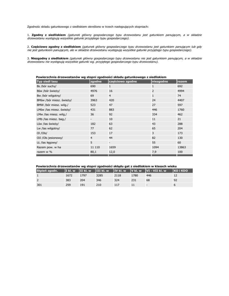 Zgodnośc składu gatunkowego z siedliskiem określono w trzech następujących stopniach: 1. Zgodny z siedliskiem (gatunek główny gospodarczego typu drzewostanu jest gatunkiem panującym, a w składzie drzewostanu występują wszystkie gatunki przyjętego typu gospodarczego). 2. Częściowo zgodny z siedliskiem (gatunek główny gospodarczego typu drzewostanu jest gatunkiem panującym lub gdy nie jest gatunkiem panującym, ale w składzie drzewostanu występują wszystkie gatunki przyjętego typu gospodarczego). 3. Niezgodny z siedliskiem (gatunek główny gospodarczego typu drzewostanu nie jest gatunkiem panującym, a w składzie drzewostanu nie występują wszystkie gatunki wg. przyjętego gospodarczego typu drzewostanu). Powierzchnia drzewostanów wg stopni zgodności składu gatunkowego z siedliskiem Typ siedl lasu zgodne częściowo zgodne niezgodne razem Bs /bór suchy/ 690 1 1 692 Bśw /bór świeży/ 4976 16 2 4994 Bw /bór wilgotny/ 69 4 1 74 BMśw /bór miesz. świeży/ 3963 420 24 4407 BMW /bór miesz. wilg./ 523 47 27 597 LMśw /las miesz. świeży/ 431 883 446 1760 LMw /las miesz. wilg./ 36 92 334 462 LMb /las miesz. bag./ - 10 11 21 Lśw /las świeży/ 182 63 43 288 Lw /las wilgotny/ 77 62 65 204 Ol /Ols/ 153 17 3 173 OlJ /Ols jesionowy/ 4 44 82 130 LŁ /las łęgowy/ 5 - 55 60 Razem pow. w ha 11 110 1659 1094 13863 razem w % 80,1 12,0 7,9 100 Powierzchnia drzewostanów wg stopni zgodności skłądu gat z siedliskiem w klasach wieku Stpień zgodn. I kl. w II kl. w III kl. w IV kl. w V kl. w VI - VII kl. w KO i KDO 1 1672 1797 3285 2118 1780 446 12 2 383 204 346 324 231 68 92 301 259 191 210 117 11 - 6