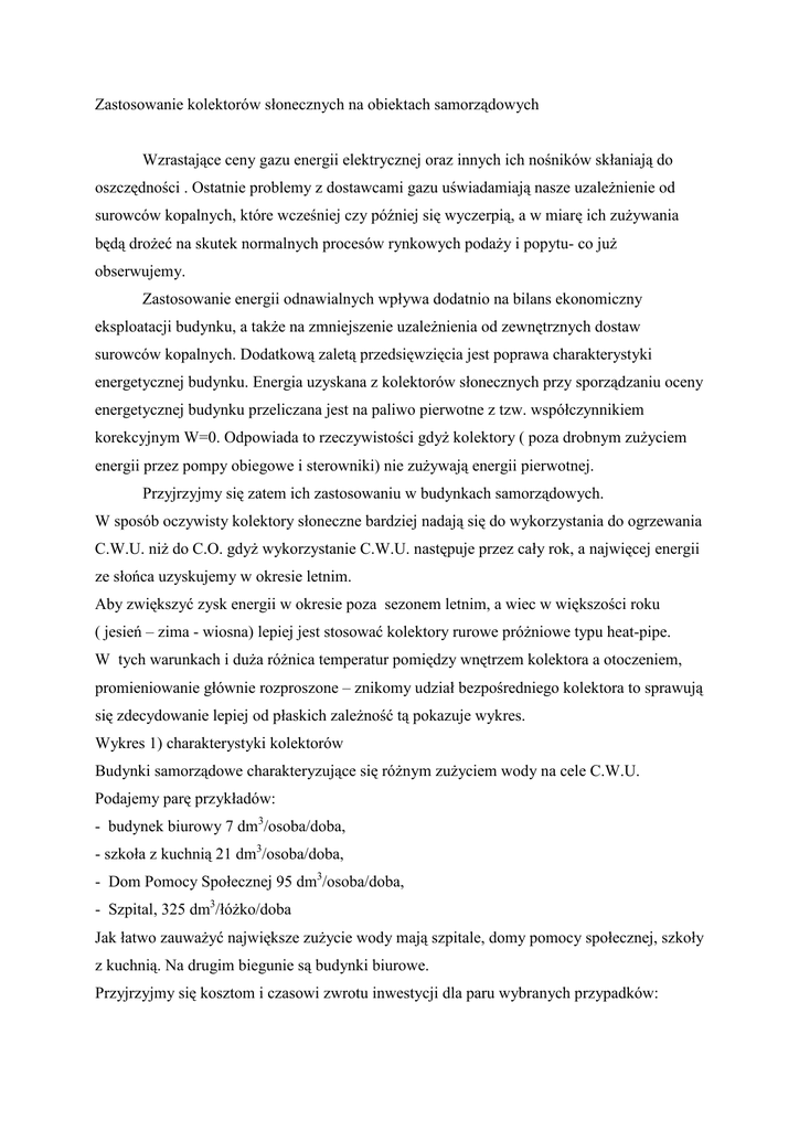 Zastosowanie kolektorów słonecznych na obiektach samorządowych Wzrastające ceny gazu energii elektrycznej oraz innych ich nośników skłaniają do oszczędności . Ostatnie problemy z dostawcami gazu uświadamiają nasze uzależnienie od surowców kopalnych, które wcześniej czy później się wyczerpią, a w miarę ich zużywania będą drożeć na skutek normalnych procesów rynkowych podaży i popytu- co już obserwujemy. Zastosowanie energii odnawialnych wpływa dodatnio na bilans ekonomiczny eksploatacji budynku, a także na zmniejszenie uzależnienia od zewnętrznych dostaw surowców kopalnych. Dodatkową zaletą przedsięwzięcia jest poprawa charakterystyki energetycznej budynku. Energia uzyskana z kolektorów słonecznych przy sporządzaniu oceny energetycznej budynku przeliczana jest na paliwo pierwotne z tzw. współczynnikiem korekcyjnym W=0. Odpowiada to rzeczywistości gdyż kolektory ( poza drobnym zużyciem energii przez pompy obiegowe i sterowniki) nie zużywają energii pierwotnej. Przyjrzyjmy się zatem ich zastosowaniu w budynkach samorządowych. W sposób oczywisty kolektory słoneczne bardziej nadają się do wykorzystania do ogrzewania C.W.U. niż do C.O. gdyż wykorzystanie C.W.U. następuje przez cały rok, a najwięcej energii ze słońca uzyskujemy w okresie letnim. Aby zwiększyć zysk energii w okresie poza sezonem letnim, a wiec w większości roku ( jesień – zima - wiosna) lepiej jest stosować kolektory rurowe próżniowe typu heat-pipe. W tych warunkach i duża różnica temperatur pomiędzy wnętrzem kolektora a otoczeniem, promieniowanie głównie rozproszone – znikomy udział bezpośredniego kolektora to sprawują się zdecydowanie lepiej od płaskich zależność tą pokazuje wykres. Wykres 1) charakterystyki kolektorów Budynki samorządowe charakteryzujące się różnym zużyciem wody na cele C.W.U. Podajemy parę przykładów: - budynek biurowy 7 dm3/osoba/doba, - szkoła z kuchnią 21 dm3/osoba/doba, - Dom Pomocy Społecznej 95 dm3/osoba/doba, - Szpital, 325 dm3/łóżko/doba Jak łatwo zauważyć największe zużycie wody mają szpitale, domy pomocy społecznej, szkoły z kuchnią. Na drugim biegunie są budynki biurowe. Przyjrzyjmy się kosztom i czasowi zwrotu inwestycji dla paru wybranych przypadków: 1. Szpital 7.2.3. Ocena i wybór przedsięwzięcia termomodernizacyjnego zapotrzebowania na ciepło na przygotowanie ciepłej wody użytkowej Dane: Qocw = 9 864,90 qocw= 0,4172 MW GJ prowadzącego do zmniejszenia udział energii słonecznej w cwu - 45,0% 3 Zużycie cwu 143 m /dobę Opis: Szpital Lp. Jedn. Stan istniejący Stan po modernizacji 1. Zapotrzebowanie ciepła na przygotowanie cwu. GJ/a 9 864,90 5426,0 2. Zapotrzebowanie mocy MW 0,4172 0,2295 Koszt przygotowania cwu zł/a 375 501 203 119 3. Oszczędność 4. Koszt modernizacji 5. SPBT zł/a 172 382 zł 1 370 000 lata 7,9 Podstawa przyjętych wartości Ncu ECO-Schubert Kraków ul. Lipowa 3 Szacunkowy koszt kompletnej instalacji cwu z kolektorów słonecznych netto 1370000 zł zbudowanych z 350 szt. kolektorów rurowych brutto 1671400 zł próżniowych KOSZT SPBT 1 370 000 zł 7,9 lat 2. Dom Pomocy Społecznej 7.2.3. Ocena i wybór przedsięwzięcia termomodernizacyjnego zapotrzebowania na ciepło na przygotowanie ciepłej wody użytkowej Dane: Qocw = zużycie cwu 386,30 GJ qocw= 0,0163 MW prowadzącego do udział energii słonecznej w cwu zmniejszenia 50,0% 5,6 m3/d Opis: Dom Pomocy Społecznej Lp. Jedn. Stan istniejący Stan po modernizacji 1. Zapotrzebowanie ciepła na przygotowanie cwu. GJ/a 386,30 194,0 2. Zapotrzebowanie mocy MW 0,0163 0,0082 3. Koszt przygotowania cwu Oszczędność 4. Koszt modernizacji 5. SPBT 31 419 zł/a 12 869 zł/a 18 551 zł 173 255 lata 9,3 Podstawa przyjętych wartości Ncu ECO-Schubert Kraków ul. Lipowa 3 Szacunkowy koszt kompletnej instalacji cuw z kolektorów słonecznych netto zbudowanych z 54 szt. kolektorów rurowych próżniowych brutto KOSZT 173255 zł 185382,9 zł SPBT 173 255 zł 9,3 lat 3. Szkoła z kuchnią 7.2.3. Ocena i wybór przedsięwzięcia termomodernizacyjnego zapotrzebowania na ciepło na przygotowanie ciepłej wody użytkowej Dane: Qocw = zużycie cwu 362,20 qocw = 0,0152 MW GJ prowadzącego do zmniejszenia udział energii słonecznej w cwu - 45,0% 5,25 m3/d Opis: Szkoła z kuchnią Lp. Jedn. Stan istniejący Stan po modernizacji 1. Zapotrzebowanie ciepła na przygotowanie cwu. GJ/a 362,20 200,0 2. Zapotrzebowanie mocy MW 0,0152 0,0084 Koszt przygotowania cwu zł/a 29 459 16 267 3. Oszczędność 4. Koszt modernizacji 5. SPBT zł/a 13 192 zł 112 523 lata 8,5 Podstawa przyjętych wartości Ncu ECO-Schubert Kraków ul. Lipowa 3 Szacunkowy koszt kompletnej instalacji cwu z kolektorów słonecznych zbudowanych z 24 kolektorów rurowych próżniowych netto brutto 112523 zł 120399,6 zł KOSZT SPBT 112 523 zł 8,5 lat 4. Przedszkole 7.2.3. Ocena i wybór przedsięwzięcia termomodernizacyjnego zapotrzebowania na ciepło na przygotowanie ciepłej wody użytkowej Dane: Qocw = zużycie cwu 65,50 qocw = 0,0026 MW GJ prowadzącego do zmniejszenia udział energii słonecznej w cwu - 50,0% 0,95 m3/d Opis: Przedszkole Lp. Jedn. Stan istniejący Stan po modernizacji 1. Zapotrzebowanie ciepła na przygotowanie cwu. GJ/a 65,50 33,0 2. Zapotrzebowanie mocy MW 0,0026 0,0013 Koszt przygotowania cwu zł/a 5 327 2 189 3. Oszczędność 4. Koszt modernizacji 5. SPBT zł/a 3 138 zł 29 550 lata 9,4 Podstawa przyjętych wartości Ncu ECO-Schubert Kraków ul. Lipowa 3 Szacunkowy koszt kompletnej instalacji cwu z kolektorów słonecznych zbudowanych z 10 szt. kolektorów rurowych próżniowych netto 29550 zł brutto KOSZT 29 550 zł 31618,5 zł SPBT 9,4 lat Jak widać każdorazowo okres zwrotu inwestycji jest krótszy niż 10 lat zatem w myśl ustawy termomodernizacyjnej montaż kolektorów słonecznych na tych obiektach jest jak najbardziej celowy. Szczególnie dużym wyzwaniem są szpitale gdzie mamy doczynienia ze sporej wielkości instalacjami 