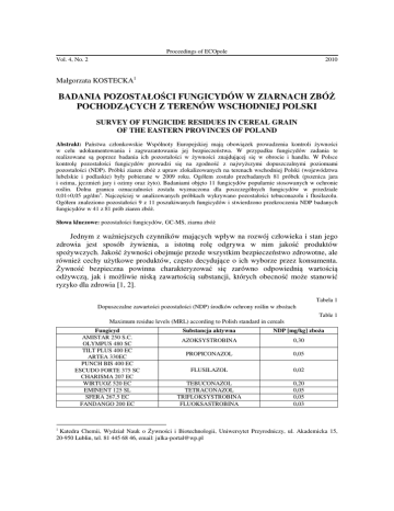 Proceedings of ECOpole Vol. 4, No. 2 2010 Małgorzata KOSTECKA1 BADANIA POZOSTAŁOŚCI FUNGICYDÓW W ZIARNACH ZBÓŻ POCHODZĄCYCH Z TERENÓW WSCHODNIEJ POLSKI SURVEY OF FUNGICIDE RESIDUES IN CEREAL GRAIN OF THE EASTERN PROVINCES OF POLAND Abstrakt: Państwa członkowskie Wspólnoty Europejskiej mają obowiązek prowadzenia kontroli żywności w celu udokumentowania i zagwarantowania jej bezpieczeństwa. W przypadku fungicydów zadania te realizowane są poprzez badania ich pozostałości w żywności znajdującej się w obrocie i handlu. W Polsce kontrolę pozostałości fungicydów prowadzi się na zgodność z najwyższymi dopuszczalnymi poziomami pozostałości (NDP). Próbki ziaren zbóż z upraw zlokalizowanych na terenach wschodniej Polski (województwa lubelskie i podlaskie) były pobierane w 2009 roku. Ogółem zostało przebadanych 81 próbek (pszenica jara i ozima, jęczmień jary i ozimy oraz żyto). Badaniami objęto 11 fungicydów popularnie stosowanych w ochronie roślin. Dolna granica oznaczalności została wyznaczona dla poszczególnych fungicydów w przedziale 0,01÷0,05 µg/dm3. Najczęściej w analizowanych próbkach wykrywano pozostałości tebuconazolu i flusilazolu. Ogółem znaleziono pozostałości 9 z 11 poszukiwanych fungicydów i stwierdzono przekroczenia NDP badanych fungicydów w 41 z 81 prób ziaren zbóż. Słowa kluczowe: pozostałości fungicydów, GC-MS, ziarna zbóż Jednym z ważniejszych czynników mających wpływ na rozwój człowieka i stan jego zdrowia jest sposób żywienia, a istotną rolę odgrywa w nim jakość produktów spożywczych. Jakość żywności obejmuje przede wszystkim bezpieczeństwo zdrowotne, ale również cechy użytkowe produktów, często decydujące o ich wyborze przez konsumenta. Żywność bezpieczna powinna charakteryzować się zarówno odpowiednią wartością odżywczą, jak i możliwie niską zawartością substancji, których obecność może stanowić ryzyko dla zdrowia [1, 2]. Tabela 1 Dopuszczalne zawartości pozostałości (NDP) środków ochrony roślin w zbożach Table 1 Maximum residue levels (MRL) according to Polish standard in cereals Fungicyd AMISTAR 250 S.C. OLYMPUS 480 SC TILT PLUS 400 EC ARTEA 330EC PUNCH BIS 400 EC ESCUDO FORTE 375 SC CHARISMA 207 EC WIRTUOZ 520 EC EMINENT 125 SL SFERA 267,5 EC FANDANGO 200 EC Substancja aktywna NDP [mg/kg] zboża AZOKSYSTROBINA 0,30 PROPICONAZOL 0,05 FLUSILAZOL 0,02 TEBUCONAZOL TETRACONAZOL TRIFLOKSYSTROBINA FLUOKSASTROBINA 0,20 0,05 0,05 0,03 1 Katedra Chemii, Wydział Nauk o Żywności i Biotechnologii, Uniwersytet Przyrodniczy, ul. Akademicka 15, 20-950 Lublin, tel. 81 445 68 46, email: [email protected] 414 Małgorzata Kostecka O przydatności ziarna zbóż do przerobu bądź spożycia decyduje jego wartość biologiczna oraz jakość handlowa. Ziarno zbóż uznawane jest za zdrowe oraz o odpowiedniej jakości handlowej, jeżeli ma typową dla danego rodzaju barwę, jest wolne od zapachów i żywych szkodników, a zawartość substancji aktywnych nie przekracza dopuszczalnych poziomów. Spośród wszystkich zanieczyszczeń typu biologicznego w żywności i paszach środki ochrony roślin, obok mikotoksyn, stanowią najbardziej niebezpieczne substancje skażające. Ich najwyższe dopuszczalne poziomy dla środków spożywczych w Polsce określa Rozporządzenie Ministra Zdrowia z dnia 16.04.2004 [3] z późniejszymi zmianami, natomiast dla pasz jest to Rozporządzenie Ministra Rolnictwa i Rozwoju Wsi z dnia 07.04.2004 [4]. Zestawienie badanych substancji aktywnych przedstawiono w tabeli 1. Metodyka badań Materiał do badań stanowiło 81 próbek ziaren zbóż pochodzących z terenów wschodniej Polski (województwa lubelskie i podlaskie). Wybrano po 5 genotypów pszenicy jarej i ozimej, 7 genotypów jęczmienia ozimego i jarego oraz 5 genotypów żyta. Materiał do badań pochodził z indywidualnych gospodarstw rolniczych oraz z Doświadczalnego Gospodarstwa w Uhninie. Zakres metody obejmował siedem substancji aktywnych, będących składnikami 11 stosowanych w uprawie zbóż fungicydów. Do oznaczania pozostałości stosowano zwalidowane metody analityczne. Metody te polegały na ekstrakcji obecnych w ziarnie substancji aktywnych rozpuszczalnikiem organicznym i dalszym oczyszczaniu za pomocą chromatografii kolumnowej. Końcowe oznaczanie wykonano za pomocą chromatografu gazowego z detektorem mas GC-MS 1200 firmy Varian. Substancje rozdzielono na kolumnie kapilarnej DB-5 MS i oznaczono w specyficznych warunkach fragmentacji MS/MS zoptymalizowanych indywidualnie dla każdej analizowanej substancji [5, 6]. Uzyskane wyniki odniesiono do najwyższych dopuszczalnych poziomów pozostałości (NDP) obowiązujących w Polsce. Wyniki W przypadku badanych ziaren zbóż pszenicy, zarówno jarej, jak i ozimej, (rys. rys. 1 i 2), niewielkie przekroczenia stwierdzono dla tebuconazolu, będącego składnikiem rzadko stosowanego fungicydu Wirtuoz 520 EC i popularnego w rolnictwie flusilazolu. Natomiast najwyższe przekroczenia i w największej liczbie próbek otrzymano dla jęczmienia jarego w 15 z 21 próbek i jęczmienia ozimego w 9 z 21 próbek ziaren (rys. rys. 3 i 4). Przekroczenia dotyczyły wszystkich badanych substancji aktywnych, ale najwyższe ilości wykryto w przypadku azoksystrobiny 0,35 mg/kg - substancji czynnej wchodzącej w skład powszechnie stosowanych w ochronie roślin Amistaru 250 SC i Olympusu 480 SC. Analizując otrzymane wyniki, stwierdzono przekroczenie dopuszczalnych poziomów pozostałości fungicydów w 41 z 81 próbek zbóż. Najmniejsze przekroczenie uzyskano dla żyta, gdzie tylko w 3 próbkach stwierdzono obecność flusilazolu (rys. 5) w stężeniu 0,028 mg/kg - substancji czynnej takich fungicydów, jak: Punch Bis 400EC, Escudo Forte 375 SC i Charisma 207 EC. Badania pozostałości fungicydów w ziarnach zbóż pochodzących z terenów wschodniej Polski 415 Rys. 1. Zawartość pozostałości fungicydów [mg/kg] (substancji aktywnych) w badan