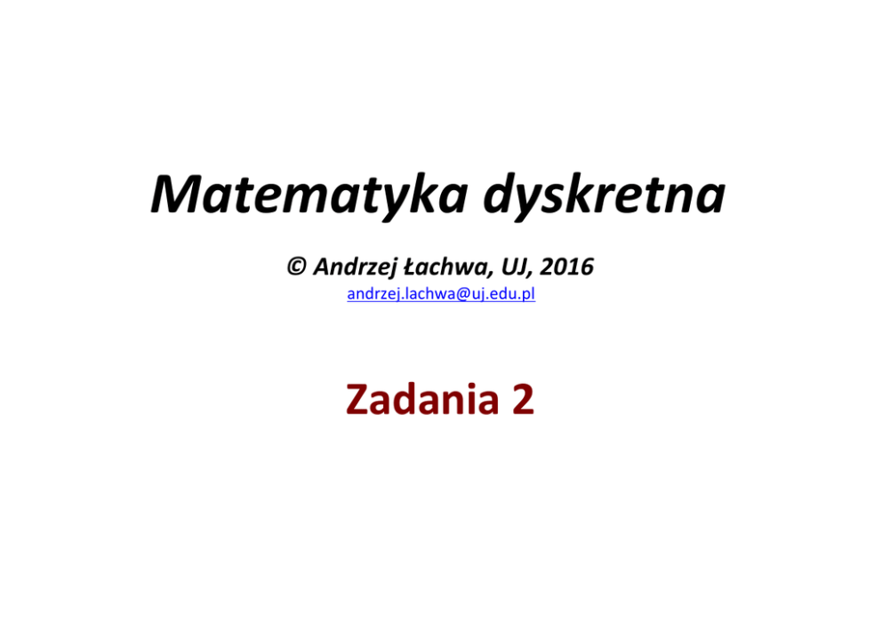 Matematyka dyskretna © Andrzej Łachwa, UJ, 2016 [email protected] Zadania 2 1. Wyznacz NWD liczby 4899 i 6396. Rozłóż te liczby na czynniki pierwsze i wyznacz NWW rozłożony na czynniki (bez wymnażania). 2. Rozłóż liczby 6399 i 4896 na czynniki pierwsze, wyznacz NWD oraz wyznacz NWW rozłożony na czynniki (bez wymnażania). 3. Przypomnij zasadę minimum. 4. Udowodnij, że 6 | 8n — 2n dla wszystkich liczb naturalnych. 5. Udowodnij, że 7 | 11n — 4n dla wszystkich liczb naturalnych. 6. Udowodnij, że 7 | 11n — 4n dla wszystkich liczb naturalnych. 7. Udowodnij, że n2 >n+1 dla wszystkich naturalnych n>1. 8. Udowodnij, że suma sześcianów kolejnych liczb naturalnych to ich kwadrat sumy: 13 + 23 + 33 + … + n3 = (1+2+3+...+n)2. 9. Mamy funkcję z dziedziny NxN w N postaci f(n,k)=min(n,k). Znajdź f —(4). 10. Pokaż, że 212-1 nie jest liczbą pierwszą i rozłóż na czynniki (wykorzystaj małe twierdzenie Fermata). 11. Pokaż, że 1020117–10201 jest podzielna przez 17 (wykorzystaj małe twierdzenie Fermata). 12. Niech A relacja w zbiorze S. Co to znaczy, że xAAAy, dla x, y Î S. 13. Czy suma dwóch relacji równoważności jest równoważnością? Odpowiedź uzasadnij. 14. Co to jest funkcja charakterystyczna zbioru A w przestrzeni S? 15. Udowodnij indukcyjnie, że 5│n5–n. 16. Udowodnij, że 10│37100–3720. 17. Udowodnij, że 10│374–1. 18. Udowodnij indukcyjnie, że 4+10+16+...+(6n-2) = n(3n+1). 19. Udowodnij indukcyjnie, że 2│n2+5n+1. 20. Udowodnij indukcyjnie, że 8│5n+1+2∙3n+1. 21. Udowodnij indukcyjnie, że 73│8n+2+92n+1. 22. Co to są liczby doskonałe? 23. Udowodnij, że jeśli A zwrotna to A∩A-1 jest tolerancją. 24. Co to jest surjekcja? 25. Rozwiąż równanie: (2x‐3)/4= (3x‐4)/5. 26. Rozwiąż równanie: (3x‐4)/5= (x‐2)/3. 27. Rozwiąż równanie: (3x‐4)/5= (2x‐1)/3. 28. Znajdź x, y takie, że ax+by=NWD(a,b), gdzie a=54, b=99. 29. Sprawdź, czy to prawda, że log 223344 < lg 234. 30. Znajdź x, y takie, że ax+by=NWD(a,b), gdzie a=136 , b=84 . 31. Ile cyfr ma liczba dziesiętna k? 32. Zdefiniuj dowolną relację spójną na zbiorze R = {0,1}4. 33. Co to jest relacja przeciwsymetryczna? 34. Udowodnij, że 2n jest O(n!). 35. Przeczytaj litery greckie 36. Ile wynosi suma wyrazów ciągu Fibonacciego od 5 do 15-tego, czyli 5+8+13+21+34+55+89+144+233+377+610 (proszę tego nie dodawać, tylko użyć wzoru)? 37. Oszacuj s20 dla ciągu zdefiniowanego rekurencyjnie: s0=7 s1=2 sn+2=sn+1+2sn dla n≥1 38. Znajdź wzór zwarty dla a0=0 a1= -10 an= -3an‒1+4an‒2 dla n>1 39. Znajdź wzór zwarty dla s0=2 s1=5 sn=5sn‒1‒6sn‒2 dla n>1 40. Policz F10 (jako funkcję liniową złotej liczby F). 41. Znajdź x, y takie, że ax+by=NWD(a,b), gdzie a=54, b=99. 42. Niech x, y dowolne liczby rzeczywiste i x<y. Ile liczb całkowitych zawiera przedział [x, y)? 43. Zgodnie z przepisami ordynacji podatkowej podstawy opodatkowania, kwoty podatków, odsetki za zwłokę i pewne inne opłaty oraz wynagrodzenia zaokrągla się do pełnych złotych w ten sposób, że końcówki kwot wynoszące mniej niż 50 groszy pomija się, a końcówki kwot wynoszące 50 i więcej groszy podwyższa się do pełnych złotych. Jeżeli wyliczona kwota podlegająca takiemu zaokrągleniu podana jest w formacie dodatniej dziesiętnej liczby rzeczywistej x, to jaki jest wzór na liczbę zaokrągloną z(x)? Użyj funkcji podłogi lub sufitu. 44. Udowodnij, że 5n4 +7n2 ‒3n ‒12 jest O(n4) 45. Co oznacza napis „5n6 + ln(n) + O(n4) = O(n6)” ?