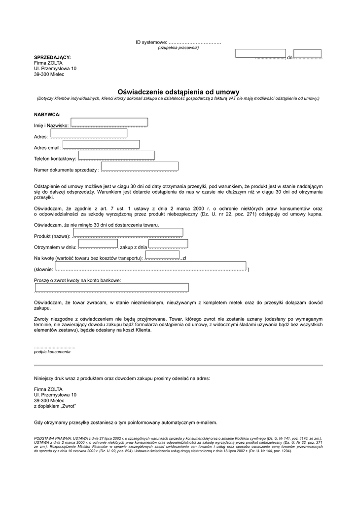 ID systemowe: …………………………… (uzupełnia pracownik) SPRZEDAJĄCY: Firma ZOLTA Ul. Przemysłowa 10 39-300 Mielec ......................, dn…................... Oświadczenie odstąpienia od umowy (Dotyczy klientów indywidualnych, klienci którzy dokonali zakupu na działalność gospodarczą z fakturą VAT nie mają możliwości odstąpienia od umowy.) NABYWCA: Imię i Nazwisko: ………………………………………… Adres: ………………………………………… Adres email: ………………………………………… Telefon kontaktowy: ………………………………………… Numer dokumentu sprzedaży : ………………………………………… Odstąpienie od umowy możliwe jest w ciągu 30 dni od daty otrzymania przesyłki, pod warunkiem, że produkt jest w stanie naddającym się do dalszej odsprzedaży. Warunkiem jest dotarcie odstąpienia do nas w czasie nie dłuższym niż w ciągu 30 dni od otrzymania przesyłki. Oświadczam, że zgodnie z art. 7 ust. 1 ustawy z dnia 2 marca 2000 r. o ochronie niektórych praw konsumentów oraz o odpowiedzialności za szkodę wyrządzoną przez produkt niebezpieczny (Dz. U. nr 22, poz. 271) odstępuję od umowy kupna. Oświadczam, że nie minęło 30 dni od dostarczenia towaru. Produkt (nazwa): …………………………………………………………… Otrzymałem w dniu: …………………… , zakup z dnia …………………… Na kwotę (wartość towaru bez kosztów transportu): ……………………zł (słownie: ………………………………………………………………………………………………………… ) Proszę o zwrot kwoty na konto bankowe: …………………………………………………………………………………… Oświadczam, że towar zwracam, w stanie niezmienionym, nieużywanym z kompletem metek oraz do przesyłki dołączam dowód zakupu. Zwroty niezgodne z oświadczeniem nie będą przyjmowane. Towar, którego zwrot nie zostanie uznany (odesłany po wymaganym terminie, nie zawierający dowodu zakupu bądź formularza odstąpienia od umowy, z widocznymi śladami używania bądź bez wszystkich elementów zestawu), będzie odesłany na koszt Klienta. ............................... podpis konsumenta Niniejszy druk wraz z produktem oraz dowodem zakupu prosimy odesłać na adres: Firma ZOLTA Ul. Przemysłowa 10 39-300 Mielec z dopiskiem „Zwrot” Gdy otrzymamy przesyłkę zostaniesz o tym poinformowany automatycznym e-mailem. PODSTAWA PRAWNA: USTAWA z dnia 27 lipca 2002 r. o szczególnych warunkach sprzeda y konsumenckiej oraz o zmianie Kodeksu cywilnego (Dz. U. Nr 141, poz. 1176, ze zm.). USTAWA z dnia 2 marca 2000 r. o ochronie niektórych praw konsumentów oraz odpowiedzialności za szkodę wyrządzoną przez prodkut niebezpieczny (Dz. U. Nr 22, poz. 271 ze zm.). Rozporządzenie Ministra Finansów w sprawie szczegółowych zasad uwidaczniania cen towarów i usług oraz sposobu oznaczania ceną towarów przeznaczonych do sprzeda ży z dnia 10 czerwca 2002 r. (Dz. U. 99, poz. 894). Ustawa o świadczeniu usług drogą elektroniczną z dnia 18 lipca 2002 r. (Dz. U. Nr 144, poz. 1204).