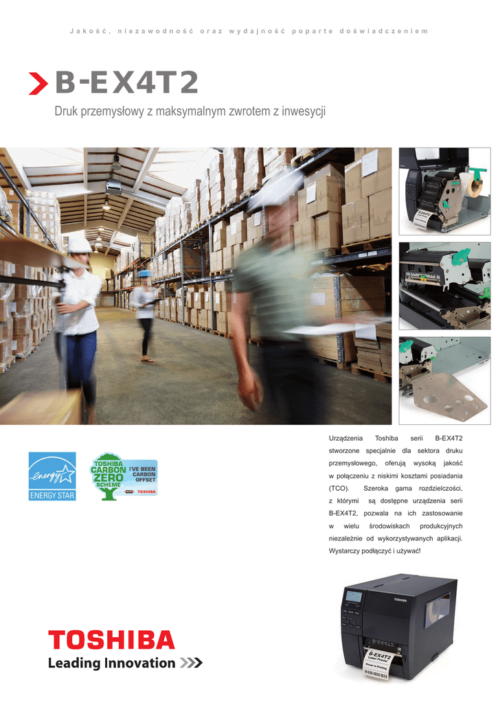 Jakość, ni ezaw odność or a z wy d a jn o ś ć p o p a rte d o ś wia d c ze n ie m B -EX4T2 Druk przemysłowy z maksymalnym zwrotem z inwesycji Urządzenia Toshiba serii B-EX4T2 stworzone specjalnie dla sektora druku przemysłowego, oferują wysoką jakość w połączeniu z niskimi kosztami posiadania (TCO). z którymi Szeroka gama rozdzielczości, są dostępne urządzenia serii B-EX4T2, pozwala na ich zastosowanie w wielu środowiskach produkcyjnych niezależnie od wykorzystywanych aplikacji. Wystarczy podłączyć i używać! B -EX4T2 KOMPATYBILNOŚĆ Seria urządzeń B-EX4T2 została zaprojektowana tak, by móc łatwo zastępować urządzenia konkurencji. Jest to możliwe dzięki takim funkcjom i parametrom jak emulacja Z-Mode, prowadzenie mediów z wyrównaniem do lewej, szeroka gama taśm termotransferowych czy też zastosowanie głowic płaskich. KORZYŚCI DLA KLIENTA WYDAJNOŚĆ • Niski koszt druku przemysłowego Urządzenia B-EX4T2 o szerokości zadruku 4 cali to typowe rozwiązanie dla druku przemysłowego. Oferują prędkość 12 cali/ sek., łącząc wydajność z wysoką przepustowością przetwarzania danych. • Pozytywny aspekt ekonomiczny przy podmianie urządzeń konkurencji TAŚMA & MEDIA Urządzenie pozwala na wykorzystanie taśmy termotransferowej nawijanej zarówno stroną barwiącą do wewnątrz jak i na zewnątrz, przez co gwarantuje szeroką kompatybilność z materiałami eksploatacyjnymi różnych dostawców. Dodatkowo, zastosowanie podawania mediów z wyrównaniem do lewej w drukarce gwarantuje niezwykle szeroką kompatybilność z dowolnymi środowiskami druku. Aby uprościć obsługę oraz zmniejszyć koszty posiadania, urządzenie obsługuje taśmy termotransferowe o długości nawet do 800m. ŁATWOŚĆ OBSŁUGI Zastosowanie układu dwóch silników do kontroli przesuwu taśmy termotransferowej (silnik nawijający oraz napinający), montaż głowicy bez narzędzi specjalistycznych oraz łatwe dokładanie opcji to unikatowe funkcje urządzeń serii B-EX4T2 minimalizujące koszty obsługi. OCHRONA ŚRODOWISKA Toshiba jest zobowiązana do projektowania i wytwarzania produktów, które w znacznym stopniu eliminują negatywny wpływ na środowisko oraz spełniają standardy wymagane przez przemysł. Spełnienie szeregu norm, w tym Energy Star, uczestnictwo w programie offsetu CO2 “Carbon Zero”, wykorzystywanie bezrozpuszczalnikowych barwników w taśmach termotransferowych oraz minimalny pobór mocy, to kluczowe rozwiązania zastosowane w urządzeniu B-EX4T2 by chronić środowisko naturalne. DRUK SPECJALIZOWANY Urządzenia serii B-EX4T2 są dostępne zarówno z głowicami o rozdzielczości 203/300 dpi jak i z 600dpi, co pozwala na spełnienie wymagań dla każdej jakości druku. • Głowica płaska zgodna ze standardami konkurencji • Wysoka wydajność oraz przepustowość przetwarzanych danych w połączeniu z wysokimi wartościami parametrów specyfikacyjnych • Szeroki zakres obsługiwanych mediów • Najdłuższe taśmy termotransferowe na rynku (800m) • Porty USB i Ethernet w standardzie; w opcji porty: szeregowy, równoległy, USB oraz WLAN • Szeroki zakres emulacji pozwalający na łatwą podmianę urządzeń konkurencji B-EX4T2 SPECYFIKACJA Typ głowicy Wymiary Interfejsy Opcjonalne interfejsy Wspierane protokoły DRUKOWANIE Technologia druku B-EX4T2 GS/TS B-EX4T2 HS Płaska 310(wys.) x 278(szer.) x 460(głęb.) mm USB 2.0, Ethernet Równoległy, szeregowy, moduł WIFI, RTC & USB host SNMP Termiczna / Termotransferowa Szerokość druku 104 mm Prędkość (maks.) 12 cali/sek. (304 mm/sek.) 6 cali/sek. (152 mm/sek.) Rozdzielczość 203dpi/300dpi 600dpi Czcionki Obsługiwane kody MEDIA Bitmapowe oraz wektorowe Wsparcie dla kodów kompatybilnych z GS1 DataBar (RSS) Szerokość maksymalna 114 mm Prowadzenie materiału Wyrównanie do lewej Średnica zewnętrzna rolki papieru Standardowa długość taśmy 200 mm 450m, 600m, 800m** OPCJE Nóż, moduł odklejania i wewnętrzny nawijak **specjalna taśma TOSHIBA TEC POLAND S.A. UL. MINERALNA 15A, 02-274 WARSZAWA TEL. +48 22 53 60 600 FAX +48 22 831 73 79 I N F O @ T O S H I B A T E C - T T P. C O M W W W . T O S H I B A T E C - T T P. C O M Dane techniczne mogą ulec zmianie bez wcześniejszego powiadomienia. Wszystkie nazwy firm i/lub produktów są znakami towarowymi i/lub zastrzeżonymi znakami towarowymi odpowiednich producentów na poszczególnych rynkach i/lub krajach. Wszelkie prawa zastrzeżone. Nieustannie staramy się dostarczać najnowsze wersje danych do naszych partnerów. Specyfikacje dla niektórych modeli mogą się zmienić w czasie pomiędzy produkcją i wydaniem tej dokumentacji. Specyfikacje dotyczące produktywności i pojemności papieru są przygotowane w oparciu o rozmiaru papieru A4 i gramaturę 80g/m2, o ile nie zaznaczono inaczej. Copyright © 2015 TOSHIBA TEC POLAND S.A.