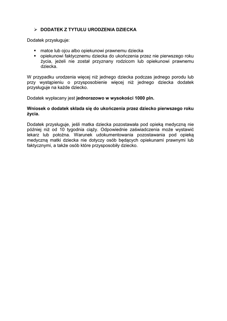 DODATEK Z TYTUŁU URODZENIA DZIECKA Dodatek przysługuje: matce lub ojcu albo opiekunowi prawnemu dziecka opiekunowi faktycznemu dziecka do ukończenia przez nie pierwszego roku życia, jeżeli nie został przyznany rodzicom lub opiekunowi prawnemu dziecka. W przypadku urodzenia więcej niż jednego dziecka podczas jednego porodu lub przy wystąpieniu o przysposobienie więcej niż jednego dziecka dodatek przysługuje na każde dziecko. Dodatek wypłacany jest jednorazowo w wysokości 1000 pln. Wniosek o dodatek składa się do ukończenia przez dziecko pierwszego roku życia. Dodatek przysługuje, jeśli matka dziecka pozostawała pod opieką medyczną nie później niż od 10 tygodnia ciąży. Odpowiednie zaświadczenia może wystawić lekarz lub położna. Warunek udokumentowania pozostawania pod opieką medyczną matki dziecka nie dotyczy osób będących opiekunami prawnymi lub faktycznymi, a także osób które przysposobiły dziecko.
