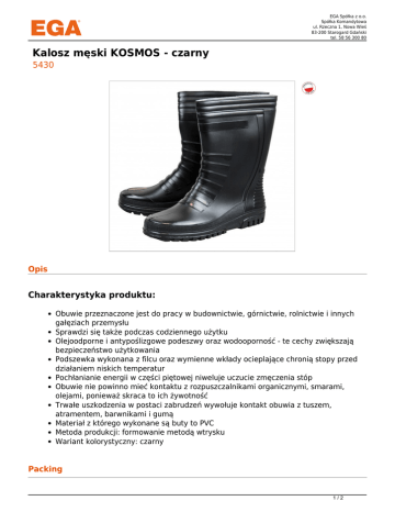 EGA Spółka z o.o. Spółka Komandytowa ul. Rzeczna 1, Nowa Wieś 83-200 Starogard Gdański tel. 58 56 300 80 Kalosz męski KOSMOS - czarny 5430 Opis Charakterystyka produktu: Obuwie przeznaczone jest do pracy w budownictwie, górnictwie, rolnictwie i innych gałęziach przemysłu Sprawdzi się także podczas codziennego użytku Olejoodporne i antypoślizgowe podeszwy oraz wodooporność - te cechy zwiększają bezpieczeństwo użytkowania Podszewka wykonana z filcu oraz wymienne wkłady ocieplające chronią stopy przed działaniem niskich temperatur Pochłanianie energii w części piętowej niweluje uczucie zmęczenia stóp Obuwie nie powinno mieć kontaktu z rozpuszczalnikami organicznymi, smarami, olejami, ponieważ skraca to ich żywotność Trwałe uszkodzenia w postaci zabrudzeń wywołuje kontakt obuwia z tuszem, atramentem, barwnikami i gumą Materiał z którego wykonane są buty to PVC Metoda produkcji: formowanie metodą wtrysku Wariant kolorystyczny: czarny Packing 1/2 EGA Spółka z o.o. Spółka Komandytowa ul. Rzeczna 1, Nowa Wieś 83-200 Starogard Gdański tel. 58 56 300 80 Unit Cardboard box: 2 szt. Variants No. Catalog no. EAN Rozmiar 1 5430 42 2 5431 44 3 5432 45 2/2 Powered by TCPDF (www.tcpdf.org)