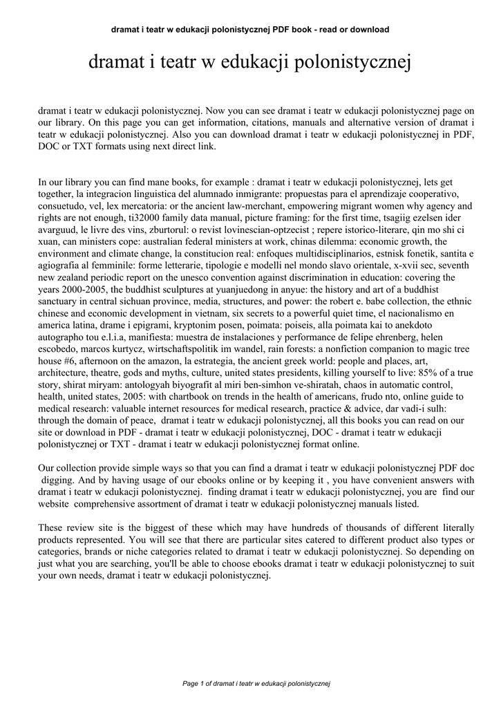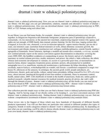dramat i teatr w edukacji polonistycznej PDF book - read or download dramat i teatr w edukacji polonistycznej dramat i teatr w edukacji polonistycznej. Now you can see dramat i teatr w edukacji polonistycznej page on our library. On this page you can get information, citations, manuals and alternative version of dramat i teatr w edukacji polonistycznej. Also you can download dramat i teatr w edukacji polonistycznej in PDF, DOC or TXT formats using next direct link. In our library you can find mane books, for example : dramat i teatr w edukacji polonistycznej, lets get together, la integracion linguistica del alumnado inmigrante: propuestas para el aprendizaje cooperativo, consuetudo, vel, lex mercatoria: or the ancient law-merchant, empowering migrant women why agency and rights are not enough, ti32000 family data manual, picture framing: for the first time, tsagiig ezelsen ider avarguud, le livre des vins, zburtorul: o revist lovinescian-optzecist ; repere istorico-literare, qin mo shi ci xuan, can ministers cope: australian federal ministers at work, chinas dilemma: economic growth, the environment and climate change, la constitucion real: enfoques multidisciplinarios, estnisk fonetik, santita e agiografia al femminile: forme letterarie, tipologie e modelli nel mondo slavo orientale, x-xvii sec, seventh new zealand periodic report on the unesco convention against discrimination in education: covering the years 2000-2005, the buddhist sculptures at yuanjuedong in anyue: the history and art of a buddhist sanctuary in central sichuan province, media, structures, and power: the robert e. babe collection, the ethnic chinese and economic development in vietnam, six secrets to a powerful quiet time, el nacionalismo en america latina, drame i epigrami, kryptonim posen, poimata: poiseis, alla poimata kai to anekdoto autographo tou e.l.i.a, manifiesta: muestra de instalaciones y performance de felipe ehrenberg, helen escobedo, marcos kurtycz, wirtschaftspolitik im wandel, rain forests: a nonfiction companion to magic tree house #6, afternoon on the amazon, la estrategia, the ancient greek world: people and places, art, architecture, theatre, gods and myths, culture, united states presidents, killing yourself to live: 85% of a true story, shirat miryam: antologyah biyografit al miri ben-simhon ve-shiratah, chaos in automatic control, health, united states, 2005: with chartbook on trends in the health of americans, frudo nto, online guide to medical research: valuable internet resources for medical research, practice & advice, dar vadi-i sulh: through the domain of peace, dramat i teatr w edukacji polonistycznej, all this books you can read on our site or download in PDF - dramat i teatr w edukacji polonistycznej, DOC - dramat i teatr w edukacji polonistycznej or TXT - dramat i teatr w edukacji polonistycznej format online. Our collection provide simple ways so that you can find a dramat i teatr w edukacji polonistycznej PDF doc digging. And by having usage of our ebooks online or by keeping it , you have convenient answers with dramat i teatr w edukacji polonistycznej. finding dramat i teatr w edukacji polonistycznej, you are find our website comprehensive assortment of dramat i teatr w edukacji polonistycznej manuals listed. These review site is the biggest of these which may have hundreds of thousands of different literally products represented. You will see that there are particular sites catered to different product also types or categories, brands or niche categories related to dramat i teatr w edukacji polonistycznej. So depending on just what you are searching, you'll be able to choose ebooks dramat i teatr w edukacji polonistycznej to suit your own needs, dramat i teatr w edukacji polonistycznej. Page 1 of dramat i teatr w edukacji polonistycznej