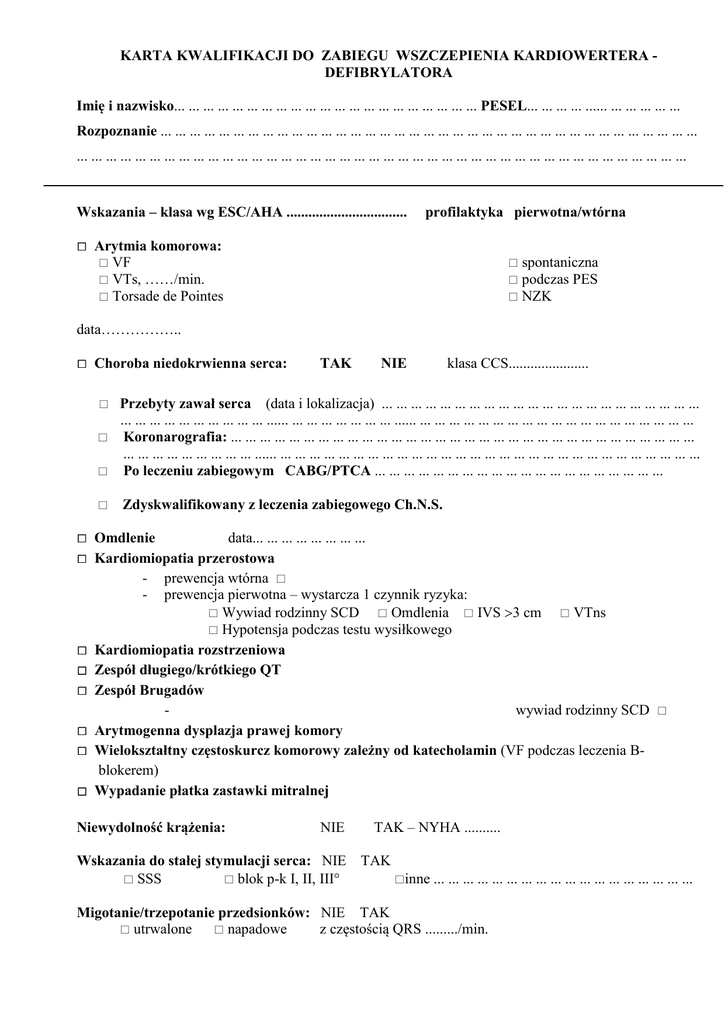 KARTA KWALIFIKACJI DO ZABIEGU WSZCZEPIENIA KARDIOWERTERA DEFIBRYLATORA Imię i nazwisko... ... ... ... ... ... ... ... ... ... ... ... ... ... ... ... ... ... ... ... ... PESEL... ... ... ... ...... ... ... ... ... ... Rozpoznanie ... ... ... ... ... ... ... ... ... ... ... ... ... ... ... ... ... ... ... ... ... ... ... ... ... ... ... ... ... ... ... ... ... ... ... ... ... ... ... ... ... ... ... ... ... ... ... ... ... ... ... ... ... ... ... ... ... ... ... ... ... ... ... ... ... ... ... ... ... ... ... ... ... ... ... ... ... ... ... Wskazania – klasa wg ESC/AHA ................................. profilaktyka pierwotna/wtórna Arytmia komorowa: VF VTs, ……/min. Torsade de Pointes spontaniczna podczas PES NZK data…………….. Choroba niedokrwienna serca: TAK NIE klasa CCS...................... Przebyty zawał serca (data i lokalizacja) ... ... ... ... ... ... ... ... ... ... ... ... ... ... ... ... ... ... ... ... ... ... ... ... ... ... ... ... ... ... ... ... ...... ... ... ... ... ... ... ... ...... ... ... ... ... ... ... ... ... ... ... ... ... ... ... ... ... ... ... ... Koronarografia: ... ... ... ... ... ... ... ... ... ... ... ... ... ... ... ... ... ... ... ... ... ... ... ... ... ... ... ... ... ... ... ... ... ... ... ... ... ... ... ... ... ...... ... ... ... ... ... ... ... ... ... ... ... ... ... ... ... ... ... ... ... ... ... ... ... ... ... ... ... ... ... Po leczeniu zabiegowym CABG/PTCA ... ... ... ... ... ... ... ... ... ... ... ... ... ... ... ... ... ... ... ... Zdyskwalifikowany z leczenia zabiegowego Ch.N.S. Omdlenie data... ... ... ... ... ... ... ... Kardiomiopatia przerostowa - prewencja wtórna - prewencja pierwotna – wystarcza 1 czynnik ryzyka: Wywiad rodzinny SCD Omdlenia IVS >3 cm VTns Hypotensja podczas testu wysiłkowego Kardiomiopatia rozstrzeniowa Zespół długiego/krótkiego QT Zespół Brugadów wywiad rodzinny SCD Arytmogenna dysplazja prawej komory Wielokształtny częstoskurcz komorowy zależny od katecholamin (VF podczas leczenia Bblokerem) Wypadanie płatka zastawki mitralnej Niewydolność krążenia: NIE TAK – NYHA .......... Wskazania do stałej stymulacji serca: NIE TAK SSS blok p-k I, II, III° inne ... ... ... ... ... ... ... ... ... ... ... ... ... ... ... ... ... ... Migotanie/trzepotanie przedsionków: NIE TAK utrwalone napadowe z częstością QRS ........./min. Imię i nazwisko:................................................................ ECHO: LK ........ mm EF ....... % PK........mm zaburzenia kurczliwości uogólnione/odcinkowe PP........mm RVSP......... mmHg Szerokość zatoki wieńcowej ………….Inne nieprawidłowości ... ... ... ... ... ... ... ... ... ... ... ... ... ... ... ... ... ... ... ... ... ... ... ... ... ... ... ... ... ... ... ... ... ... ... ... ... ... ... ... ... ... ... ... ... ... ... ... ... ... ... ... ... ... ... ... ... ... ... EKG: ... ... ... ... ... ... ... ... ... ... ... ... ... ... ... ... ... ... ... ... ... ... ... ... ... ... ... ... ... ... ... ... ... ... ... ... ... ... ... ... ... ... ... ... ... ... ... ... ... ... ... ... ... ... ... ... ... ... ... ... ... ... ... ... ... ... ... ... ... ... ... ... ... ... ... ... ... ... ... ... ... .. Przebyte operacje kardiochirurgiczne: NIE TAK: data... ... ... ... ... ... ... ... ... ... ... CABG Zastawki (które? biologiczne/sztuczne?)... ... ... ... ... ... ... ... ... ... ... ... ... ... ... ... ... ... ... ... ... ... inne... ... ... ... ... ... ... ... ... ... ... ... ... ... ... ... ... ... ... ... ... ... ... ... ... ... ... ... ... ... ... ... ... ... ... ... ... Leki: B-bloker . Dawka . ACEI dawka . Furosemid, dawka Digoksyna TAK/NIE Spironolakton/eplerenon Leki przeciwpłytkowe i przeciwkrzepliwe – data odstawienia ASA ............... klopidogrel/tiklopidyna .................. heparyna drobnocząsteczkowa ………………. heparyna niefrakcjonowana ………………. acenokumarol ………………. Zmiana leczenia po zabiegu ………………………………………………………………… ICD jednojamowy / dwujamowy, szczególne wskazania: - wysokoenergetyczny tak/nie - algorytmy zapobiegające nadczułości zał. T wymaga/nie wymaga Próg defibrylacji: oznaczać / nie oznaczać Elektrody Przedsionkowa Defibrylująca aktywna aktywna/pasywna jedno-/dwukoilowa lokalizacja……………………… lokalizacja……………………… Szczepienie przeciw wzw typu B data............................ Uczulenia na kontrast/ jod w wywiadzie NIE TAK Prawo/Leworęczny W razie niedrożnej żyły podobojczykowej: urządzenie implantować po drugiej stronie odstąpić od zabiegu Pacjent został poinformowany o każdym możliwym przebiegu zabiegu: TAK NIE Pacjent/ka został/a zakwalifikowany do implantacji kardiowertera – defibrylatora serca po konsultacji z ... ... ... ... ... ... ... ... ... ... ... ... ... ... ... ... ... ... ze wskazań życiowych TAK / NIE data i podpis lekarza kierującego pieczątka ośrodka kierującego
