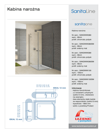 Kabina narożna Kabina narożna Nr zam.: SANOKKK080 wym.: 80cm profil: chrom/alu połysk Nr zam.: SANOKKK080SM wym.: 80cm profil: srebrny mat Nr zam.: SANOKKK090 wym.: 90cm profil: chrom/alu połysk DT2 EK 1 Achtung:Vonmin....bismax....Maßeinhalten. ZeichnungbeziehtsichaufLinksanschlag. Nr zam.: SANOKKK090SM wym.: 90cm profil: srebrny mat Attenzione:Installareentromin....emax....mm. Ildisegnoèriferitoalmontaggioportaasinistra. Let op:van....tot....maataanhouden. Detekeningheeftbetrekkingopeenlinkszijdigemontage. Attention:Fixbetweenmin....andmax....mm. Drawingindicatesleftsidehinge. Nr zam.: SANOKKK100 wym.: 100cm profil: chrom/alu połysk Attention:demin....àmax....tenirlesmesures. Ledessinconcerneunmontageinitialàgauche. Atención:Fijarentremin....ymax....mm. Eldibujofuehechoparaunasituaciónconpuertaaizquierda. Uwaga!: Nale˝y zachowaç wymiar min. ... do maks. ... . Na dolnych pokrywach zawiasa znajdujà si´ wyci´cia na uszczelk´. 750 min. 718 - max. 746 800 min. 768 - max. 796 900 min. 868 - max. 896 1000 min. 968 - max. 996 1100 min. 1068 - max. 1096 1200 min. 1168 - max. 1196 IDEAL 12 mm Informacje · kabina narożnikowa z 2 drzwiami uchylnymi (szkło 6 mm), otwierane na zewnątrz, · dwa elementy stałe każde ze wspornikiem (szkło 6 mm) · wysokość: 1950 mm · szkło z powłoką Protect DT2 K DT2 K DT2 K DT2 K DT2 K DT2 K 750 min. 718 - max. 746 800 min. 768 - max. 796 900 min. 868 - max. 896 1000 min. 968 - max. 996 1100 min. 1068 - max. 1096 1200 min. 1168 - max. 1196 DT2 E DT2 E DT2 E DT2 E DT2 E DT2 E Nr zam.: SANOKKK100SM wym.: 100cm profil: srebrny mat IDEAL 12 mm www.lazienkizpomyslem.pl