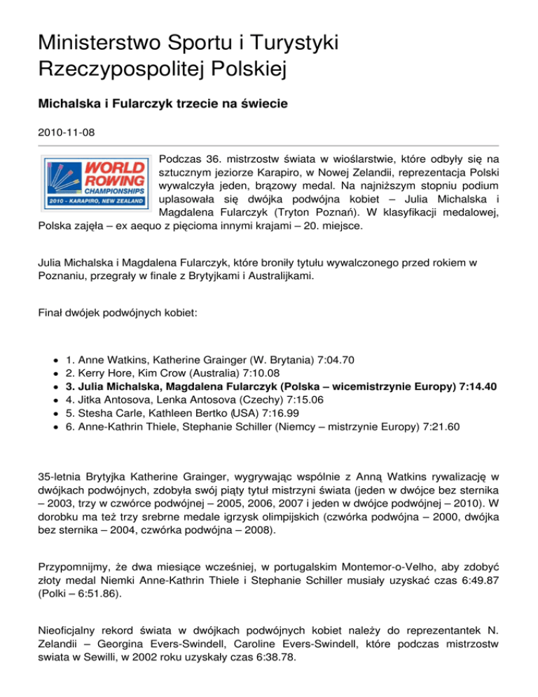 Ministerstwo Sportu i Turystyki Rzeczypospolitej Polskiej Michalska i Fularczyk trzecie na świecie 2010-11-08 Podczas 36. mistrzostw świata w wioślarstwie, które odbyły się na sztucznym jeziorze Karapiro, w Nowej Zelandii, reprezentacja Polski wywalczyła jeden, brązowy medal. Na najniższym stopniu podium uplasowała się dwójka podwójna kobiet – Julia Michalska i Magdalena Fularczyk (Tryton Poznań). W klasyfikacji medalowej, Polska zajęła – ex aequo z pięcioma innymi krajami – 20. miejsce. Julia Michalska i Magdalena Fularczyk, które broniły tytułu wywalczonego przed rokiem w Poznaniu, przegrały w finale z Brytyjkami i Australijkami. Finał dwójek podwójnych kobiet: 1. Anne Watkins, Katherine Grainger (W. Brytania) 7:04.70 2. Kerry Hore, Kim Crow (Australia) 7:10.08 3. Julia Michalska, Magdalena Fularczyk (Polska – wicemistrzynie Europy) 7:14.40 4. Jitka Antosova, Lenka Antosova (Czechy) 7:15.06 5. Stesha Carle, Kathleen Bertko (USA) 7:16.99 6. Anne-Kathrin Thiele, Stephanie Schiller (Niemcy – mistrzynie Europy) 7:21.60 35-letnia Brytyjka Katherine Grainger, wygrywając wspólnie z Anną Watkins rywalizację w dwójkach podwójnych, zdobyła swój piąty tytuł mistrzyni świata (jeden w dwójce bez sternika – 2003, trzy w czwórce podwójnej – 2005, 2006, 2007 i jeden w dwójce podwójnej – 2010). W dorobku ma też trzy srebrne medale igrzysk olimpijskich (czwórka podwójna – 2000, dwójka bez sternika – 2004, czwórka podwójna – 2008). Przypomnijmy, że dwa miesiące wcześniej, w portugalskim Montemor-o-Velho, aby zdobyć złoty medal Niemki Anne-Kathrin Thiele i Stephanie Schiller musiały uzyskać czas 6:49.87 (Polki – 6:51.86). Nieoficjalny rekord świata w dwójkach podwójnych kobiet należy do reprezentantek N. Zelandii – Georgina Evers-Swindell, Caroline Evers-Swindell, które podczas mistrzostw swiata w Sewilli, w 2002 roku uzyskały czas 6:38.78. W Karapiro, oprócz Michalskiej i Fularczyk, startowały jeszcze tylko dwie polskie osady. W finale B ósemka mężczyzn – Mikołaj Burda (RTW Lotto Bydgostia WSG-BP), Jarosław Godek (AZS AWFiS Gdańsk), Marcin Brzeziński (WTW Warszawa), Piotr Hojka, Rafał Hejmej, Michał Szpakowski, Krystian Aranowski, Piotr Juszczak i sternik Daniel Trojanowski (wszyscy Zawisza Bydgoszcz) zajęła drugie miejsce (przegrywając z Kanadyjczykami), a w dwójce podwójnej wagi lekkiej Magdalena Kemnitz (Posnania) i Agnieszka Renc (WTW Warszawa) były czwarte w finale C. Pierwszy w historii złoty medal wioślarskich mistrzostw świata dla Czech wywalczył skiffista Ondrej Synek. Klasyfikacja medalowa: 1. W. Brytania 5 złotych – 5 srebrnych – 1 brązowy; RAZEM: 11 2. Niemcy 5 złotych – 1 srebrny – 3 brązowe;RAZEM: 9 3. N. Zelandia 3 złote – 3 srebrne – 4 brązowe;RAZEM: 10 4. Francja 3 złote – 2 srebrne – 1 brązowy;RAZEM: 6 5. Kanada 2 złote – 1 srebrny – 1 brązowy;RAZEM: 4 6. Australia 1 złoty – 4 srebrne – 3 brązowe;RAZEM: 8 7. Włochy 1 złoty – 4 srebrne – 2 brązowe;RAZEM: 7 8. Ukraina 1 złoty – 2 srebrne – 0 brązowych;RAZEM: 3 9. USA 1 złoty – 1 srebrny – 2 brązowe; RAZEM: 4 10. Chorwacja 1 złoty – 0 srebrnych – 0 brązowych; RAZEM: 1 Czechy 1 złoty – 0 srebrnych – 0 brązowych; RAZEM: 1 Holandia 1 złoty – 0 srebrnych – 0 brązowych; RAZEM: 1 Hongkong 1 złoty – 0 srebrnych – 0 brązowych; RAZEM: 1 Szwecja 1 złoty – 0 srebrnych – 0 brązowych; RAZEM: 1 15. Grecja 0 złotych – 1 srebrny – 2 brązowe;RAZEM: 3 16. Białoruś 0 złotych – 1 srebrny – 0 brązowych; RAZEM: 1 Brazylia 0 złotych – 1 srebrny – 0 brązowych; RAZEM: 1 Słowacja 0 złotych – 1 srebrny – 0 brązowych; RAZEM: 1 19. Chiny 0 złotych – 0 srebrnych – 2 brązowe; RAZEM: 2 20. POLSKA 0 złotych – 0 srebrnych – 1 brązowy;RAZEM: 1 Dania 0 złotych – 0 srebrnych – 1 brązowy; RAZEM: 1 Portugalia 0 złotych – 0 srebrnych – 1 brązowy; RAZEM: 1 Rosja 0 złotych – 0 srebrnych – 1 brązowy; RAZEM: 1 Rumunia 0 złotych – 0 srebrnych – 1 brązowy; RAZEM: 1 Węgry 0 złotych – 0 srebrnych – 1 brązowy; RAZEM: 1
