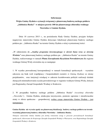 Informacja Wójta Gminy Dydnia o sytuacji związanej z planowaną budową suchego polderu „Jabłonica Ruska” w miejscu prawie 100 lat planowanego zbiornika wodnego Niewistka w Gminie Dydnia. Dnia 18 czerwca 2015 r., na posiedzeniu Rady Gminy Dydnia, przyjęto kolejne negatywne stanowisko Gminy Dydnia dotyczące lokalizacji planowanej budowy suchego polderu pn.: „Jabłonica Ruska” na terenie Gminy Dydnia o niżej wymienionej treści: „W odniesieniu do „Analizy programu inwestycyjnego w zlewni Sanu wraz ze zlewnią Wisłoka” oraz planowanej budowy suchego polderu pn.: „Jabłonica Ruska” na terenie Gminy Dydnia, realizowanego w ramach Planu Zarządzania Ryzykiem Powodziowym dla regionu wodnego Górnej Wisły stwierdza się co następuje: 1. W wyniku prowadzonej korespondencji w ramach konsultacji społecznych – wyraźnie odczuwa się brak woli współpracy i bezpośrednich rozmów (z Gminą Dydnia) ze strony projektantów, oraz instytucji wiodącej w zakresie kształtowania polityki realizacji działań służących minimalizowaniu ryzyka powodziowego w regionie wodnym Górnej Wisły, którym jest Regionalny Zarząd Gospodarki Wodnej w Krakowie. 2. W przypadku budowy suchego polderu „Jabłonica Ruska” (wcześniej zbiornika „Niewistka”), Gmina Dydnia, atrakcyjna turystycznie, poniesie ogromne i nieodwracalne straty w sferze społeczno – gospodarczej, wobec czego stanowisko Gminy Dydnia – jest następujące: Gmina Dydnia nie wyraża zgody na planowaną lokalizację budowy suchego polderu na terenie wcześniej planowanej budowy zbiornika Niewistka – Jabłonica Ruska. Niniejsze stanowisko Gminy Dydnia jest formą wniesienia uwag w procesie prowadzonych konsultacji społecznych, skierowane do Krajowego Zarządu Gospodarki Wodnej w Warszawie, oraz Regionalnego Zarządu Gospodarki Wodnej w Krakowie. -2Dokument ten został przesłany również do Marszałka Województwa, Podkarpackich Posłów oraz do lokalnych mediów. W projekcie koncepcji pn. „Analiza programu inwestycyjnego w zlewni Sanu (wraz ze zlewnią Wisłoka)”, realizowanej w ramach Planu Zarządzania Ryzykiem Powodziowym dla regionu wodnego Górnej Wisły na terenie Gminy Dydnia w miejscu wcześniej planowanego zbiornika wodnego Niewistka, zaplanowano suchy polder pn. Polder Jabłonica Ruska, który nie uwzględnia potrzeb gospodarki wodnej występującej w tym rejonie szczególnie rzeki San – o czym świadczy bardzo jasny zapis (w występujący w Planie Zagospodarowania Przestrzennego Województwa Podkarpackiego – perspektywa 2030 o treści: „Nierówne rozmieszczenie naturalnych zasobów wodnych i niewystarczająca retencja zbiornikowa w stosunku do potrzeb ludności i gospodarki, powodują zwiększenie negatywnych skutków zjawiska suszy. Występowanie zjawiska obniżonego przepływu wody w rzekach województwa tzw. niżówek wymaga działań na rzecz zwiększenia naturalnej retencji, jak też inwestycji hydrotechnicznych ...” Utrzymanie w dalszym ciągu założeń stworzenia suchego polderu na terenach (ponad 2500 ha – ponad 20 % powierzchni gminy) oraz wysiedlenie ponad 200 gospodarstw spowoduje określone konsekwencje społeczne i gospodarcze, których koszty poniosą mieszkańcy, samorząd oraz środowisko. Na wcześniejszych spotkaniach z projektantami – przedstawiciele Gminy Dydnia przedstawiali różne koncepcje o znaczeniu regionalnym i ponadregionalnym wraz z uzasadnieniem potrzeb, jakie określone są w głównych programach rangi krajowej jak i Województwa Podkarpackiego. Propozycje przedstawione przez Gminę Dydnia (ustnie i pisemnie) nie zostały jednak wzięte pod uwagę przez projektanta. Od lat 20 ubiegłego wieku tworzono plany budowy obiektów małej i dużej retencji, w których proponowano m.in. budowę zapory – zbiornika wodnego w miejscowości Niewistka na terenie Gmina Dydnia. -3Jeszcze w latach siedemdziesiątych zeszłego wieku społeczność Gminy Dydnia wiązała duże nadzieje z tym, że budowa zbiornika wodnego pobudzi gospodarkę, powstaną nowe miejsca pracy, nastąpi rozwój turystyki. Planowana budowa zbiornika wodnego w Niewistce przez ostatnie 40 lat spowodowała, iż większość wtedy młodych mieszkańców gminy wyprowadziła się do okolicznych miast lub wyemigrowała. Miejscowości przewidziane pod „zalanie” przestały się rozwijać, pozostały w nich osoby starsze, które nie wierzyły w planowaną inwestycję i wysiedlenie. W wielu dokumentach strategicznych zapisano, że istnieje potrzeba budowy zbiorników wodnych – m.in. np.: w Strategii Rozwoju Województwa Podkarpackiego na lata 2007 – 2020 zapisano: „Konieczna jest więc kontynuacja działań inwestycyjnych takich jak: ... - przeciwpowodziowe przystosowanie zlewni m.in. poprzez zachowanie i tworzenie wszelkich systemów retencji wód, budowę i rozbudowę zbiorników retencyjnych itd.. Podobne zapisy w znajdują się w poprzednim PROGRAMIE WISŁA 2020 oraz Strategii Gospodarki Wodnej z 2005 r. – cały czas funkcjonuje już historyczna nazwa - zbiornik wodny Niewistka. Na terenie województwa podkarpackiego występuje duża zmienność zasobów wodnych. Zasoby wodne nie są wystarczające na zaspokojenie potrzeb gospodarczych oraz utrzymaniu dobrego stanu ekologicznego wód powierzchniowych Sanu. Realizacja programu winna obejmować założenia mające na celu zwiększenie retencji oraz złagodzenie skutków suszy poprzez odbudowę i modernizację urządzeń piętrzących oraz budowę zbiorników retencyjnych. Podstawowym zadaniem zbiorników retencyjnych oprócz retencji wody jest ochrona przeciwpowodziowa terenów poniżej zbiornika, zaopatrzenie mieszkańców w wodę do celów gospodarczych i rolniczych oraz wyrównanie przepływów poniżej zbiornika tzw. niżówek (śnięcie ryb itp.), co się powtarza każdego roku. Powyższe, strategiczne założenia zawarto w celach strategicznych gospodarowania wodami – perspektywa 2030 w Narodowej Strategii Gospodarowania Wodami 