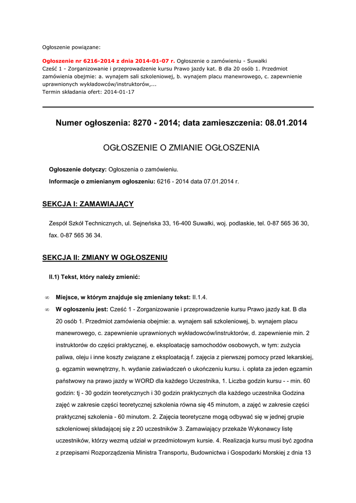Ogłoszenie powiązane: Ogłoszenie nr 6216-2014 z dnia 2014-01-07 r. Ogłoszenie o zamówieniu - Suwałki Cześć 1 - Zorganizowanie i przeprowadzenie kursu Prawo jazdy kat. B dla 20 osób 1. Przedmiot zamówienia obejmie: a. wynajem sali szkoleniowej, b. wynajem placu manewrowego, c. zapewnienie uprawnionych wykładowców/instruktorów,... Termin składania ofert: 2014-01-17 Numer ogłoszenia: 8270 - 2014; data zamieszczenia: 08.01.2014 OGŁOSZENIE O ZMIANIE OGŁOSZENIA Ogłoszenie dotyczy: Ogłoszenia o zamówieniu. Informacje o zmienianym ogłoszeniu: 6216 - 2014 data 07.01.2014 r. SEKCJA I: ZAMAWIAJĄCY Zespół Szkół Technicznych, ul. Sejneńska 33, 16-400 Suwałki, woj. podlaskie, tel. 0-87 565 36 30, fax. 0-87 565 36 34. SEKCJA II: ZMIANY W OGŁOSZENIU II.1) Tekst, który należy zmienić: • Miejsce, w którym znajduje się zmieniany tekst: II.1.4. • W ogłoszeniu jest: Cześć 1 - Zorganizowanie i przeprowadzenie kursu Prawo jazdy kat. B dla 20 osób 1. Przedmiot zamówienia obejmie: a. wynajem sali szkoleniowej, b. wynajem placu manewrowego, c. zapewnienie uprawnionych wykładowców/instruktorów, d. zapewnienie min. 2 instruktorów do części praktycznej, e. eksploatację samochodów osobowych, w tym: zużycia paliwa, oleju i inne koszty związane z eksploatacją f. zajęcia z pierwszej pomocy przed lekarskiej, g. egzamin wewnętrzny, h. wydanie zaświadczeń o ukończeniu kursu. i. opłata za jeden egzamin państwowy na prawo jazdy w WORD dla każdego Uczestnika, 1. Liczba godzin kursu - - min. 60 godzin: tj - 30 godzin teoretycznych i 30 godzin praktycznych dla każdego uczestnika Godzina zajęć w zakresie części teoretycznej szkolenia równa się 45 minutom, a zajęć w zakresie części praktycznej szkolenia - 60 minutom. 2. Zajęcia teoretyczne mogą odbywać się w jednej grupie szkoleniowej składającej się z 20 uczestników 3. Zamawiający przekaże Wykonawcy listę uczestników, którzy wezmą udział w przedmiotowym kursie. 4. Realizacja kursu musi być zgodna z przepisami Rozporządzenia Ministra Transportu, Budownictwa i Gospodarki Morskiej z dnia 13 lipca 2012 r. w sprawie egzaminowania osób ubiegających się o uprawnienia do kierowania pojazdami, szkolenia, egzaminowania i uzyskiwania uprawnień przez egzaminatorów oraz wzorów dokumentów stosowanych w tych sprawach - Dz. U. z dnia 14 września 2012 r. poz. 1019) 5. Obowiązki wykonawcy: 1) Ustalenie szczegółowego http://bzp0.portal.uzp.gov.pl/index.php?ogloszenie=show&pozycja=6... 1 z 12 2014-01-07 17:15harmonogramu zajęć z Koordynatorem projektu. 2) Zajęcia będą mogły odbywać się również w dni wolne od nauki. Wykonawca przekaże harmonogram Zamawiającemu nie później niż 4 dni przed rozpoczęciem kursu. Harmonogram może być aktualizowany przez Zamawiającego na wniosek Zamawiającego lub na wniosek Wykonawcy po ustaleniu z Koordynatorem projektu. Zmiana harmonogramu nie wymaga zawarcia aneksu do umowy. Wykonawca jest zobowiązany dostosować się do zmian harmonogramu wprowadzonych przez Zamawiającego. Harmonogram zajęć praktycznych ustalany będzie indywidualnie z każdym uczestnikiem kursu. 3) Przeprowadzenie kursu na terenie Miasta Suwałki. Wykonawca wskaże dokładny adres miejsca przeprowadzania zajęć teoretycznych oraz placu manewrowego, na którym odbędzie się część zajęć praktycznych. 4) Do przeprowadzenia zajęć teoretycznych Wykonawca zapewni pomieszczenia spełniające wszelkie wymogi bezpieczeństwa i higieny pracy: oświetlenie naturalne i sztuczne, odpowiednia temperatura, wentylacja zapewniająca prawidłową wymianę powietrza oraz prawidłowo zainstalowane urządzenia elektryczne. Sale przeznaczone na szkolenia mają spełniać wymogi sanitarnohigieniczne i zabezpieczeń przeciwpożarowych. Sale dydaktyczne muszą posiadać dostęp do sanitariatów wyposażonych w bieżącą wodę (ciepłą i zimną). 5) Wymagane jest, aby powierzchnia sal dydaktycznych, ilość stanowisk oraz wyposażenie w sprzęt i pomoce dydaktyczne były dostosowane do zakresu szkolenia oraz liczby uczestników szkolenia, zgodnie z przepisami dotyczącymi bezpieczeństwa i higieny pracy. Sala w czasie prowadzonych zajęć nie może być udostępniana innym użytkownikom niż uczestnicy kursu, musi być przeznaczona na czas szkolenia tylko dla uczestników projektu. 6) Ubezpieczenie uczestników od następstw nieszczęśliwych wypadków powstałych w związku ze szkoleniem oraz w drodze do miejsca szkolenia i z powrotem wskazanych uczestników szkolenia i zobowiązuje się do przedłożenia Zamawiającemu dokumentów potwierdzających zawarcie umowy ubezpieczenia nie później niż 24 godziny przed terminem rozpoczęcia szkolenia. 7) Zapewnienie kadry dydaktycznej posiadającej kwalifikacje i doświadczenie zawodowe odpowiednie do prowadzonego kursu. 8) Realizacja przedmiotu zamówienia w formie wykładów, pokazów oraz ćwiczeń i zadań praktycznych kształtujących i doskonalących nabyte umiejętności. Nie dopuszcza się prowadzenia zajęć metodą e-lerningową. 9) Zapewnienia materiałów dydaktycznych niezbędnych do przeprowadzenia (przekazania bezpłatnie po jednym egzemplarzu materiałów dydaktycznych Zamawiającemu), 10) Zapewnienia sprzętu niezbędnego do należytej realizacji przedmiotu zamówienia spełniającego wymogi prawne w zakresie BHP i p.poż. oraz zapewnienia sali i placu manewrowego odpowiednio przystosowanego do przeprowadzenia zajęć, 7. Wykonawca zobowiązuje się do: 1) Przeprowadzenia teoretycznego egzaminu wewnętrznego. 2) Opłaty za pierwszy pełny egzamin państwowy, 3) Oznaczenia miejsc realizacji zajęć oraz wszelkich materiałów powstających w ramach zajęć zgodnie z aktualnymi Wytycznymi dotyczącymi oznaczania projektów w ramach Programu Operacyjnego Kapitał Ludzki zatwierdzonymi przez Instytucję Zarządzającą POKL oraz zasadami promocji Projektu. 4) Informowania uczestników o współfinansowaniu zajęć ze środków Unii Eur