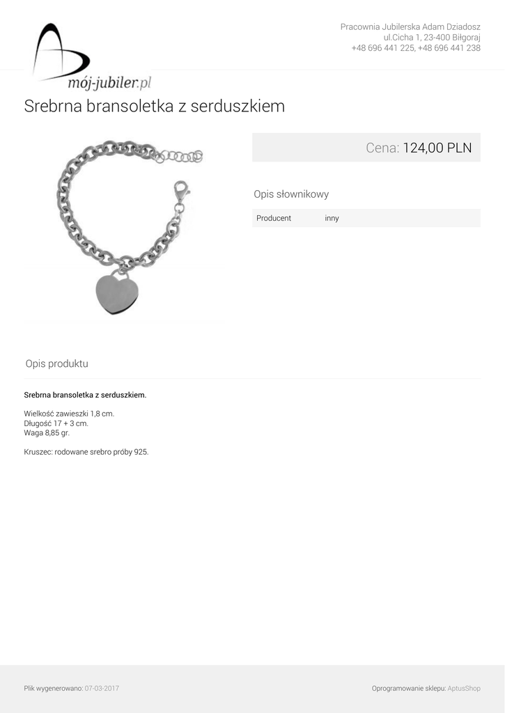 Pracownia Jubilerska Adam Dziadosz ul.Cicha 1, 23-400 Biłgoraj +48 696 441 225, +48 696 441 238 Srebrna bransoletka z serduszkiem Cena: 124,00 PLN Opis słownikowy Producent inny Opis produktu Srebrna bransoletka z serduszkiem. Wielkość zawieszki 1,8 cm. Długość 17 + 3 cm. Waga 8,85 gr. Kruszec: rodowane srebro próby 925. Plik wygenerowano: 07-03-2017 Powered by TCPDF (www.tcpdf.org) Oprogramowanie sklepu: AptusShop