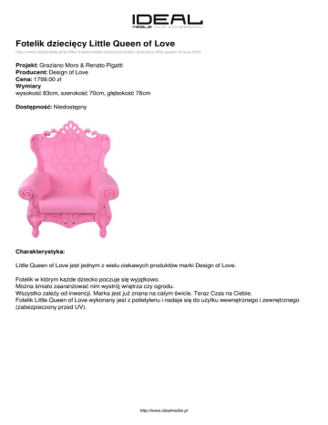 Fotelik dziecięcy Little Queen of Love http://www.idealmeble.pl/pl/offer/meble/meble-dzieciece/fotelik-dzieciecy-little-queen-of-love.html/ Projekt: Graziano Moro & Renato Pigatti Producent: Design of Love Cena: 1799.00 zł Wymiary wysokość 83cm, szerokość 70cm, głębokość 76cm Dostępność: Niedostępny Charakterystyka: Little Queen of Love jest jednym z wielu ciekawych produktów marki Design of Love. Fotelik w którym każde dziecko poczuje się wyjątkowo. Można śmiało zaaranżować nim wystrój wnętrza czy ogrodu. Wszystko zależy od inwencji. Marka jest już znana na całym świcie. Teraz Czas na Ciebie. Fotelik Little Queen of Love wykonany jest z polietylenu i nadaje się do użytku wewnętrznego i zewnętrznego (zabezpieczony przed UV). http://www.idealmeble.pl http://www.idealmeble.pl Zdjęcia produktu: http://www.idealmeble.pl Powered by TCPDF (www.tcpdf.org)
