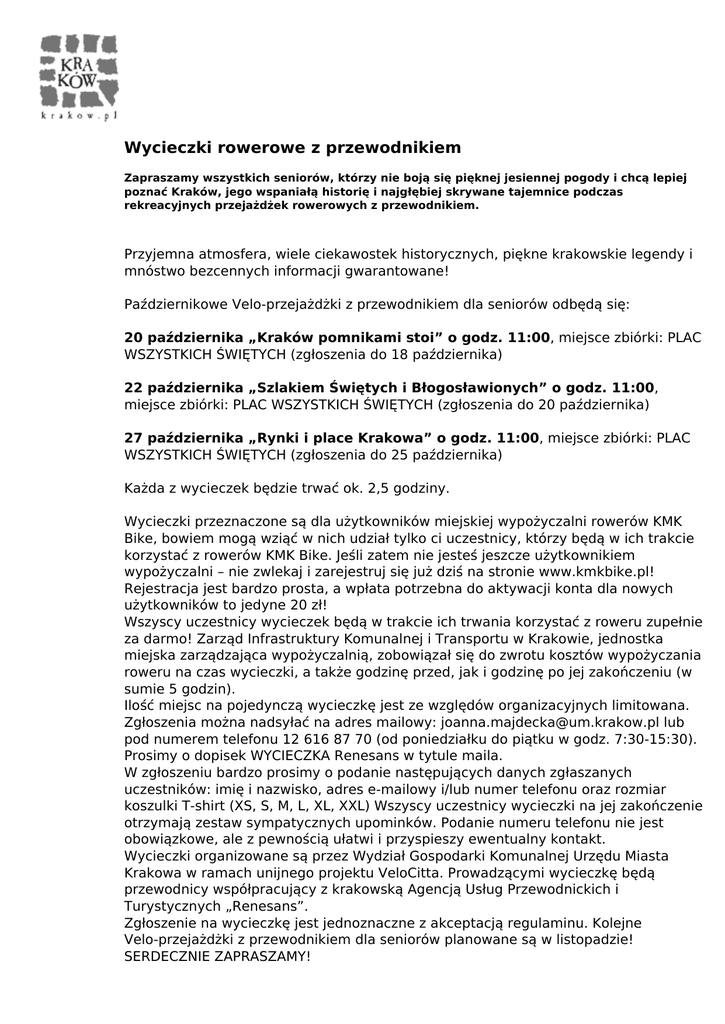 Wycieczki rowerowe z przewodnikiem Zapraszamy wszystkich seniorów, którzy nie boją się pięknej jesiennej pogody i chcą lepiej poznać Kraków, jego wspaniałą historię i najgłębiej skrywane tajemnice podczas rekreacyjnych przejażdżek rowerowych z przewodnikiem. Przyjemna atmosfera, wiele ciekawostek historycznych, piękne krakowskie legendy i mnóstwo bezcennych informacji gwarantowane! Październikowe Velo-przejażdżki z przewodnikiem dla seniorów odbędą się: 20 października „Kraków pomnikami stoi” o godz. 11:00, miejsce zbiórki: PLAC WSZYSTKICH ŚWIĘTYCH (zgłoszenia do 18 października) 22 października „Szlakiem Świętych i Błogosławionych” o godz. 11:00, miejsce zbiórki: PLAC WSZYSTKICH ŚWIĘTYCH (zgłoszenia do 20 października) 27 października „Rynki i place Krakowa” o godz. 11:00, miejsce zbiórki: PLAC WSZYSTKICH ŚWIĘTYCH (zgłoszenia do 25 października) Każda z wycieczek będzie trwać ok. 2,5 godziny. Wycieczki przeznaczone są dla użytkowników miejskiej wypożyczalni rowerów KMK Bike, bowiem mogą wziąć w nich udział tylko ci uczestnicy, którzy będą w ich trakcie korzystać z rowerów KMK Bike. Jeśli zatem nie jesteś jeszcze użytkownikiem wypożyczalni – nie zwlekaj i zarejestruj się już dziś na stronie www.kmkbike.pl! Rejestracja jest bardzo prosta, a wpłata potrzebna do aktywacji konta dla nowych użytkowników to jedyne 20 zł! Wszyscy uczestnicy wycieczek będą w trakcie ich trwania korzystać z roweru zupełnie za darmo! Zarząd Infrastruktury Komunalnej i Transportu w Krakowie, jednostka miejska zarządzająca wypożyczalnią, zobowiązał się do zwrotu kosztów wypożyczania roweru na czas wycieczki, a także godzinę przed, jak i godzinę po jej zakończeniu (w sumie 5 godzin). Ilość miejsc na pojedynczą wycieczkę jest ze względów organizacyjnych limitowana. Zgłoszenia można nadsyłać na adres mailowy: [email protected] lub pod numerem telefonu 12 616 87 70 (od poniedziałku do piątku w godz. 7:30-15:30). Prosimy o dopisek WYCIECZKA Renesans w tytule maila. W zgłoszeniu bardzo prosimy o podanie następujących danych zgłaszanych uczestników: imię i nazwisko, adres e-mailowy i/lub numer telefonu oraz rozmiar koszulki T-shirt (XS, S, M, L, XL, XXL) Wszyscy uczestnicy wycieczki na jej zakończenie otrzymają zestaw sympatycznych upominków. Podanie numeru telefonu nie jest obowiązkowe, ale z pewnością ułatwi i przyspieszy ewentualny kontakt. Wycieczki organizowane są przez Wydział Gospodarki Komunalnej Urzędu Miasta Krakowa w ramach unijnego projektu VeloCitta. Prowadzącymi wycieczkę będą przewodnicy współpracujący z krakowską Agencją Usług Przewodnickich i Turystycznych „Renesans”. Zgłoszenie na wycieczkę jest jednoznaczne z akceptacją regulaminu. Kolejne Velo-przejażdżki z przewodnikiem dla seniorów planowane są w listopadzie! SERDECZNIE ZAPRASZAMY! Regulamin : Powered by TCPDF (www.tcpdf.org)