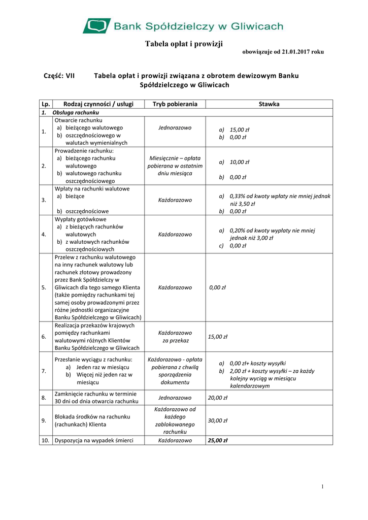 Tabela opłat i prowizji - Bank Spółdzielczy w Gliwicach