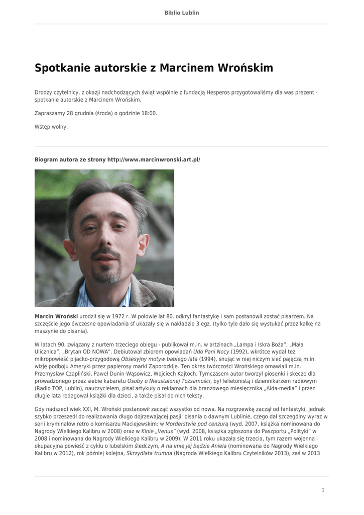 Biblio Lublin Spotkanie autorskie z Marcinem Wrońskim Drodzy czytelnicy, z okazji nadchodzących świąt wspólnie z fundacją Hesperos przygotowaliśmy dla was prezent spotkanie autorskie z Marcinem Wrońskim. Zapraszamy 28 grudnia (środa) o godzinie 18:00. Wstęp wolny. Biogram autora ze strony http://www.marcinwronski.art.pl/ Marcin Wroński urodził się w 1972 r. W połowie lat 80. odkrył fantastykę i sam postanowił zostać pisarzem. Na szczęście jego ówczesne opowiadania sf ukazały się w nakładzie 3 egz. (tylko tyle dało się wystukać przez kalkę na maszynie do pisania). W latach 90. związany z nurtem trzeciego obiegu - publikował m.in. w artzinach „Lampa i Iskra Boża”, „Mała Ulicznica”, „Brytan OD NOWA”. Debiutował zbiorem opowiadań Udo Pani Nocy (1992), wkrótce wydał też mikropowieść pijacko-przygodową Obsesyjny motyw babiego lata (1994), snując w niej niczym sieć pajęczą m.in. wizję podboju Ameryki przez papierosy marki Zaporozkije. Ten okres twórczości Wrońskiego omawiali m.in. Przemysław Czapliński, Paweł Dunin-Wąsowicz, Wojciech Kajtoch. Tymczasem autor tworzył piosenki i skecze dla prowadzonego przez siebie kabaretu Osoby o Nieustalonej Tożsamości, był felietonistą i dziennikarzem radiowym (Radio TOP, Lublin), nauczycielem, pisał artykuły o reklamach dla branżowego miesięcznika „Aida-media” i przez długie lata redagował książki dla dzieci, a także pisał do nich teksty. Gdy nadszedł wiek XXI, M. Wroński postanowił zacząć wszystko od nowa. Na rozgrzewkę zaczął od fantastyki, jednak szybko przeszedł do realizowania długo dojrzewającej pasji: pisania o dawnym Lublinie, czego dał szczególny wyraz w serii kryminałów retro o komisarzu Maciejewskim: w Morderstwie pod cenzurą (wyd. 2007, książka nominowana do Nagrody Wielkiego Kalibru w 2008) oraz w Kinie „Venus” (wyd. 2008, książka zgłoszona do Paszportu „Polityki” w 2008 i nominowana do Nagrody Wielkiego Kalibru w 2009). W 2011 roku ukazała się trzecia, tym razem wojenna i okupacyjna powieść z cyklu o lubelskim śledczym, A na imię jej będzie Aniela (nominowana do Nagrody Wielkiego Kalibru w 2012), rok później kolejna, Skrzydlata trumna (Nagroda Wielkiego Kalibru Czytelników 2013), zaś w 2013 1 Biblio Lublin roku Pogrom w przyszły wtorek (Nagroda Wielkiego Kalibru, Nagroda Wielkiego Kalibru Czytelników oraz nagroda na festiwalu „Kryminalna Piła” w 2014), kryminał retro tym razem w całości rozgrywający się w czasach tuż po II wojnie światowej. W kolejnym roku ukazała się Haiti, szósta powieść kryminalna o komisarzu Maciejewskim. Za wkład Komisarza Maciejewskiego w budowanie wizerunku miasta w 2009 roku regionalne media przyznały autorowi honorowy tytuł Bene Meritus Terrae Lublinensi (Dobrze Zasłużony dla Ziemi Lubelskiej), a w 2012 roku, podczas uroczystej premiery Skrzydlatej trumny, otrzymał Medal Prezydenta Miasta Lublina. Za tę samą książkę w 2013 przyznano autorowi Nagrodę Artystyczną Miasta Lublina za rok 2012. M. Wroński jest również autorem Officium Secretum. Psa Pańskiego, thrillera polityczno-kościelnego o o. drze Marku Glińskim OP (nominowany do Nagrody Wielkiego Kalibru w 2011). W marcu 2012 roku w ramach międzynarodowego projektu Citybooks autor był rezydentem w Chartres we Francji i napisał o tym mieście opowiadanie Widokówki z Chartres. 2