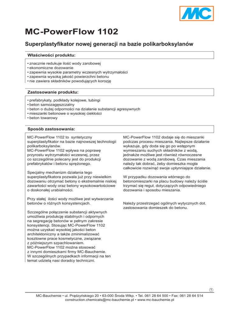 MC-PowerFlow 1102 Superplastyfikator nowej generacji na bazie polikarboksylanów Właściwości produktu: •znacznie redukuje ilość wody zarobowej •ekonomiczne dozowanie •zapewnia wysokie parametry wczesnych wytrzymałości •zapewnia wysoką jakość powierzchni betonu •nie zawiera składników powodujących korozję Zastosowanie produktu: •prefabrykaty, podkłady kolejowe, tubingi •beton samozagęszczalny •beton o dużej odporności na działanie substancji agresywnych •mieszanki betonowe o wysokiej ciekłości •beton towarowy Sposób zastosowania: MC-PowerFlow 1102 to syntetyczny superplastyfikator na bazie najnowszej technologii polikarboksylanów. MC-PowerFlow 1102 wpływa na poprawę przyrostu wytrzymałości wczesnej, przez co szczególnie polecany jest do produkcji prefabrykatów i betonu sprężonego. Specjalny mechanizm działania tego superplastyfikatora pozwala już przy niewielkim dozowaniu otrzymać betony o ekstremalnie niskiej zawartości wody oraz betony wysokowartościowe o doskonałej urabialności. Przy stałej ilości wody możliwe jest wytwarzanie betonów o różnych konsystencjach. Szczególne połączenie substancji aktywnych umożliwia produkcję stabilnych i odpornych na segregację betonów w pełnym zakresie konsystencji. Stosując MC-PowerFlow 1102 można uzyskać wysokiej jakości beton architektoniczny a także zminimalizować kosztowne prace kosmetyczne, związane z późniejszym szpachlowaniem. MC-PowerFlow 1102 można stosować z innymi domieszkami firmy MC-Bauchemie. W szczególnych przypadkach informacji na ten temat udzielą nasi doradcy techniczni. MC-PowerFlow 1102 dodaje się do mieszanki podczas procesu mieszania. Najlepsze działanie wykazuje, gdy doda się go po wstępnym wymieszaniu suchych składników z wodą, jednakże możliwe jest również równoczesne dozowanie z wodą zarobową. Czas mieszania należy tak dobrać, żeby domieszka mogła całkowicie rozwinąć swoje upłynniające działanie. W przypadku dozowania wtórnego do betonomieszarki na placu budowy należy ściśle trzymać się reguł, dotyczących odpowiedniego dozowania i sposobu mieszania. Należy przestrzegać ogólnych wytycznych dot. zastosowania domieszek do betonu. 1 MC-Bauchemie • ul. Prądzyńskiego 20 • 63-000 Środa Wlkp. • Tel. 061 28 64 500 • Fax: 061 28 64 514 [email protected] • www.mc-bauchemie.pl Techniczne właściwości produktu MC-PowerFlow 1102: Parametr Jednostka miary Gęstość objętościowa kg/dm 3 Wartość Uwagi ok. 1,06 +/- 0,02 na 1 kg cementu Zalecane dozowanie g 2 – 50 Maks. zawartość chlorków % masy < 0,10 Maks. zawartość alkaliów % masy < 1,0 Właściwości produktu MC-PowerFlow 1102: Rodzaj domieszki Superplastyfikator EN 934-2: T 3.1/3.2 (Plastyfikator EN 934-2: T 2) Barwa brązowa Postać płynna Deklaracje zgodności 0754-CPD-02-1065.2 Miejsce notyfikacji MPA, Karlsruhe Zakładowa Kontrola Produkcji wg ISO 9001:2008/ EN 934-2/6 Kolor etykiety żółty/ szary Sposób dostawy Beczka 200 kg Kontener 1000 kg Cysterna Uwaga! Informacje, zawarte w niniejszej karcie technicznej wynikają z naszych doświadczeń i dotychczasowej wiedzy, nie są jednak wiążące. Należy je dostosować do konkretnego obiektu budowlanego, celu zastosowania oraz rzeczywistych warunków, oczekiwanych w miejscu zastosowania. Oznacza to, że odpowiadamy za poprawność tych danych w ramach naszych Ogólnych Warunków Sprzedaży. Wszystkie zalecenia naszych pracowników, odbiegające od danych, zawartych w naszych kartach technicznych są dla nas tylko wtedy wiążące, gdy zostaną potwierdzone pisemnie. W każdym przypadku należy przestrzegać ogólnie obowiązujących zasad techniki budowlanej. Wydanie 10/14. Ta karta została opracowana technicznie. W momencie jej aktualizacji niniejsze wydanie przestaje być obowiązującym. MC-Bauchemie • ul. Prądzyńskiego 20 • 63-000 Środa Wlkp. • Tel. 061 28 64 500 • Fax: 061 28 64 514 [email protected] • www.mc-bauchemie.pl 2