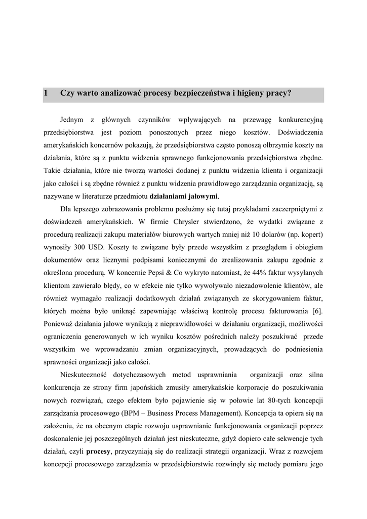 1 Czy warto analizować procesy bezpieczeństwa i higieny pracy? Jednym z przedsiębiorstwa głównych jest czynników poziom wpływających ponoszonych przez na przewagę konkurencyjną niego kosztów. Doświadczenia amerykańskich koncernów pokazują, że przedsiębiorstwa często ponoszą olbrzymie koszty na działania, które są z punktu widzenia sprawnego funkcjonowania przedsiębiorstwa zbędne. Takie działania, które nie tworzą wartości dodanej z punktu widzenia klienta i organizacji jako całości i są zbędne również z punktu widzenia prawidłowego zarządzania organizacją, są nazywane w literaturze przedmiotu działaniami jałowymi. Dla lepszego zobrazowania problemu posłużmy się tutaj przykładami zaczerpniętymi z doświadczeń amerykańskich. W firmie Chrysler stwierdzono, że wydatki związane z procedurą realizacji zakupu materiałów biurowych wartych mniej niż 10 dolarów (np. kopert) wynosiły 300 USD. Koszty te związane były przede wszystkim z przeglądem i obiegiem dokumentów oraz licznymi podpisami koniecznymi do zrealizowania zakupu zgodnie z określona procedurą. W koncernie Pepsi & Co wykryto natomiast, że 44% faktur wysyłanych klientom zawierało błędy, co w efekcie nie tylko wywoływało niezadowolenie klientów, ale również wymagało realizacji dodatkowych działań związanych ze skorygowaniem faktur, których można było uniknąć zapewniając właściwą kontrolę procesu fakturowania [6]. Ponieważ działania jałowe wynikają z nieprawidłowości w działaniu organizacji, możliwości ograniczenia generowanych w ich wyniku kosztów pośrednich należy poszukiwać przede wszystkim we wprowadzaniu zmian organizacyjnych, prowadzących do podniesienia sprawności organizacji jako całości. Nieskuteczność dotychczasowych metod usprawniania organizacji oraz silna konkurencja ze strony firm japońskich zmusiły amerykańskie korporacje do poszukiwania nowych rozwiązań, czego efektem było pojawienie się w połowie lat 80-tych koncepcji zarządzania procesowego (BPM – Business Process Management). Koncepcja ta opiera się na założeniu, że na obecnym etapie rozwoju usprawnianie funkcjonowania organizacji poprzez doskonalenie jej poszczególnych działań jest nieskuteczne, gdyż dopiero całe sekwencje tych działań, czyli procesy, przyczyniają się do realizacji strategii organizacji. Wraz z rozwojem koncepcji procesowego zarządzania w przedsiębiorstwie rozwinęły się metody pomiaru jego skuteczności, w tym między innymi metody umożliwiające analizę kosztów procesów organizacyjnych. Procesowe podejście do zarządzania organizacją koncentruje się głównie na procesach operacyjnych tj. na procesach tworzących wartość dodaną, a więc kluczowych z punktu widzenia działalności przedsiębiorstwa oraz klienta. Można zaliczyć do nich m.in. procesy realizowane w obszarze produkcji, dystrybucji, marketingu czy sprzedaży. Obok procesów operacyjnych w każdej organizacji można również wyodrębnić procesy zarządcze i wspierające tj. procesy nie tworzące wartości dodanej w organizacji, ale niezbędne dla jej funkcjonowania. Do takich procesów można zaliczyć m.in. proces zarządzania finansami czy proces zarządzania zasobami ludzkimi. Realizacja niektórych procesów jest wymuszona zewnętrznymi wymaganiami prawnymi. Procesy zarządzania bezpieczeństwem i higieną pracy nie tworzą wartości dodanej, ale są niezbędne gdyż z jednej strony przyczyniają się do zapewnienia sprawnego funkcjonowania przedsiębiorstwa, z drugiej zaś strony umożliwiają spełnienie wymagań prawnych w zakresie bezpieczeństwa i higieny pracy. Ponadto zastosowanie podejścia procesowego w obszarze zarządzania BHP może wspomóc przedsiębiorstwa we wdrażaniu i utrzymaniu systemu zarządzania bezpieczeństwem i higieną pracy. Badania prowadzone w Centralnym Instytucie Ochrony Pracy – Państwowym Instytucie Badawczym pokazują, że możliwe jest zastosowanie podejścia procesowego do zarządzania bezpieczeństwem i higieną pracy, a analiza kosztów procesów realizowanych w obszarze BHP przedsiębiorstwa umożliwia monitorowanie i ocenę działań usprawniających przebieg tych procesów. Celem badań było usprawnienie przebiegu wybranych procesów, a w konsekwencji skrócenie czasu oraz ograniczenie kosztów ich realizacji, przy założeniu, że będą co najmniej w takim samym stopniu realizowały założone cele. Procesy zarządzania bezpieczeństwem i higieną pracy zostały usprawnione przez: delegowanie uprawnień, a ściślej mówiąc zwiększenie uprawnień komórki ds. bhp oraz kierowników komórek organizacyjnych do podejmowania działań w obszarze bhp, eliminację tzw. działań jałowych, czyli zbędnych z punktu widzenia realizacji procesu przypisanie zadań tylko jednej komórce organizacyjnej, które przed usprawnieniami były realizowane przez kilka komórek. Wyniki badań pokazały, że usprawnianie procesów organizacyjnych realizowanych w obszarze bezpieczeństwa i higieny pracy może przynieść znaczne oszczędności. Oszczędności te zostały oszacowane w szczególności dla tych procesów zarządzania BHP, które ze względu na wymagania przepisów prawa powinny być realizowane w każdym przedsiębiorstwie niezależnie od tego, czy wdraża ono system zarządzania bezpieczeństwem i higieną pracy zgodnie z polską normą PN-N-18001 czy też nie, a mianowicie dla: procesu identyfikacji zagrożeń i oceny ryzyka zawodowego z uwzględnieniem działań korygujących i/lub zapobiegawczych, procesu szkoleń z zakresu bezpieczeństwa i higieny pracy, procesu monitorowania warunków pracy z uwzględnieniem działań korygujących i/lub zapobiegawczych. Co się okazało? Największe możliwości usprawnień, a tym samym największe możliwości ograniczenia kosztów, odnotowano w odniesieniu do procesów oceny ryzyka zawodowego (w trzech przypadkach na pięć). Duże możliwości usprawnień odnoto
