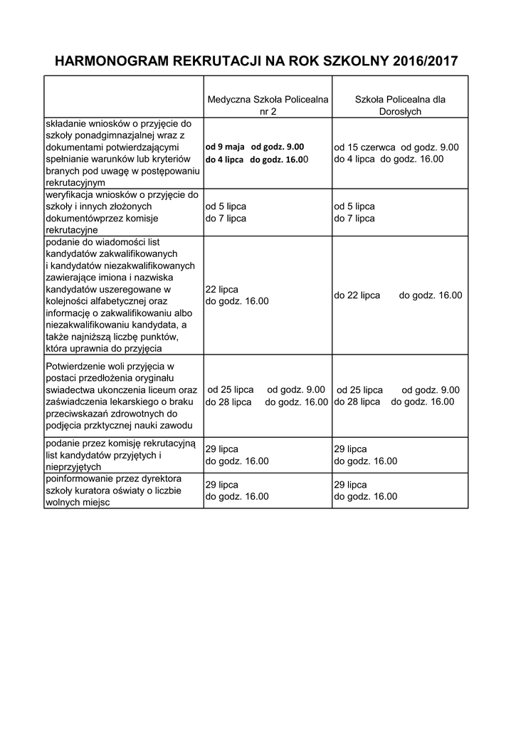 HARMONOGRAM REKRUTACJI NA ROK SZKOLNY 2016/2017 Medyczna Szkoła Policealna nr 2 składanie wniosków o przyjęcie do szkoły ponadgimnazjalnej wraz z dokumentami potwierdzającymi spełnianie warunków lub kryteriów branych pod uwagę w postępowaniu rekrutacyjnym weryfikacja wniosków o przyjęcie do szkoły i innych złożonych dokumentówprzez komisje rekrutacyjne podanie do wiadomości list kandydatów zakwalifikowanych i kandydatów niezakwalifikowanych zawierające imiona i nazwiska kandydatów uszeregowane w kolejności alfabetycznej oraz informację o zakwalifikowaniu albo niezakwalifikowaniu kandydata, a także najniższą liczbę punktów, która uprawnia do przyjęcia od 9 maja od godz. 9.00 do 4 lipca do godz. 16.00 od 15 czerwca od godz. 9.00 do 4 lipca do godz. 16.00 od 5 lipca do 7 lipca od 5 lipca do 7 lipca 22 lipca do godz. 16.00 do 22 lipca Potwierdzenie woli przyjęcia w postaci przedłożenia oryginału swiadectwa ukonczenia liceum oraz od 25 lipca zaświadczenia lekarskiego o braku do 28 lipca przeciwskazań zdrowotnych do podjęcia przktycznej nauki zawodu podanie przez komisję rekrutacyjną list kandydatów przyjętych i nieprzyjętych poinformowanie przez dyrektora szkoły kuratora oświaty o liczbie wolnych miejsc Szkoła Policealna dla Dorosłych do godz. 16.00 od godz. 9.00 od 25 lipca od godz. 9.00 do 28 lipca do godz. 16.00 do godz. 16.00 29 lipca do godz. 16.00 29 lipca do godz. 16.00 29 lipca do godz. 16.00 29 lipca do godz. 16.00 HARMONOGRAM REKRUTACJI UZUPELNIAJĄCEJ 2016/2017 składanie wniosków o przyjęcie do szkoły ponadgimnazjalnej wraz z dokumentami potwierdzającymi spełnianie warunków lub kryteriów branych pod uwagę w postępowaniu rekrutacyjnym od 1 sierpnia od godz. 9.00 do 5 sierpnia do godz. 16.00 (we wszystkich szkołach) od 1 sierpnia godz. 9.00 sierpnia weryfikacja wniosków o przyjęcie do szkoły i innych złożonych do 8 sierpnia dokumentówprzez komisje do godz. 16.00 rekrutacyjne do 8 sierpnia godz. 16.00 podanie do wiadomości list kandydatów zakwalifikowanych i kandydatów niezakwalifikowanych zawierające imiona i nazwiska kandydatów uszeregowane w kolejności alfabetycznej oraz informację o zakwalifikowaniu albo niezakwalifikowaniu kandydata, a także najniższą liczbę punktów, która uprawnia do przyjęcia 25 sierpnia do godz. 16.00 25 sierpnia do godz. 16.00 Potwierdzenie woli przyjęcia w postaci przedłożenia oryginału swiadectwa ukonczenia liceum i od 26 sierpnia oryginału zaświadczenia o wynikach od godz. 9.00 egzaminu gimnazjalnego oraz sierpnia zaświadczenia lekarskiego o braku 16.00 przeciwskazań zdrowotnych do podjęcia praktycznej nauki zawodu od 26 sierpnia do 30 od godz. 9.00 do godz. sierpnia 16.00 podanie przez komisję rekrutacyjną list kandydatów przyjętych i nieprzyjętych poinformowanie przez dyrektora szkoły kuratora oświaty o liczbie wolnych miejsc 31 sierpnia do godz. 16.00 31 sierpnia do godz. 16.00 31 sierpnia do godz. 16.00 31 sierpnia do godz. 16.00 od do 5 do godz. 16.00 do do 30 do godz.