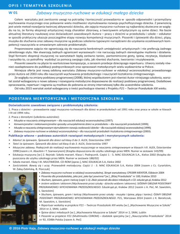 O P I S I T E M AT Y K A S Z KO L E N I A W 01 Zabawy muzyczno-ruchowe w edukacji małego dziecka Celem warsztatu jest zwrócenie uwagi na potrzebę i konieczność prowadzenia w sposób odpowiedni i przemyślany wychowania muzycznego oraz pokazanie wielu możliwości stymulowania rozwoju psychofizycznego dziecka. Z pewnością jest wiele metod rozwijania twórczej aktywności dziecka, ale zajęcia muzyczno-ruchowe są najbardziej skuteczne ze względu na to, że formy ekspresji artystycznej mają charakter zbiorowy, a tworzywem artystycznym są same dzieci. Na bazie aktualnej literatury naukowej oraz doświadczeń zawodowych Autora – pracy z dziećmi w przedszkolu i szkole – edukator w sposób praktyczny ukazuje poszczególne etapy rozwoju kompetencji muzycznych. Piosenki i śpiewanki dla dzieci, pląsy, muzyka do słuchania oraz zabawy muzyczne są podczas szkolenia typowymi narzędziami do uzyskania oczekiwanych kompetencji nauczyciela w omawianym zakresie problematyki. Proponowane zajęcia nie ograniczają się do nauczania konkretnych umiejętności artystycznych i nie preferują żadnego określonego stylu. Nie stwarzają żadnych ograniczeń wyrazowych i nie narzucają żadnych stereotypów myślenia i działania. Stąd formami ekspresji muzycznej na warsztatach będą zarówno taniec, pantomimiczne gesty, śpiew, recytacja, klaskanie i wszystko to, co potrafimy wydobyć za pomocą swojego ciała, jak również słuchanie, tworzenie i muzykowanie. Piosenki zawarte na płycie to wartościowe kompozycje, a zarazem przeboje dziecięcego repertuaru. Utwory zostały również zaadaptowane do publikacji podręcznikowych oraz opracowań metodycznych wielu wydawnictw w Polsce. Niniejsza oferta jest nową odsłoną warsztatu Zabawy muzyczno-ruchowe w edukacji wczesnoszkolnej prowadzonego przez Autora od 2003 roku dla nauczycieli wychowania przedszkolnego i nauczycieli kształcenia zintegrowanego. Ze względu na zmiany podstawy programowej (2008), której współautorem jest również Autor niniejszego szkolenia, warsztat został wzbogacony o nowe zabawy i rozwiązania metodyczne dopasowane do realizacji podstawy programowej. Dodatkowe opracowania, repertuar i nagrania są możliwe do pobrania ze strony internetowej tylko dla uczestników szkolenia. Od roku 2015 warsztat został wzbogacony o treści pochodzące również z Projektu P21 – Twórcze Przedszkole XXI wieku. PODSTAWA MERYTORYCZNA I METODYCZNA SZKOLENIA Doświadczenie zawodowe związane z problematyką szkolenia: 1. Praca z dziećmi – prowadzenie zajęć muzyczno-ruchowych dla dzieci w przedszkolach od 1991 roku oraz praca w szkole w klasach I-III od 1994 roku. 2. Praca z dorosłymi (szkolenia autorskie): • Muzyka w nauczaniu zintegrowanym – dla nauczycieli edukacji wczesnoszkolnej (1997); • Konwencjonalne i niekonwencjonalne sposoby umuzykalnienia dzieci w przedszkolu – dla nauczycieli przedszkoli (1999); • Muzyka w nauczaniu zintegrowanym stymulatorem rozwoju osobowości dziecka – dla nauczycieli edukacji wczesnoszkolnej (1999); • Zabawy muzyczno-ruchowe w edukacji wczesnoszkolnej – dla nauczycieli przedszkoli i kształcenia zintegrowanego (2003). Publikacje własne – podstawa autorskich rozwiązań metodycznych i merytorycznych szkolenia: • Mamo! Ja śpiewam. Śpiewnik dla dzieci od klasy 0 do 3. ALEX, Dzierżoniów 1997 • Tato! Ja śpiewam. Śpiewnik dla dzieci od klasy 0 do 3. ALEX, Dzierżoniów 1997 • Muzyczne zabawy. Podręcznik do realizacji wychowania muzycznego w nauczaniu zintegrowanym w klasach I-III. ALEX, Dzierżoniów 1998 [razem z A. Abackim i T. Szarwarynem] (Książka dopuszczona do użytku szkolnego przez MEN. Numer w zestawie 143/99) • Edukacja muzyczna [w:] Z. Rejniak: Szkoła marzeń. Klasa I. Podręcznik. Części 1 - 5. MAC EDUKACJA S.A., Kielce 2002 (Książka dopuszczona do użytku szkolnego przez MEN. Numer w zestawie 188/02) • Szkoła marzeń. Klasy I-III. MULTIMEDIA. CD-ROM [oprac.], MAC EDUKACJA S.A, Kielce 2002 • Sześciolatek. Bawię się i uczę. Przewodnik metodyczny. Części 1 - 5. MAC EDUKACJA S.A, Kielce 2004 [razem z Cz. Cyrańskim, W. Żabą-Żabińską, B. Florczuk] •Zabawy muzyczno-ruchowe w edukacji wczesnoszkolnej. Skrypt warsztatowy. CPEiSRR MENTOR, Elżbiecin 2004 •Piosenka dla przedszkolaka, jaka jest, jaka być powinna? [w:] „Bliżej Przedszkola” nr 100, Kraków 2010 •Słucham, śpiewam, gram i tańczę (część 1-3). Zbiór piosenek dla dzieci młodszych z CD. eduskrypt.pl, Kraków 2012 •Jestem widzem i aktorem (Wychowanie przez sztukę - dziecko widzem i aktorem). SIÓDMY OBSZAR PODSTAWY PROGRAMOWEJ WYCHOWANIA PRZEDSZKOLNEGO. Eduskrypt.pl, Kraków 2012 [razem z A. Peć, M. Sawickim, Ł. Sienickim] •Słucham, śpiewam, gram i tańczę (Wychowanie przez sztukę - muzyka i śpiew, pląsy i taniec). ÓSMY OBSZAR PODSTAWY PROGRAMOWEJ WYCHOWANIA PRZEDSZKOLNEGO. P21, Warszawa 2014 [razem z K. Barańczuk, M. Sawickim, Ł. Sienickim] •Repertuar wokalny w projekcie P21 – Twórcze Przedszkole XXI wieku [w:] „Wychowanie Muzyczne w Szkole” 2014 nr 2, SNM, Lublin •Śpiew dzieci młodszych [w:] „Wychowanie Muzyczne w Szkole” 2014 nr 2, SNM, Lublin •Piosenki w projekcie P21 (Multimedia CDROM) – dodatek specjalny [w:] „Nauczycielka Przedszkola” 2014 nr 92, EDIBA Polska [razem A. Peć] © 2016 Piotr Kaja, Zabawy muzyczno-ruchowe w edukacji małego dziecka P R O G R A M R A M O W Y S Z KO L E N I A Adresaci: Nauczyciele wychowania przedszkolnego, nauczania początkowego i świetlic szkolnych Wymiar godzin: 8 - 12 godz. (sesja jedno lub dwudniowa) Liczba uczestników: Grupa maksymalnie do 35 osób (w zależności od możliwości lokalowych) Cel: Po szkoleniu uczestnik będzie posiadał umiejętność stosowania różnorodnych zabaw muzyczno-ruchowych wspomagających pracę wychowawczą oraz czynności dydaktyczne nauczyciela w zakresie kształcenia muzycznego na poziomie edukacji małego dziecka (przedszkole, „zerówka”, k