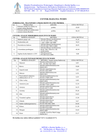 Miejskie Przedsiębiorstwo Wodociągów i Kanalizacji w Bochni Spółka z o.o. Zarejestrowana – Sąd Rejonowy dla Krakowa Śródmieścia w Krakowie XII Wydział Gospodarczy krajowego Rejestru Sądowego pod numerem KRS 0000095395 NIP 868 – 000 – 15 – 10 Regon 850493898 Kapitał Udziałowy 47 597 000,00 PLN CENNIK BADANIA WODY POBIERANIE, TRANSPORT I PRZECHOWYWANIE PRÓBEK Lp. Rodzaj usługi Pobranie próbki do analizy na terenie miasta Bochnia Pobranie próbki do analizy poza terenem miasta Bochnia 1. 2. jednostka CENA NETTO zł próbka 43,05 próbka 86,10 CENNIK ANALIZ MIKROBIOLOGICZNYCH WODY Lp. 1. RODZAJ ANALIZY Bakterie grupy coli 2. Escherichia coli 3. Paciorkowce kałowe 4. Clostridium perfringens 5. Ogólna liczba bakterii w 22ºC METODA Metoda filtracji membranowej PN-EN ISO 9308-1:2004 +Apl 1:2005+Apl 2009 Metoda filtracji membranowej PN-EN ISO 7899-2:2004 Metoda filtracji membranowej Rozp. Min. Zdrowia z dn. 20.04.2010r. Metoda posiewu PN-ISO 6222:2004 CENA NETTO zł 41,41 34,21 26,91 45,59 9,88 CENNIK ANALIZ FIZYKOCHEMICZNYCH WODY Lp. RODZAJ ANALIZY 1. Mętność 2. Barwa 3. Zapach/smak 4. Odczyn 5. Przewodność właściwa elektryczna w 25 ˚C 6. Chlor wolny 7. Amonowy jon 8. Azotyny 9. Azotany 10. Glin 11. Twardość ogólna 12. Chlorki 13. Indeks nadmanganianowy 14. Żelazo 15. Mangan 16. Ozon METODA / Numer normy badawczej Metoda nefelometryczna PN - EN ISO 7027:2003 Metoda spektrofotometryczna PB/05/2011 Metoda organoleptyczna PN-EN 1622:2003 Metoda elektrometryczna PB/01/2011 Metoda konduktometryczna PN-EN 27888:1999 Metoda spektrofotometryczna PB/07/2010 Metoda spektrofotometryczna PN-ISO 7150-1:2002 Metoda spektrofotometryczna PN-EN 26777:1999 Metoda spektrofotometryczna PB/09/2012 Metoda spektrofotometryczna PB/02/2010 Metoda miareczkowa PN-ISO 6059:1999 Metoda miareczkowa PN-ISO 9297:1994 PN-EN ISO 8467:2001 Metoda spektrofotometryczna PN-ISO 6332:2001 Metoda spektrofotometryczna PB/03/2009 Ampułki AccuVac Hach Lange PB/08/2011 Do każdej ceny należy doliczyć podatek VAT w wysokości 23 % MPWiK w Bochni Spółka z o. o. 32 – 700 Bochnia, ul. Majora Bacy 15 tel. 14 614-95-11; fax. 14 614-95-13 CENA NETTO zł 4,85 10,00 5,85 6,54 6,24 6,68 12,34 16,35 39,36 34,83 15,36 9,67 24,56 21,28 16,64 15,17
