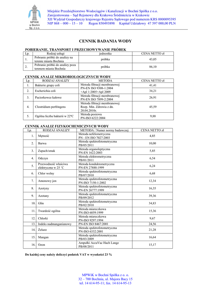 cennik badania wody - Miejskie Przedsiębiorstwo Wodociągów i