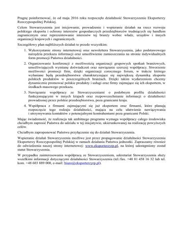 Pragnę poinformować, że od maja 2016 roku rozpoczęło działalność Stowarzyszenie Eksporterzy Rzeczypospolitej Polskiej. Celem Stowarzyszenia jest inicjowanie, prowadzenie i wspieranie działań na rzecz rozwoju polskiego eksportu i ochrony interesów gospodarczych przedsiębiorców trudniących się handlem zagranicznym oraz reprezentowanie interesów tej branży wobec władz, urzędów i innych organizacji krajowych i zagranicznych. Szczegółowy plan najbliższych działań to przede wszystkim: 1. Wykorzystanie strony internetowej oraz newslettera Stowarzyszenia, jako podstawowego narzędzia przekazu informacji oraz umożliwienie zamieszczania na stronie indywidualnych form promocji Państwa działalności. 2. Organizowanie konferencji z możliwością organizacji grupowych spotkań branżowych, umożliwiających wymianę doświadczeń oraz nawiązanie szerszej współpracy. Stworzenie możliwości promocji firm, dzięki organizacji corocznego forum, w trakcie którego wyłaniane będą przedsiębiorstwa charakteryzujące się największą dynamiką eksportu polskich produktów w poszczególnych branżach. Dzięki takim wydarzeniom chcemy dynamicznie promować polskie produkty i usługi oraz firmy zajmujące się ich eksportem, w środkach masowego przekazu. 3. Nawiązanie współpracy ze Stowarzyszeniami o podobnym profilu działalności funkcjonującymi w innych krajach oraz rozpowszechnianie informacji o działalności prowadzonej przez polskie przedsiębiorstwa, poza granicami kraju. 4. Współpraca z firmami zajmującymi się już eksportem oraz firmami, które planują rozpoczęcie tego rodzaju działalności, mająca na celu ułatwienie nawiązywania i utrzymywania kontaktów z potencjalnymi kontrahentami poza granicami Polski. Mając świadomość, że realizacja tak ambitnego programu wymaga współpracy całego środowiska chciałbym zaprosić Państwa do udziału w tej inicjatywie, ukierunkowanej na realizację powyższych celów. Chciałbym zaproponować Państwu przyłączenie się do działań Stowarzyszenia. Wspieranie działań Stowarzyszenia możliwe jest przez propagowanie działalności Stowarzyszenia Eksporterzy Rzeczypospolitej Polskiej w ramach działania Państwa jednostki. Zapraszamy również do odwiedzenia naszej strony internetowej: www.eksporterzyrp.pl, na której udostępniony został statut Stowarzyszenia. W przypadku zainteresowania współpracą ze Stowarzyszeniem, sekretariat Stowarzyszenia służy wszelkimi informacji dotyczącymi działalności Stowarzyszenia (tel./fax. +48 81 458 16 32 lub tel. kom. +48 603 889 000, e-mail: [email protected]).