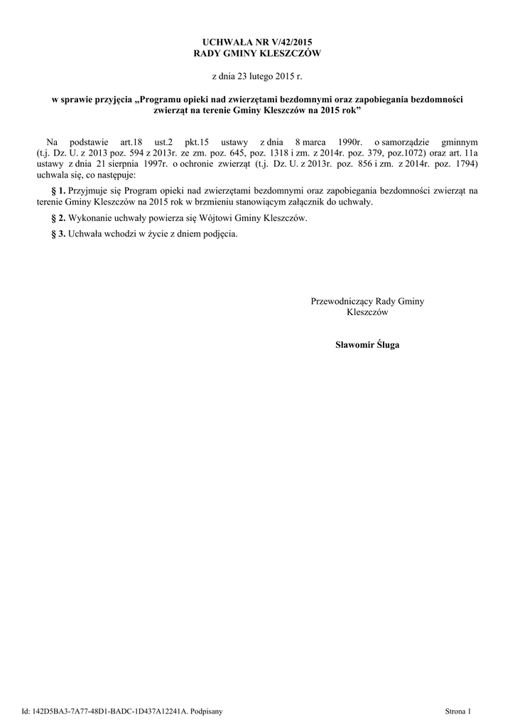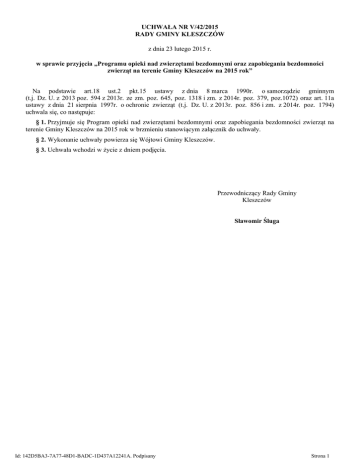 UCHWAŁA NR V/42/2015 RADY GMINY KLESZCZÓW z dnia 23 lutego 2015 r. w sprawie przyjęcia „Programu opieki nad zwierzętami bezdomnymi oraz zapobiegania bezdomności zwierząt na terenie Gminy Kleszczów na 2015 rok” Na podstawie art.18 ust.2 pkt.15 ustawy z dnia 8 marca 1990r. o samorządzie gminnym (t.j. Dz. U. z 2013 poz. 594 z 2013r. ze zm. poz. 645, poz. 1318 i zm. z 2014r. poz. 379, poz.1072) oraz art. 11a ustawy z dnia 21 sierpnia 1997r. o ochronie zwierząt (t.j. Dz. U. z 2013r. poz. 856 i zm. z 2014r. poz. 1794) uchwala się, co następuje: § 1. Przyjmuje się Program opieki nad zwierzętami bezdomnymi oraz zapobiegania bezdomności zwierząt na terenie Gminy Kleszczów na 2015 rok w brzmieniu stanowiącym załącznik do uchwały. § 2. Wykonanie uchwały powierza się Wójtowi Gminy Kleszczów. § 3. Uchwała wchodzi w życie z dniem podjęcia. Przewodniczący Rady Gminy Kleszczów Sławomir Śluga Id: 142D5BA3-7A77-48D1-BADC-1D437A12241A. Podpisany Strona 1 Załącznik do Uchwały Nr V/42/2015 Rady Gminy Kleszczów z dnia 23 lutego 2015 r. Program opieki nad zwierzętami bezdomnymi oraz zapobiegania bezdomności zwierząt na terenie Gminy Kleszczów na 2015 rok Rozdział 1. Postanowienia ogólne § 1. Ilekroć w uchwale mowa o: 1) Urzędzie, należy przez to rozumieć Urząd Gminy w Kleszczowie, jednostkę organizacyjną, przy pomocy, której Wójt wykonuje zadania; 2) Referacie Ochrony Środowiska i Gospodarki Gruntami, należy przez to rozumieć komórkę organizacyjną Urzędu Gminy w Kleszczowie; 3) Ustawie – należy przez to rozumieć ustawę z dnia 21 sierpnia 1997r. o ochronie zwierząt ( Dz. U. z 2013r. poz.856); 4) Schronisku – należy przez to rozumieć Przedsiębiorstwo Komunalne SANIKOM Sp. z o.o. ul. Staszica 5, 97- 400 Bełchatów- prowadzące schronisko; 5) Programie, należy przez to rozumieć Program opieki nad zwierzętami bezdomnymi oraz zapobiegania bezdomności zwierząt na terenie gminy Kleszczów na 2015r. Rozdział 2. Cel i zadania programu § 2. 1. Celem Programu jest zapobieganie bezdomności zwierząt na terenie Gminy Kleszczów oraz opieka nad zwierzętami bezdomnymi. 2. Zadania priorytetowe programu to: 1) Zapewnienie opieki bezdomnym zwierzętom z terenu Gminy Kleszczów; 2) Ograniczenie populacji bezdomnych zwierząt przebywających w schronisku poprzez sterylizację i kastrację, w szczególności psów i kotów; 3) Poszukiwanie nowych właścicieli dla bezdomnych zwierząt; 4) Promowanie prawidłowych postaw i zachowań człowieka w stosunku do zwierząt oraz edukacja społeczeństwa w zakresie obowiązków spoczywających na właścicielach i opiekunach kotów i psów; 5) Odławianie bezdomnych zwierząt; 6) Sprawowanie opieki nad kotami wolno żyjącymi; 7) Zapewnienie bezpieczeństwa mieszkańcom; 8) Wskazanie gospodarstwa rolnego w celu zapewnienia miejsca dla zwierząt gospodarskich; 9) Zapewnienie całodobowej opieki weterynaryjnej w przypadkach zdarzeń drogowych z udziałem zwierząt. Rozdział 3. Formy przeciwdziałania bezdomności zwierząt § 3. Zapobieganie bezdomności zwierząt na terenie Gminy Kleszczów polega na: 1) Odławianiu i umieszczaniu w schronisku zwierząt bezdomnych, zagubionych i błąkających się po terenie Gminy Kleszczów wyłącznie przy użyciu specjalistycznego sprzętu przeznaczonego do wyłapywania zwierząt, który nie stwarza zagrożenia dla życia i zdrowia zwierząt, a także nie będzie zadawał im cierpienia; 2) Objęciu opieką zwierząt przebywających w schronisku poprzez zapewnienie im właściwych warunków Id: 142D5BA3-7A77-48D1-BADC-1D437A12241A. Podpisany Strona 1 bytowania oraz zapewnienie opieki lekarsko-weterynaryjnej; 3) Poszukiwaniu dotychczasowych właścicieli lub nowych właścicieli dla zwierząt przebywających w schronisku; 4) Zmniejszaniu populacji bezdomnych zwierząt przebywających w schronisku, poprzez sterylizację i kastrację; 5) Dokonywaniu w uzasadnionych przypadkach usypiania ślepych miotów; 6) Edukacji mieszkańców Gminy Kleszczów w zakresie kształtowania prawidłowych postaw i zachowań człowieka w stosunku do zwierząt oraz w zakresie obowiązków spoczywających na właścicielach i opiekunach zwierząt; 7) Podejmowaniu interwencji w sprawach dotyczących traktowania zwierząt niezgodnie z przepisami ustawy. Rozdział 4. Ograniczenie populacji bezdomnych zwierząt § 4. 1 Ograniczenie populacji bezdomnych zwierząt poprzez sterylizację i kastrację zwierząt w szczególności psów i kotów realizują: 1) Schronisko poprzez obligatoryjne przeprowadzenie zabiegów sterylizacji i kastracji zwierząt przyjętych do schroniska, z wyjątkiem zwierząt, u których istnieją przeciwwskazania do wykonania tych zabiegów, z uwagi na stan zdrowia lub wiek; 2) Zabieg sterylizacji albo kastracji może być wykonany dopiero po upływie 14 dni po wyłapaniu i dostarczeniu zwierzęcia do schroniska; 3) Referat Ochrony Środowiska i Gospodarki Gruntami Urzędu Gminy w Kleszczowie poprzez prowadzenie akcji zachęcającej właścicieli psów i kotów do wykonywania zabiegów sterylizacji i kastracji; 2. Usypianie ślepych miotów zgodnie z art. 11a ust.2 pkt. 6 ustawy o ochronie zwierząt z dnia 21 sierpnia 1997r. realizują: 1) Schronisko poprzez dokonywanie przez lekarza weterynarii zabiegów usypiania ślepych miotów; 2) Gmina Kleszczów poprzez finansowanie usypiania ślepych miotów zwierząt, w szczególności psów i kotów z terenu Gminy Kleszczów, na poniższych zasadach: a) Uśpieniu mogą podlegać wyłącznie ślepe mioty psów i kotów, dla których nie ma możliwości znalezienia właścicieli; b) Zabieg uśpienia ślepych miotów przeprowadza wyłącznie lekarz weterynarii, z którym Gmina ma zawartą umowę na świadczenie usług w tym zakresie. Ponadto właściciel/opiekun wypełni oświadczenie, którego wzór stanowi załącznik do niniejszego Programu; c) Zwierzę usypiane musi być traktowane do ostatniej chwili życia łagodnie i przyjaźnie, na