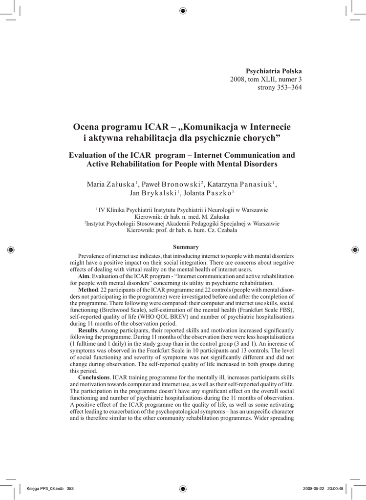 Psychiatria Polska 2008, tom XLII, numer 3 strony 353–364 Ocena programu ICAR – „Komunikacja w Internecie i aktywna rehabilitacja dla psychicznie chorych” Evaluation of the ICAR program – Internet Communication and Active Rehabilitation for People with Mental Disorders Maria Załuska 1 , Paweł Bro n o w s k i 2 , Katarzyna Pa n a s i u k 1 , Jan Brykalsk i 1 , Jolanta P a s z k o 1 IV Klinika Psychiatrii Instytutu Psychiatrii i Neurologii w Warszawie Kierownik: dr hab. n. med. M. Załuska 2 Instytut Psychologii Stosowanej Akademii Pedagogiki Specjalnej w Warszawie Kierownik: prof. dr hab. n. hum. Cz. Czabała 1 Summary Prevalence of internet use indicates, that introducing internet to people with mental disorders might have a positive impact on their social integration. There are concerns about negative effects of dealing with virtual reality on the mental health of internet users. Aim. Evaluation of the ICAR program - “Internet communication and active rehabilitation for people with mental disorders” concerning its utility in psychiatric rehabilitation. Method. 22 participants of the ICAR programme and 22 controls (people with mental disorders not participating in the programme) were investigated before and after the completion of the programme. There following were compared: their computer and internet use skills, social functioning (Birchwood Scale), self-estimation of the mental health (Frankfurt Scale FBS), self-reported quality of life (WHO QOL BREV) and number of psychiatric hospitalisations during 11 months of the observation period. Results. Among participants, their reported skills and motivation increased significantly following the programme. During 11 months of the observation there were less hospitalisations (1 fulltime and 1 daily) in the study group than in the control group (3 and 1). An increase of symptoms was observed in the Frankfurt Scale in 10 participants and 13 controls. The level of social functioning and severity of symptoms was not significantly different and did not change during observation. The self-reported quality of life increased in both groups during this period. Conclusions. ICAR training programme for the mentally ill, increases participants skills and motivation towards computer and internet use, as well as their self-reported quality of life. The participation in the programme doesn’t have any significant effect on the overall social functioning and number of psychiatric hospitalisations during the 11 months of observation. A positive effect of the ICAR programme on the quality of life, as well as some activating effect leading to exacerbation of the psychopatological symptoms – has an unspecific character and is therefore similar to the other community rehabilitation programmes. Wider spreading Księga PP3_08.indb 353 2008-05-22 20:00:48 354 Maria Załuska i wsp. of computer training workshops similar to the ICAR programme might have a positive effect on social integration of people with mental disorders. Słowa klucze: Internet, rehabilitacja psychiatryczna, ewaluacja Key words: Internet, psychiatric rehabilitation, evaluation Wprowadzenie Obecnie, gdy używanie Internetu i związanych z nim technik multimedialnych stało się powszechne, również osoby z zaburzeniami psychicznymi są – lub mogą być – jego użytkownikami [1]. Może to mieć dla nich pozytywne znaczenie z co najmniej trzech powodów [2, 3]: 1. Internet daje dostęp do informacji; jako nowy rodzaj platformy kontaktów społecznych pomaga przezwyciężać poczucie osamotnienia i pokonywać bariery społeczne. 2. Umiejętność posługiwania się komputerem i Internetem zwiększa szanse zatrudnienia. 3. Potencjał multimedialny Internetu, będącego ogólnodostępną platformą dla prezentowania własnej kreatywności, może być użyteczny w rehabilitacji psychiatrycznej. Pozostaje pytanie o zakres używania Internetu, dostęp do komputera i umiejętność jego obsługi przez osoby chorujące psychicznie. W USA w roku 2001 wśród ambulatoryjnych pacjentów psychiatrycznych 82% miało dostęp do komputera, a ok. 80% do Internetu. Większość spędzała w sieci mniej niż 1 godzinę dziennie. Ponad 90% z nich podało, że poszukiwało w niej informacji o własnej chorobie i sposobach jej leczenia. O użytecznych stronach internetowych dowiadywali się najczęściej od swoich lekarzy [4, 5]. Jednym z pierwszych programów szkoleniowych dla pacjentów psychiatrycznych był, w roku 1986, w Wielkiej Brytanii, projekt „Speedwell Day Hospital”. Miał on na celu zapoznanie pacjentów z komputerami osobistymi oraz zredukowanie ich poziomu lęku związanego z kontaktem z nową technologią. Projekt „Speedwell” potwierdził celowość prowadzenia szkoleń dla pacjentów psychiatrycznych, nawet tych z niewielkim przygotowaniem edukacyjnym. Wykazał także, że znacząca liczba pacjentów przez długi okres bezrobotnych, po szkoleniu – podejmowała pracę zawodową [6]. Internet może ułatwiać kontakty społeczne osób chorujących psychicznie między innymi poprzez, pozbawione tradycyjnych barier, wirtualne grupy samopomocowe. Anonimowość, jaką zapewnia komunikacja online, może być pomocna dla tych, którzy cierpią z powodu stygmatyzacji lub są zawstydzeni sytuacją, w jakiej się znaleźli. Ogólna dostępność Internetu pozwala na kontakty osób z zupełnie różnych środowisk kulturowych, o odmiennych doświadczeniach [7, 8]. Pojawiają się jednak doniesienia wskazujące na niebezpieczeństwa dla zdrowia psychicznego, związane z obcowaniem z przestrzenią wirtualną [9,10]. Ewaluacja programu ICAR – edukacja osób chorych psychicznie w zakresie obsługi komputerów i Internetu Realizowany w latach 2002-2004 program ICAR (Internet Communication and Active Rehabilitation for People with Mental Disorders) miał na celu wykorzystanie Księga PP3_08.indb 354 2008-05-22 20:00:48 Ocena programu ICAR 355 komputerów i Internetu w rehabilitacji osó