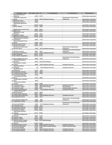 1 2 3 4 5 6 Nazwisko i imię Numer wpisu na listęNr I st specjalizacji Anacka-Krawczuk Marzena 4432 6187 Anfolecka Agnieszka Anna 2718 4872 Analityka kliniczna Badowski Jerzy 4472 Bartkowska Janina 2689 Bednarska Marzanna Ewa 14790 12160 Bicka Joanna 10025 3988 II st specjalizacji Województwo Warmińsko-mazurskie laboratoryjna diagnostyka medyczna Warmińsko-mazurskie Warmińsko-mazurskie Warmińsko-mazurskie warmińsko-mazurskie Warmińsko-mazurskie 7 Bieńkowska-Iwanik Anna 8 Bilbin Ewa Błaśkiewicz Lidia 9 Grażyna 10 Błażewicz Aneta 11 Błażewicz Ewa Karolina Boguszewska-Cichocka 12 Stanisława Bona-Kuchejda Emilia 13 Marta 14 Borzymowska Anna 15 Broda Przemysław Brodowska-Adamusiak 16 Dorota Iwona 9944 5672 13242 10333 Warmińsko-mazurskie warmińsko-mazurskie 11401 7417 12929 9799 14792 12162 Warmińsko-mazurskie warmińsko-mazurskie warmińsko-mazurskie 17 18 19 20 2651 1241 2733 2282 Analityka kliniczna 14421 11736 14793 12163 Brożyna Urszula Brudnicka Aleksandra Bruś Sergiusz Bryl Milena Magdalena 2683 7115 Warmińsko-mazurskie 11698 9274 7663 5319 15080 12477 Warmińsko-mazurskie Warmińsko-mazurskie warmińsko-mazurskie 2756 1252 Analityka kliniczna 21 Brym Małgorzata Anna Brzostek Katarzyna 22 Krystyna Brzozowska Violetta 23 Felicja Bujnowski Adam 24 Grzegorz Busińska Anna 25 Katarzyna 26 Chądzyński Tomasz 27 Chęcmanowska Iwona 28 Chmielewska Beata Chmielewska-Kuriata 29 Anna Chojnowska Leokadia 30 Ewa Chrzanowska Maria 31 Teresa 32 Cieplińska Ewa 33 Cieplińska Teresa 34 Ciepliński Jacek 35 Cieszyńska Bogumiła Cieśluk-Olchowska 36 Beata Renata 37 Cygler Maria Grażyna 38 Cyranowska Katarzyna 39 Czaplińska Hanna 9958 2688 4434 8268 6575 8388 4806 Analityka kliniczna 4698 Mikrobiologia 6907 125 Analityka kliniczna 6402 12661 4443 4460 4805 9492 5288 Analityka kliniczna 1810 40 Czaplińska Małgorzata 41 Czarnecka Lucyna 2702 2659 42 43 44 45 46 47 48 49 50 51 52 53 54 55 56 57 Czerniak Elżbieta Czerwiak Irena Czubińska Karolina Dakowska Adriana Dawidziuk Kamila Dąbrowska Patrycja Jolanta Demidziuk Małgorzata Izabella Dębska Agata Dębska Joanna Dobrzeniecka Longina Dolewska Aleksandra Danuta Doliwa-Adamus Anna Doraczyńska Beata Doroszuk Magda Drozdowska Beata Drozdowski Marek laboratoryjna diagnostyka medyczna Laboratoryjna transfuzjologia medyczna Analityka kliniczna laboratoryjna transfuzjologia medyczna Warmińsko-mazurskie Warmińsko-mazurskie Warmińsko-mazurskie warmińsko-mazurskie warmińsko-mazurskie 2648 1244 Warmińsko-mazurskie 8958 5643 Mikrobiologia 2686 7505 Analityka kliniczna Analityka kliniczna Warmińsko-mazurskie 23 342 Analityka kliniczna Analityka kliniczna Warmińsko-mazurskie Warmińsko-mazurskie 2727 2677 2714 2720 902 1029 5368 Warmińsko-mazurskie Warmińsko-mazurskie Warmińsko-mazurskie Warmińsko-mazurskie 2725 4550 Warmińsko-mazurskie 4445 Warmińsko-mazurskie 684 1030 2703 471 Analityka kliniczna 2730 472 14665 12016 13979 11219 13488 10643 Analityka kliniczna Mikrobiologia mikrobiologia medyczna Analityka kliniczna Analityka kliniczna laboratoryjna transfuzjologia medyczna laboratoryjna transfuzjologia medyczna Warmińsko-mazurskie Warmińsko-mazurskie Warmińsko-mazurskie Warmińsko-mazurskie Warmińsko-mazurskie Warmińsko-mazurskie Warmińsko-mazurskie Warmińsko-mazurskie Warmińsko-mazurskie Warmińsko-mazurskie Warmińsko-mazurskie Warmińsko-mazurskie Warmińsko-mazurskie warmińsko-mazurskie warmińsko-mazurskie warmińsko-mazurskie 14277 11592 warmińsko-mazurskie 5862 5104 2723 4897 14973 12365 4469 11570 Mikrobiologia Warmińsko-mazurskie Warmińsko-mazurskie warmińsko-mazurskie Warmińsko-mazurskie 13282 10394 4444 9868 Analityka kliniczna 9739 11383 higiena epidemiologia 11934 8546 2687 5640 Analityka kliniczna 2678 7477 Analityka kliniczna Analityka kliniczna higiena epidemiologia Analityka kliniczna Analityka kliniczna warmińsko-mazurskie Warmińsko-mazurskie Warmińsko-mazurskie Warmińsko-mazurskie Warmińsko-mazurskie Warmińsko-mazurskie 58 59 60 61 62 63 64 65 Dryhynycz Kariona Dryl Katarzyna Duda Barbara Grażyna Dudek Joanna Dudzińska Wiesława Dudziński Wiesław Dynowska Maria Dziedziech Małgorzata 66 Dźwilewska Maria Dźwinel-Mikłaszewicz 67 Danuta 68 Ejsmont Katarzyna 69 Fedus Andrzej 70 71 72 73 Fiedorowicz Dorota Fijorek Lilia Filipkowska Jolanta Frąszczak Małgorzata Fudala Andrzej 74 Włodzimierz 75 Gago Teresa 76 77 78 79 Garbula Elżbieta Gawrylczyk Hanna Olga Gębarska Urszula Gida Agata 80 Giedrojć Bożena 81 Gierszyńska Sylwia 82 83 84 85 86 87 88 Giesek Anna Głowacka Barbara Głuszuk Janina Gocławska Anna Górna Magdalena Maria Górniak Kinga Górska Anna Grabowska-Maciorowska 89 Joanna Gralewska Dominika 90 Agnieszka 91 Grudzień Małgorzata 2654 1240 2644 897 31 226 Analityka kliniczna 13712 10857 2762 690 Analityka kliniczna 2763 691 Analityka kliniczna 6590 2671 2098 Mikrobiologia 9051 8246 9995 2739 Analityka kliniczna Mikrobiologia Analityka kliniczna Warmińsko-mazurskie Warmińsko-mazurskie Warmińsko-mazurskie warmińsko-mazurskie Warmińsko-mazurskie Warmińsko-mazurskie Warmińsko-mazurskie Warmińsko-mazurskie Warmińsko-mazurskie 5304 Warmińsko-mazurskie 5860 11132 5865 4468 4168 5615 Analityka kliniczna analityka kliniczna; 2557 mikrobiologia 4923 7730 Analityka kliniczna 2200 5855 7769 Analityka kliniczna 6581 3415 Analityka kliniczna 2646 1239 6591 6253 13294 10434 15097 12494 4425 7440 laboratoryjna transfuzjologia medyczna laboratoryjna transfuzjologia medyczna Diagnostyka laboratoryjna Mikrobiologia Warmińsko-mazurskie Warmińsko-mazurskie Warmińsko-mazurskie Warmińsko-mazurskie Diagnostyka laboratoryjna laboratoryjna diagnostyka medyczna laboratoryjna transfuzjologia medyczna Warmińsko-mazurskie Mikrobiologia Warmińsko-mazurskie Warmińsko-mazurskie Warmińsko-mazurskie warmińsko-mazurskie warmińsko-mazurskie Warmińsko-mazurskie Warmińsko-mazurskie 5305 2658 685 2731 730 6582 3843 Analityka kliniczna 6578 6545 13246 10337 13251 10341 2761 988