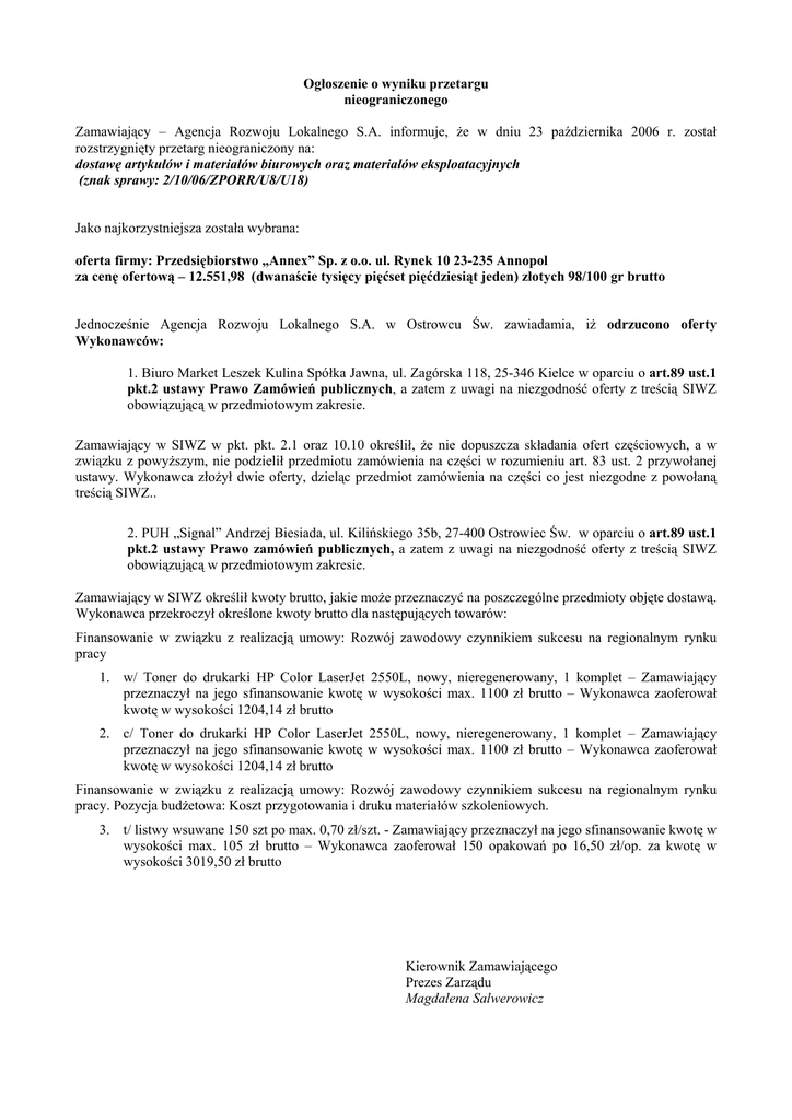 Ogłoszenie o wyniku przetargu nieograniczonego Zamawiający – Agencja Rozwoju Lokalnego S.A. informuje, że w dniu 23 października 2006 r. został rozstrzygnięty przetarg nieograniczony na: dostawę artykułów i materiałów biurowych oraz materiałów eksploatacyjnych (znak sprawy: 2/10/06/ZPORR/U8/U18) Jako najkorzystniejsza została wybrana: oferta firmy: Przedsiębiorstwo „Annex” Sp. z o.o. ul. Rynek 10 23-235 Annopol za cenę ofertową – 12.551,98 (dwanaście tysięcy pięćset pięćdziesiąt jeden) złotych 98/100 gr brutto Jednocześnie Agencja Rozwoju Lokalnego S.A. w Ostrowcu Św. zawiadamia, iż odrzucono oferty Wykonawców: 1. Biuro Market Leszek Kulina Spółka Jawna, ul. Zagórska 118, 25-346 Kielce w oparciu o art.89 ust.1 pkt.2 ustawy Prawo Zamówień publicznych, a zatem z uwagi na niezgodność oferty z treścią SIWZ obowiązującą w przedmiotowym zakresie. Zamawiający w SIWZ w pkt. pkt. 2.1 oraz 10.10 określił, że nie dopuszcza składania ofert częściowych, a w związku z powyższym, nie podzielił przedmiotu zamówienia na części w rozumieniu art. 83 ust. 2 przywołanej ustawy. Wykonawca złożył dwie oferty, dzieląc przedmiot zamówienia na części co jest niezgodne z powołaną treścią SIWZ.. 2. PUH „Signal” Andrzej Biesiada, ul. Kilińskiego 35b, 27-400 Ostrowiec Św. w oparciu o art.89 ust.1 pkt.2 ustawy Prawo zamówień publicznych, a zatem z uwagi na niezgodność oferty z treścią SIWZ obowiązującą w przedmiotowym zakresie. Zamawiający w SIWZ określił kwoty brutto, jakie może przeznaczyć na poszczególne przedmioty objęte dostawą. Wykonawca przekroczył określone kwoty brutto dla następujących towarów: Finansowanie w związku z realizacją umowy: Rozwój zawodowy czynnikiem sukcesu na regionalnym rynku pracy 1. w/ Toner do drukarki HP Color LaserJet 2550L, nowy, nieregenerowany, 1 komplet – Zamawiający przeznaczył na jego sfinansowanie kwotę w wysokości max. 1100 zł brutto – Wykonawca zaoferował kwotę w wysokości 1204,14 zł brutto 2. c/ Toner do drukarki HP Color LaserJet 2550L, nowy, nieregenerowany, 1 komplet – Zamawiający przeznaczył na jego sfinansowanie kwotę w wysokości max. 1100 zł brutto – Wykonawca zaoferował kwotę w wysokości 1204,14 zł brutto Finansowanie w związku z realizacją umowy: Rozwój zawodowy czynnikiem sukcesu na regionalnym rynku pracy. Pozycja budżetowa: Koszt przygotowania i druku materiałów szkoleniowych. 3. t/ listwy wsuwane 150 szt po max. 0,70 zł/szt. - Zamawiający przeznaczył na jego sfinansowanie kwotę w wysokości max. 105 zł brutto – Wykonawca zaoferował 150 opakowań po 16,50 zł/op. za kwotę w wysokości 3019,50 zł brutto Kierownik Zamawiającego Prezes Zarządu Magdalena Salwerowicz