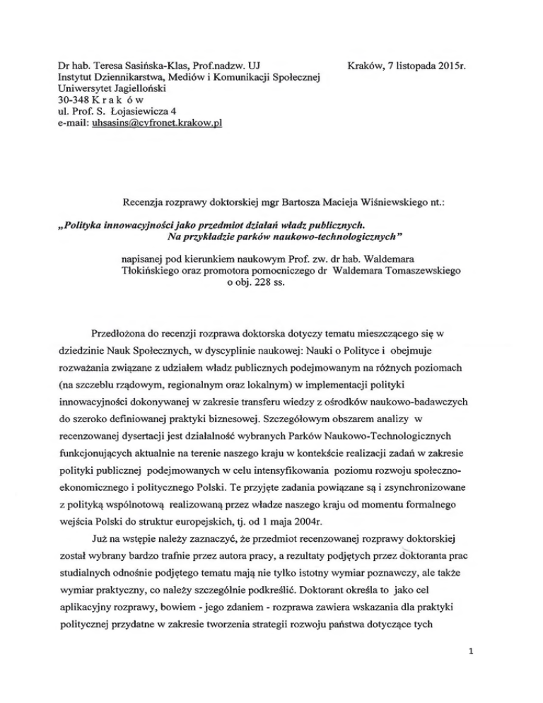 Dr hab. Teresa Sasińska-Klas, Prof.nadzw. UJ Instytut Dziennikarstwa, Mediów i Komunikacji Społecznej Uniwersytet Jagielloński 30-348 K r a k ó w ul. Prof. S. Łojasiewicza 4 e-mail: [email protected] Kraków, 7 listopada 2015r. Recenzja rozprawy doktorskiej mgr Bartosza Macieja Wiśniewskiego nt.: „Polityka innowacyjności jako przedmiot działań władz publicznych. Na przykładzie parków naukowo-technologicznych” napisanej pod kierunkiem naukowym Prof. zw. dr hab. Waldemara Tłokińskiego oraz promotora pomocniczego dr Waldemara Tomaszewskiego o obj. 228 ss. Przedłożona do recenzji rozprawa doktorska dotyczy tematu mieszczącego się w dziedzinie Nauk Społecznych, w dyscyplinie naukowej: Nauki o Polityce i obejmuje rozważania związane z udziałem władz publicznych podejmowanym na różnych poziomach (na szczeblu rządowym, regionalnym oraz lokalnym) w implementacji polityki innowacyjności dokonywanej w zakresie transferu wiedzy z ośrodków naukowo-badawczych do szeroko definiowanej praktyki biznesowej. Szczegółowym obszarem analizy w recenzowanej dysertacji jest działalność wybranych Parków Naukowo-Technologicznych funkcjonujących aktualnie na terenie naszego kraju w kontekście realizacji zadań w zakresie polityki publicznej podejmowanych w celu intensyfikowania poziomu rozwoju społecznoekonomicznego i politycznego Polski. Te przyjęte zadania powiązane są i zsynchronizowane z polityką wspólnotową realizowaną przez władze naszego kraju od momentu formalnego wejścia Polski do struktur europejskich, tj. od 1 maja 2004r. Już na wstępie należy zaznaczyć, że przedmiot recenzowanej rozprawy doktorskiej został wybrany bardzo trafnie przez autora pracy, a rezultaty podjętych przez doktoranta prac studialnych odnośnie podjętego tematu mają nie tylko istotny wymiar poznawczy, ale także wymiar praktyczny, co należy szczególnie podkreślić. Doktorant określa to jako cel aplikacyjny rozprawy, bowiem - jego zdaniem - rozprawa zawiera wskazania dla praktyki politycznej przydatne w zakresie tworzenia strategii rozwoju państwa dotyczące tych obszarów działań, które nie są bezpośrednio powiązane z procesem tworzenia nowych regulacji prawnych, tak istotnych dla działań podejmowanych przez państwo w zakresie inicjowania polityki innowacyjnej, ale działań zmierzających w kierunku osiągnięcia spójności na różnych poziomach i wymiarach rozwoju społeczno-ekonomicznego i politycznego kraju, wymiany informacji niezbędniej w procesie kształtowania społeczeństwa opartego na wiedzy oraz propagowania znaczenia i przydatności innowacji jako czynnika stymulującego rozwój społeczeństwa w jego wielorakich wymiarach. Innymi słowy, uwaga badawcza autora pracy skupia się na ukazaniu roli tzw. miękkich czynników zmiany w procesie stymulowania innowacyjności w wymiarze ekonomicznym, politycznym i społecznym w kontekście budowania społeczeństwa opartego na wiedzy. Ten cel rozprawy należy ocenić bardzo wysoko, bowiem wnosi on istotne ustalenia, które mogą być zaaplikowane w praktycznym wymiarze działania instytucji władzy publicznej w naszym kraju. Zadanie to zrealizowane zostało przez autora rozprawy doktorskiej w sposób wysoce poprawny i znalazło to wyraz w wysokiej jakości i rzetelności dokonanych ustaleń dotyczących niełatwego w realizacji tematu oraz wnioskowania z zebranych informacji (czyli, sposobu wykorzystania źródeł zastanych i wywołanych). W rozprawie Autor podjął się analizy procesu realizacji polityki innowacyjności w oparciu o funkcjonowanie w ostatnim dwudziestoleciu Parków Naukowo-Technologicznych jakopodmiotów uczestniczących w transferze technologii z sektora nauki do biznesu. W realizacji tematu doktorant wykazał otwartość poznawczą śledząc zaangażowanie różnych szczebli władzy w tworzenie, a także implementację polityki innowacyjności w Polsce. Rozprawa wpisuje się w obszar poznawczy dotyczący pragmatyki funkcjonowaniasystemu politycznego RP z jednoczesnym ukierunkowaniem rozważań w stronę teorii polityki, bowiem zebrane przez autora rozprawy dane empiryczne, które wykorzystane zostały dla analizy aspektów pragmatyczno-realizacyjnych wybranych i opisanych elementów systemu politycznego stanowić winny - w jego opinii - cenny materiał dla nowych ujęć oraz interpretacji teoriopolitycznych dotyczących polityki rozwoju, która ma wysoce dynamiczny charakter. Tytuł rozprawy w pełni odpowiada zawartości treściowej recenzowanego tekstu. Rozprawa została podzielona na pięć rozdziałów oraz opatrzona Wstępem i Zakończeniem. We Wstępie zawarł Autor podstawowe dla rozprawy informacje dotyczące założeń i celów pracy, a ponadto przywołania źródłowe istotne dla ’’ustawienia” tematu rozprawy oraz przedstawił przyjęte założenia metodologiczne. Literatura przedmiotu, na której oparte zostały założenia dotyczące zarówno samego problemu badawczego, jak i uzyskanych w badaniach empirycznych rezultatów obrazuje aktualne stanowiska krajowe i zagraniczne dotyczące polityki w zakresie rozwijania innowacyjności. Przedstawiony na końcu pracy wykaz bibliograficzny dzieł i cytowanych dokumentów przedstawia to, co powinno się w analizie tematu uwzględnić w zakresie pozycji podstawowych i jest zgodny ze standardami obowiązującymi w rozprawach dysertacyjnych. Dodatkowo wzbogacony został o źródła internetowe. Autor we Wstępie do pracy sformułował następujące pytania badawcze: Jaki jest realny udział władzy politycznej różnych szczebli w realizacji polityki innowacyjności na przykładzie działalności takich instytucji jak Parki Naukowo-Teclinologiczne? Jest to pytanie wskazujące jednocześnie, co stanowi główny problem badawczy rozprawy. Pozostałe pytania badawcze sformułowane są następująco: Jak przedstawia się proces ewolucji instytucji transferu wiedzy z nauki do biznesu? Jaka jest relacja polityki rozwoju wobec polityki 