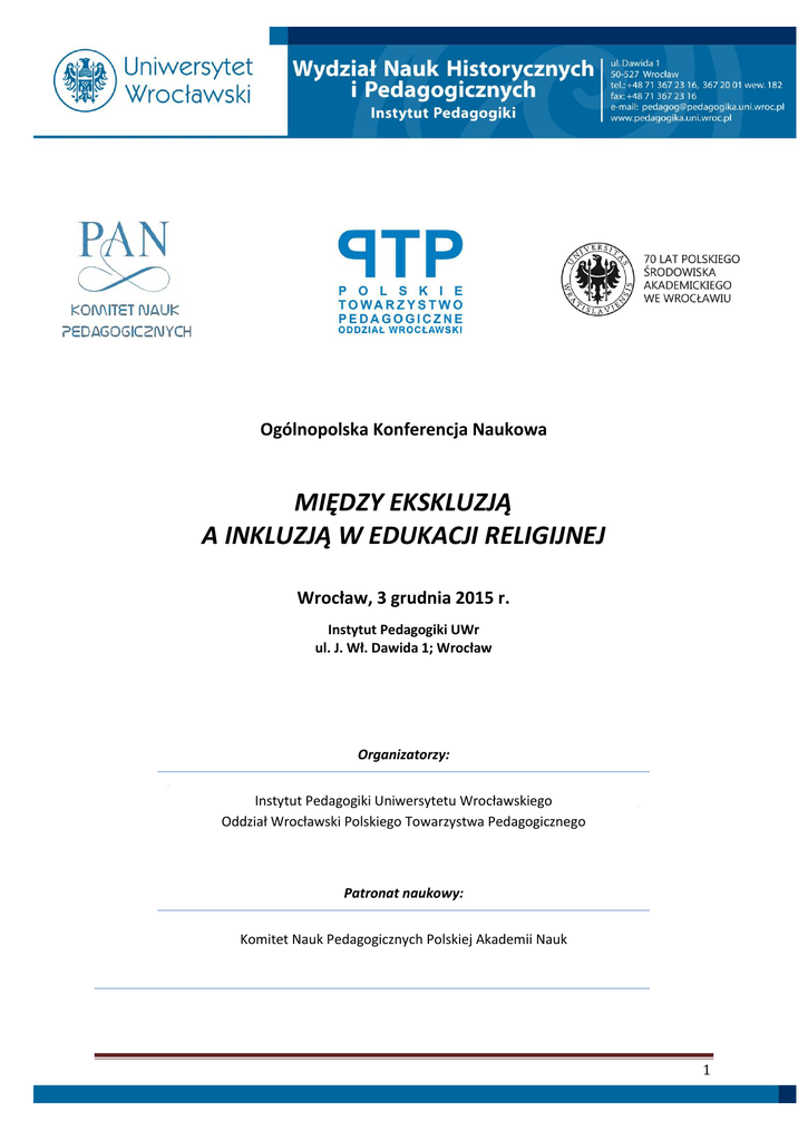 Ogólnopolska Konferencja Naukowa MIĘDZY EKSKLUZJĄ A INKLUZJĄ W EDUKACJI RELIGIJNEJ Wrocław, 3 grudnia 2015 r. Instytut Pedagogiki UWr ul. J. Wł. Dawida 1; Wrocław Organizatorzy: Instytut Pedagogiki Uniwersytetu Wrocławskiego Oddział Wrocławski Polskiego Towarzystwa Pedagogicznego Patronat naukowy: Komitet Nauk Pedagogicznych Polskiej Akademii Nauk 1 Przewodniczący Konferencji: dr hab. Wiktor Żłobicki, prof. UWr Komitet naukowy Konferencji: prof. zw. dr hab. Stanisław Obirek – Uniwersytet Warszawski prof. zw. dr hab. Tomasz Szkudlarek – Uniwersytet Gdański ks. prof. zw. dr hab. Piotr Moskal – Katolicki Uniwersytet Lubelski ks. prof. zw. dr hab. Stanisław Rabiej - Uniwersytet Opolski prof. zw. dr hab. Mirosław Patalon - Akademia Pomorska w Słupsku prof. zw. dr hab. Zbigniew Drozdowicz – Uniwersytet Adama Mickiewicza prof. zw. dr hab. Józef Baniak - – Uniwersytet Adama Mickiewicza dr hab. Bogusław Milerski, prof. ChAT – Chrześcijańska Akademia Teologiczna ks. dr hab. Dariusz Stępkowski, prof. UKSW – Uniwersytet Kardynała Stefana Wyszyńskiego dr hab. Mirosław Kowalski, prof. UZ – Uniwersytet Zielonogórski dr hab. Kalina Wojciechowska, prof. ChAT - Chrześcijańska Akademia Teologiczna dr hab. Wojciech Szczerba, prof. EWST – Ewangelikalna Wyższa Szkoła Teologiczna Sekretarze Konferencji: dr Monika Humeniuk – Walczak [email protected]; tel. 791270216 dr Iwona Paszenda [email protected] Komitet organizacyjny Konferencji: dr Grażyna Lubowicka dr Ewa Musiał dr Rafał Włodarczyk dr Michał Boczar dr Jacek Gulanowski II rok studiów licencjackich stacjonarnych, specjalność POzT Czasopisma Komitetu Nauk Pedagogicznych PAN lub zespołów Komitetu Nauk Pedagogicznych PAN: Rocznik Pedagogiczny: www.staff.amu.edu.pl/~pedszkol/rocznik_pedagogiczny Studia Pedagogiczne: www.spedagogiczne.ptp-pl.org Studia z Teorii Wychowania: http://wydawnictwo.chat.edu.pl/studia-z-teorii-wychowania/ Problemy Wczesnej Edukacji: www.pwe.ug.edu.pl Pedagogika Społeczna: www.pedagogium.pl/strona/64/pedagogika_spoleczna/ Biuletyn Historii Wychowania: www.historiawychowania.amu.edu.pl/biuletyn.html Przegląd Pedagogiczny: www.przegladpedagogiczny.ukw.edu.pl 2 Ogólnopolska Konferencja Naukowa MIĘDZY EKSKLUZJĄ A INKLUZJĄ W EDUKACJI RELIGIJNEJ Wrocław, 3 grudnia 2015 r. RAMOWY PROGRAM KONFERENCJI CZWARTEK, 3 GRUDNIA 2015 8.15 – 9.00 Rejestracja uczestników – biuro konferencji (parter) Szatnia – niski parter 9.00 – 9.15 Uroczyste rozpoczęcie konferencji - Aula UTW (parter) 9 .15 –11.00 Panel ekspercki cz. 1 - Aula UTW (parter) 11.00 – 11.15 Przerwa kawowa – s. 60 (III piętro) 11.15 – 13.00 Panel ekspercki cz. 2 - Aula UTW (parter) 13.00 – 13.45 Przerwa obiadowa - s. 60 (III piętro) 13.45 – 15.15 Obrady w sekcjach cz. 1. SEKCJE: 1,2,3 – s. 44 (I p), 32 (I p), 26 (parter) 15.15 – 15.30 Przerwa kawowa - s. 60 (III piętro) 15.30 – 17.00 Obrady w sekcjach cz. 2. SEKCJE: 4, 5 - s. 44 (I p), 32 (I p) 17.00 – 17.15 Zakończenie konferencji – s. 32 (I p) 3 SZCZEGÓŁOWY PROGRAM OBRAD 8.15 – 9.00 Rejestracja uczestników – biuro konferencji 9.00 – 9.15 Uroczyste rozpoczęcie konferencji 9.15 –11.00 Panel ekspercki cz. 1 FILOZOFICZNY, TEOLOGICZNY I PEDAGOGICZNY KONTEKST EDUKACJI RELIGIJNEJ Aula UTW parter ks. prof. zw. dr hab. Piotr Moskal, KUL (Lublin) Filozofia religii a filozofia edukacji religijnej (wybrane aspekty) dr hab. Wojciech Szczerba, prof. EWST (Wrocław) Koncepcja uniwersalnego zakresu zbawienia (inkluzywizm eschatologiczny) a edukacja religijna dr hab. Kalina Wojciechowska, prof. ChAT (Warszawa) Nauki dla wybranych. Elementy ekskluzywizmu w nauczaniu Jezusa według ewangelisty Marka mgr Łukasz Skurczyński, INALCO (Paryż), ChAT (Warszawa), Artes Liberales UW (Warszawa) Teologia postępowa jako teologia inkluzywna oraz jej praktyczne zastosowanie na przykładzie Center for Progressive Christianity dr Barbara Surma, Akademia Ignatianum (Kraków) Konstruowanie narracyjnej tożsamości religijnej dziecka w koncepcji Sofii Cavalletti 11.00 –11.15 Przerwa kawowa III piętro, s. 60 11.15 – 13.00 Aula UTW parter Panel ekspercki cz. 2 MIĘDZY EKSKLUZJĄ A INKLUZJĄ W EDUKACJI RELIGIJNEJ – WYZWANIA WSPÓŁCZESNOŚCI ks. prof. zw. dr hab. Stanisław Rabiej, UO (Opole) Drogi porzucania „kultury wykluczenia” w pedagogii Kościoła. Casus Papieża Franciszka ks. dr hab. Jan Klinkowski, prof. PWT (Wrocław) Wyzwania kulturowo-religijne w Europie wobec wielkiej współczesnej migracji ludzi mgr Aleksandra Wilczura, UJ (Kraków) Od edukacji do konwersji. Konwersje na judaizm i islam w wybranych środowiskach akademickich w Polsce po 2000 roku dr Katarzyna Jędrzejczyk-Kuliniak WSOWL (Wrocław) Dawah - obowiązek religijny czy narzędzie w rękach fundamentalistów? Misyjne radykalne ugrupowania muzułmańskie Dyskusja 13.00 – 13.45 Przerwa obiadowa III piętro, s. 60 4 OBRADY W SEKCJACH CZ. I - SEKCJE 1,2 3 GODZ. 13.45 – 15.15 SEKCJA 1 Moderacja: ks. prof. zw. dr hab. Piotr Moskal KUL (Lublin) piętro II; s. 44 SEKCJA 2 EDUKACJA RELIGIJNA W UJĘCIU HISTORYCZNYM I KULTUROWYM mgr Anna Sanecka ChAT (Warszawa) Dzielnica Wzajemnego Szacunku Czterech Wyznań i realizowane w niej programy pedagogiczne oraz ich edukacyjny potencjał dr Tomasz Dariusz Mames ChAT (Warszawa) Edukacja religijna w Kościołach mniejszościowych - inkluzja tradycji i pytania tożsamościowe na przykładzie Kościoła Starokatolickiego Mariawitów dr Radosław Łazarz EWST (Wrocław) Przestrzenie edukacji kobiet w reformacyjnej Europie mgr Edyta Wolny UW (Warszawa); Nauczanie kultury osobistej w ramach nauczania religii muzułmańskiej w rządowych szkołach podstawowych we współczesnym Egipcie PSYCHOSPOŁECZNE UWARUNKOWANIA EDUKACJI RELIGIJNEJ piętro I; s. 32 Moderacja: dr hab. Kalina Wojciechowska prof. ChAT (Warszawa) dr Andrzej Molenda UJ (Kraków) Przezwyciężanie projekcji zadaniem edukacji religijnej SEKCJA 3 Moderacja: ks. prof. zw. dr hab. Stanis