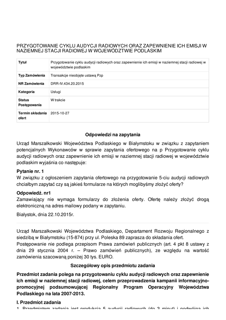 PRZYGOTOWANIE CYKLU AUDYCJI RADIOWYCH ORAZ ZAPEWNIENIE ICH EMISJI W NAZIEMNEJ STACJI RADIOWEJ W WOJEWÓDZTWIE PODLASKIM Tytuł Przygotowanie cyklu audycji radiowych oraz zapewnienie ich emisji w naziemnej stacji radiowej w województwie podlaskim Typ Zamówienia Transakcje nieobjęte ustawą Pzp NR Zamówienia DRR-IV.434.20.2015 Kategoria Usługi Status Postępowania W trakcie Termin składania ofert 2015-10-27 Odpowiedzi na zapytania Urząd Marszałkowski Województwa Podlaskiego w Białymstoku w związku z zapytaniem potencjalnych Wykonawców w sprawie zapytania ofertowego na p Przygotowanie cyklu audycji radiowych oraz zapewnienie ich emisji w naziemnej stacji radiowej w województwie podlaskim wyjaśnia co następuje: Pytanie nr. 1 W związku z ogłoszeniem zapytania ofertowego na przygotowanie 5-ciu audycji radiowych chciałbym zapytać czy są jakieś formularze na których moglibyśmy złożyć oferty? Odpowiedź. nr1 Zamawiający nie wymaga formularzy do złożenia oferty. Ofertę należy złożyć drogą elektroniczną na adres mailowy podany w zapytaniu. Białystok, dnia 22.10.2015r. Urząd Marszałkowski Województwa Podlaskiego, Departament Rozwoju Regionalnego z siedzibą w Białymstoku (15-874) przy ul. Poleska 89 zaprasza do składania ofert. Postępowanie nie podlega przepisom Prawa zamówień publicznych (art. 4 pkt 8 ustawy z dnia 29 stycznia 2004 r. – Prawo zamówień publicznych), ze względu na wartość zamówienia szacowaną poniżej 30 tys. EURO. Szczegółowy opis przedmiotu zadania Przedmiot zadania polega na przygotowaniu cyklu audycji radiowych oraz zapewnienie ich emisji w naziemnej stacji radiowej, celem przeprowadzenia kampanii informacyjnopromocyjnej podsumowującej Regionalny Program Operacyjny Województwa Podlaskiego na lata 2007-2013. I. Przedmiot zadania 1. Przedmiotem zadania jest produkcja 5 audycji radiowych (do 3 minut) i podwójna ich 1. Przedmiotem zadania jest produkcja 5 audycji radiowych (do 3 minut) i podwójna ich emisja na antenie naziemnej stacji radiowej o zasięgu co najmniej 80 % województwa podlaskiego przez 5 kolejnych dni od poniedziałku do piątku. 2. Pierwsza emisja audycji w porannym paśmie antenowym, przed/po serwisie informacyjnym, w godzinach 6.30-10.00. Powtórka audycji tego samego dnia w godzinach 15.30-18.00. Godziny emisji ustalone będą wspólnie z Zamawiającym. 3. Realizacja 5 konkursów dla słuchaczy po każdej audycji porannej. Pytania konkursowe nawiązujące do prezentowanego tematu w reportażu, które wyłonią co najmniej 5 zwycięzców. Konkurs przeprowadzony zostanie przez dziennikarza prowadzącego. Konkurs nie podlega przepisom Ustawy o grach hazardowych z dnia 19 listopada 2009 r. (Dz. U. z 2015 r. poz. 612). 4. Jako nagrody przekazane zostaną słuchaczom materiały promocyjne, będące własnością Zamawiającego, oznaczone logotypami RPOWP na lata 2007-2013; 5. W skład zadania wchodzi również kampania reklamowa polegająca na produkcji i emisji spotu reklamowego do 40 sekund emitowana przed cyklem audycji radiowych. 6. 70 emisji spotu reklamowego w radiu regionalnym o zasięgu co najmniej 80% województwa podlaskiego. 7. Wykonawca zapewni emisje audycji przez 1 tydzień na portalu internetowym radia. 8. Przygotowanie przez Wykonawcę audycji zgodnie z zaakceptowanymi przez Zamawiającego scenariuszami przygotowanymi na podstawie listy beneficjentów realizujących projekty na terenie całego województwa podlaskiego przekazanej przez Zamawiającego. Wykonawca każdorazowo na swój koszt dotrze do wskazanych obszarów tematycznych na terenie województwa podlaskiego w celu przygotowania materiałów audycji radiowych. 9. Nagranie audycji w terenie z wykorzystaniem naturalnego środowiska, dodatkowo dopuszcza efekty specjalne imitujące naturalne środowisko, gdy teren naturalny nie zapewni zamierzonego efektu. Wykonawca zapewni lektora, obróbkę dźwiękową i muzyczną materiału radiowego. 10. Zamawiający nie dopuszcza emisji audycji w paśmie reklamowym. 11. Na zakończenie zadania Wykonawca dostarczy Zamawiającemu wszystkie wyprodukowane materiały na nośniku DVD. II. Informacja o RPOWP Regionalny Program Operacyjny Województwa Podlaskiego na lata 2007-2013 stanowi jeden z elementów systemu realizacyjnego Narodowych Strategicznych Ram Odniesienia 2007-2013. Celem RPOWP jest zmniejszanie różnic w poziomie rozwoju województwa podlaskiego w stosunku do reszty kraju. W ramach RPOWP wspierane są działania m.in. z zakresu innowacyjności, rozwoju i zwiększania konkurencyjności przedsiębiorstw, budowy społeczeństwa informacyjnego, infrastruktury edukacyjnej, komunikacyjnej, ochrony zdrowia i ochrony środowiska, rewitalizacji turystyki i kultury. Działania RPOWP kierowane są m.in. do przedsiębiorców, instytucji otoczenia biznesu, jednostek samorządu terytorialnego, instytucji kultury, ochrony zdrowia, organizacji pozarządowych. III. Termin realizacji zadania Planowany czas emisji reportaży w lokalnej stacji radiowej o zasięgu co najmniej 80 % województwa podlaskiego, w terminie od 16 listopada do 20 listopada 2015 r., z zastrzeżeniem, iż termin rozpoczęcia emisji może ulec przesunięciu przez Zamawiającego o maksymalnie 7 dni, przy czym koniec emisji powinien nastąpić nie później niż 27 listopada maksymalnie 7 dni, przy czym koniec emisji powinien nastąpić nie później niż 27 listopada 2015r. IV. Cele oraz założenia kampanii 1. Cele kampanii informacyjno-promocyjnej RPOWP: a) przedstawienie wizerunku RPOWP na lata 2007-2013 jako programu mającego kluczowe znaczenie dla rozwoju gospodarczego i społecznego w regionie. b) promowanie „dobrych praktyk” wdrażania programu na podstawie wybranych projektów realizowanych w województwie podlaskim w ramach RPOWP na lata 2007-2013; c) budowanie wśród ogółu społeczeństwa pozytywnego wizerunku Unii Europejskiej oraz Regionalnego Programu Operacyjnego Województwa Podlaskiego na lata 2007-2013; d) zachęcen
