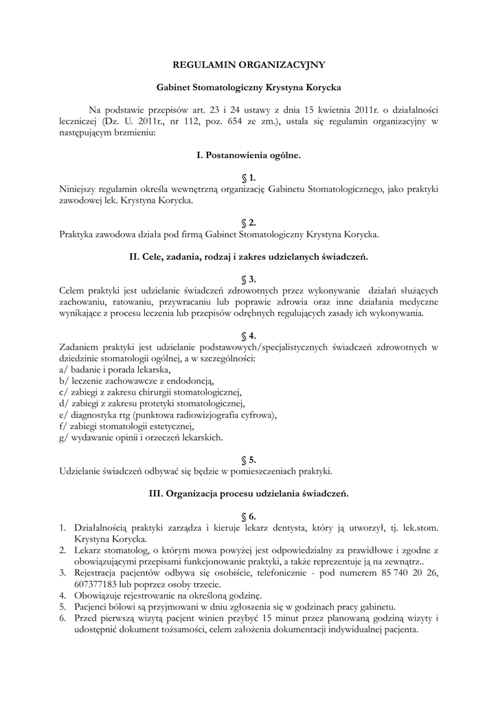 REGULAMIN ORGANIZACYJNY Gabinet Stomatologiczny Krystyna Korycka Na podstawie przepisów art. 23 i 24 ustawy z dnia 15 kwietnia 2011r. o działalności leczniczej (Dz. U. 2011r., nr 112, poz. 654 ze zm.), ustala się regulamin organizacyjny w następującym brzmieniu: I. Postanowienia ogólne. § 1. Niniejszy regulamin określa wewnętrzną organizację Gabinetu Stomatologicznego, jako praktyki zawodowej lek. Krystyna Korycka. § 2. Praktyka zawodowa działa pod firmą Gabinet Stomatologiczny Krystyna Korycka. II. Cele, zadania, rodzaj i zakres udzielanych świadczeń. § 3. Celem praktyki jest udzielanie świadczeń zdrowotnych przez wykonywanie działań służących zachowaniu, ratowaniu, przywracaniu lub poprawie zdrowia oraz inne działania medyczne wynikające z procesu leczenia lub przepisów odrębnych regulujących zasady ich wykonywania. § 4. Zadaniem praktyki jest udzielanie podstawowych/specjalistycznych świadczeń zdrowotnych w dziedzinie stomatologii ogólnej, a w szczególności: a/ badanie i porada lekarska, b/ leczenie zachowawcze z endodoncją, c/ zabiegi z zakresu chirurgii stomatologicznej, d/ zabiegi z zakresu protetyki stomatologicznej, e/ diagnostyka rtg (punktowa radiowizjografia cyfrowa), f/ zabiegi stomatologii estetycznej, g/ wydawanie opinii i orzeczeń lekarskich. § 5. Udzielanie świadczeń odbywać się będzie w pomieszczeniach praktyki. III. Organizacja procesu udzielania świadczeń. § 6. 1. Działalnością praktyki zarządza i kieruje lekarz dentysta, który ją utworzył, tj. lek.stom. Krystyna Korycka. 2. Lekarz stomatolog, o którym mowa powyżej jest odpowiedzialny za prawidłowe i zgodne z obowiązującymi przepisami funkcjonowanie praktyki, a także reprezentuje ją na zewnątrz.. 3. Rejestracja pacjentów odbywa się osobiście, telefonicznie - pod numerem 85 740 20 26, 607377183 lub poprzez osoby trzecie. 4. Obowiązuje rejestrowanie na określoną godzinę. 5. Pacjenci bólowi są przyjmowani w dniu zgłoszenia się w godzinach pracy gabinetu. 6. Przed pierwszą wizytą pacjent winien przybyć 15 minut przez planowaną godziną wizyty i udostępnić dokument tożsamości, celem założenia dokumentacji indywidualnej pacjenta. IV. Dokumentacja medyczna. § 7. 1. W praktyce dokumentacja medyczna prowadzona jest w formie tradycyjnej i elektronicznej. 2. Do prowadzenia elektronicznej dokumentacji medycznej wykorzystywany jest program KS-PPS firmy KAMSOFT, oraz oprogramowanie radiografii cyfrowej firmy SIRONA. 3. Tradycyjna dokumentacja medyczna prowadzona jest w postaci Kart Pacjenta. V. Opłaty za udostępnienie dokumentacji medycznej. § 8. 1. Dokumentacja medyczna jest udostępniana: do wglądu w siedzibie praktyki zawodowej, poprzez sporządzenie jej kserokopii, odpisów i wyciągów, poprzez wydanie oryginału za pokwitowaniem odbioru i z zastrzeżeniem zwrotu po wykorzystaniu na żądanie uprawnionych organów. 2. Na podstawie ustawy o prawach pacjenta i Rzeczniku Praw Pacjenta z dnia 6 listopada 2008 r. (Dz. U. z 2009r., nr 52, poz. 417 ze zm.) ustala się następujące opłaty za udostępnianie dokumentacji medycznej: 1 strona wyciągu lub odpisu 1 strona kserokopii Wyciąg, odpis lub kopia na elektronicznym nośniku (za całość) 0,002 przeciętnego 0,0002 przeciętnego 0,002 przeciętnego miesięcznego miesięcznego wynagrodzenia* miesięcznego wynagrodzenia* wynagrodzenia* 6,83zł 0,68zł 6,83zł * przeciętnego wynagrodzenia w poprzednim kwartale, począwszy od pierwszego dnia następnego miesiąca po ogłoszeniu przez Prezesa Głównego Urzędu Statystycznego w Dzienniku Urzędowym Rzeczypospolitej Polskiej „Monitor Polski” 3. Opłaty, o której mowa w ust. 1, nie pobiera się w przypadku udostępniania dokumentacji medycznej w związku z postępowaniem przed wojewódzką komisją do spraw orzekania o zdarzeniach medycznych. 4. Wskazana opłata nie obejmuje kosztów ewentualnej przesyłki, ani innych kosztów związanych z żądanym przez osobę uprawnioną sposobem wydania kserokopii, odpisów i wyciągów. VI. Opłaty za udzielanie świadczeń niefinansowanych ze środków publicznych. § 9. 1. Praktyka zawodowa lek.stom. Krystyny Koryckiej przewiduje udzielania świadczeń finansowanych ze środków publicznych na podstawie umowy z Narodowym Funduszem Zdrowia. 2. Za określone świadczenia zdrowotne, niefinansowane ze środków publicznych, pobierana jest opłata. Jej wysokości została określona w załączniku nr 1 do niniejszego regulaminu. 3. Informacje o wysokości opłat za: udostępnienie dokumentacji medycznej oraz udzielane – niefinansowane ze środków publicznych – świadczenia zdrowotne są podane do wiadomości pacjentów poprzez wywieszenie w punkcie rejestracji. VII. Bezpieczeństwo i przetwarzanie danych osobowych § 10. 1. W praktyce obowiązuje Polityka Bezpieczeństwa Ochrony i Przetwarzania Danych Osobowych. 2. Polityka wraz Instrukcją Zarządzania Systemem Informatycznym dostępne są do wglądu w siedzibie praktyki. VIII. Postanowienia końcowe. § 11. 1. W sprawach nieuregulowanych w niniejszym Regulaminie Organizacyjnym stosuje się przepisy: - ustawy o działalności z dnia 15 kwietnia 2011 r. o działalności leczniczej (Dz. U. z 2011r., nr 112, poz. 654 ze zm.), - ustawy o prawach pacjenta i Rzeczniku Praw Pacjenta z dnia 6 listopada 2008 r. (Dz. U. z 2009r., nr 52, poz. 417 ze zm.) 2. Regulamin wchodzi w życie z dniem wpisania praktyki do rejestru praktyk zawodowych prowadzonego przez Okręgową Izbę Lekarską w Białymstoku.