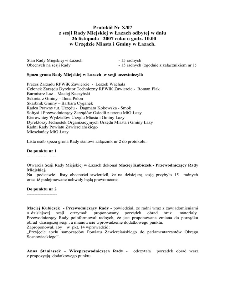 Protokół Nr X/07 z sesji Rady Miejskiej w Łazach odbytej w dniu 26 listopada 2007 roku o godz. 10.00 w Urzędzie Miasta i Gminy w Łazach. Stan Rady Miejskiej w Łazach Obecnych na sesji Rady - 15 radnych - 15 radnych (zgodnie z załącznikiem nr 1) Spoza grona Rady Miejskiej w Łazach w sesji uczestniczyli: Prezes Zarządu RPWiK Zawiercie - Leszek Wąchała Członek Zarządu Dyrektor Techniczny RPWiK Zawiercie - Roman Flak Burmistrz Łaz – Maciej Kaczyński Sekretarz Gminy – Ilona Pelon Skarbnik Gminy – Barbara Cyganek Radca Prawny tut. Urzędu - Dagmara Kokowska - Smok Sołtysi i Przewodniczący Zarządów Osiedli z terenu MiG Łazy Kierownicy Wydziałów Urzędu Miasta i Gminy Łazy Dyrektorzy Jednostek Organizacyjnych Urzędu Miasta i Gminy Łazy Radni Rady Powiatu Zawierciańskiego Mieszkańcy MiG Łazy Lista osób spoza grona Rady stanowi załącznik nr 2 do protokołu. Do punktu nr 1 ------------------Otwarcia Sesji Rady Miejskiej w Łazach dokonał Maciej Kubiczek - Przewodniczący Rady Miejskiej. Na podstawie listy obecności stwierdził, że na dzisiejszą sesję przybyło 15 radnych oraz iż podejmowane uchwały będą prawomocne. Do punktu nr 2 -------------------Maciej Kubiczek - Przewodniczący Rady - powiedział, że radni wraz z zawiadomieniami o dzisiejszej sesji otrzymali proponowany porządek obrad oraz materiały. Przewodniczący Rady poinformował radnych, że jest proponowana zmiana do porządku obrad dzisiejszej sesji , a mianowicie wprowadzenie dodatkowego punktu. Zaproponował, aby w pkt. 14 wprowadzić : „Przyjęcie apelu samorządów Powiatu Zawierciańskiego do parlamentarzystów Okręgu Sosnowieckiego”. Anna Staniaszek – Wiceprzewodnicząca Rady z propozycją dodatkowego punktu. odczytała porządek obrad wraz Przewodniczący Rady poddał pod głosowanie. Zapytał, czy ktoś z radnych wnosi uwagi do przedłożonego porządku obrad sesji. Uwag i propozycji zmian radni nie zgłosili. W głosowaniu udział brało 14 radnych. Rada Miejska w Łazach jednogłośnie ( 15 głosów za ) przyjęła porządek obrad sesji Rady Miejskiej w Łazach z dnia 26.11. 2007 roku jak niżej: 1.Otwarcie sesji i stwierdzenie quorum. 2.Zatwierdzenie porządku obrad. 3.Przyjęcie protokołu z sesji z dnia 29 października 2007 r. 4.Informacja dotycząca działalności Burmistrza Łaz i Urzędu za okres między sesjami Rady. 5.Interpelacje i zapytania radnych. 6.Podjęcie uchwały w sprawie zmian do budżetu Gminy Łazy na rok 2007. 7.Podjęcie uchwały w sprawie ustalenia zasad poboru podatku rolnego, podatku leśnego i podatku od nieruchomości. 8.Podjęcie uchwały w sprawie wysokości stawek podatku od nieruchomości na rok 2008 oraz zwolnień z podatku od nieruchomości.. 9.Podjęcie uchwały w sprawie ustalenia wysokości rocznych stawek podatku od środków transportowych. 10.Podjęcie uchwały w sprawie zatwierdzenia taryfy dla zbiorowego zaopatrzenia w wodę i zbiorowego odprowadzenia ścieków na terenie Gminy Łazy ustaloną przez Rejonowe Przedsiębiorstwo Wodociągów i Kanalizacji Spółka z o.o. w Zawierciu od 1 stycznia 2008 r. do 31 grudnia 2008 roku. 11.Podjęcie uchwały w sprawie przyjęcia na rok 2008 „Regulaminu wynagradzania nauczycieli zatrudnionych w placówkach oświatowych prowadzonych przez Gminę Łazy określającego wysokość oraz szczegółowe warunki obliczania i wypłacania wynagrodzenia zasadniczego oraz szczegółowe warunki obliczania i wypłacania wynagrodzenia za godziny ponadwymiarowe i godziny doraźnych zastępstw nauczycieli”. 12.Podjęcie uchwały w sprawie powiadomienia o obowiązku złożenia oświadczenia lustracyjnego dot. Sekretarza Gminy Łazy. 13.Podjęcie uchwały w sprawie powiadomienia o obowiązku złożenia oświadczenia lustracyjnego dot. Skarbnika Gminy Łazy. 14.Przyjęcie apelu samorządów Powiatu Zawierciańskiego do parlamentarzystów Okręgu Sosnowieckiego. 15.Odpowiedzi na interpelacje. 16.Zapytania i wolne wnioski. 17.Zamknięcie sesji. 2 Do punktu nr 3 Maciej Kubiczek – Przewodniczący Rady Miejskiej w Łazach – zapytał radnych, czy wnoszą uwagi do protokołu z sesji Rady Miejskiej w Łazach z dnia 29 października 2007 roku. Radni uwag nie wnieśli. Rada Miejska w Łazach przyjęła protokół w Łazach z dnia 29.10.2007r. przez aklamację Nr IX/07 z sesji Rady Miejskiej Do punktu nr 4. Maciej Kaczyński – Burmistrz Łaz sesjami Rady. - przedstawił informację dotyczącą prac między W/w informacja stanowi załącznik do protokołu. Do przedstawionej informacji radni nie zgłosili uwag. Przewodniczący Rady stwierdził, że informacja złożona przez Burmistrza Łaz została przyjęta przez Radę. Do punktu nr 5. Henryk Mogieła – radny zgłosił: - potrzebę remontu Szkoły Podstawowej w Ciągowicach ( uszkodzone drzwi wejściowe do szkoły, dach uszkodzony i przecieka woda do pomieszczeń ), radny dodał, że w ostatnią sobotę zgłosili się pracownicy do remontu dachu bez żadnych uzgodnień z dyrektorem szkoły i uważa, że tak nie powinno być, - iż w każdym roku są malowane klasy, jednak wychodzi grzyb i jest uczennica która jest uczulona na grzyba i nie może uczyć się w tej klasie, - zgłosił, że jest tylko jedna lampa oświetleniowa na terenie Szkoły , jest ciemno, było ostatnio włamanie, 3 - zwracając się do Burmistrza powiedział , że cieszy się, że Kuźnica Masłońska i Ciągowice mają piękne przystanki, jednak wokół wiaty przystankowej w Ciągowicach jest nieporządek, prosi o uporządkowanie tego terenu, - poprosił o spotkanie w sprawie kursowania autobusu PKS z Zawiercia przez Ciągowice do Sosnowca celem umożliwienia dojazdu mieszkańcom do pracy. Radna Marta Grzesia – zgłosiła, że mieszkańcy Chruszczobrodu nie mają możliwości dojazdu do pracy w sobotę i niedzielę, gdyż nie kursuje autobus i prosi o pomoc w tej sprawie, - zapytała, czy są w Chruszczobrodzie. już ustalenia dot. chodnika przy drodze marszałkowskiej Radny Władysław