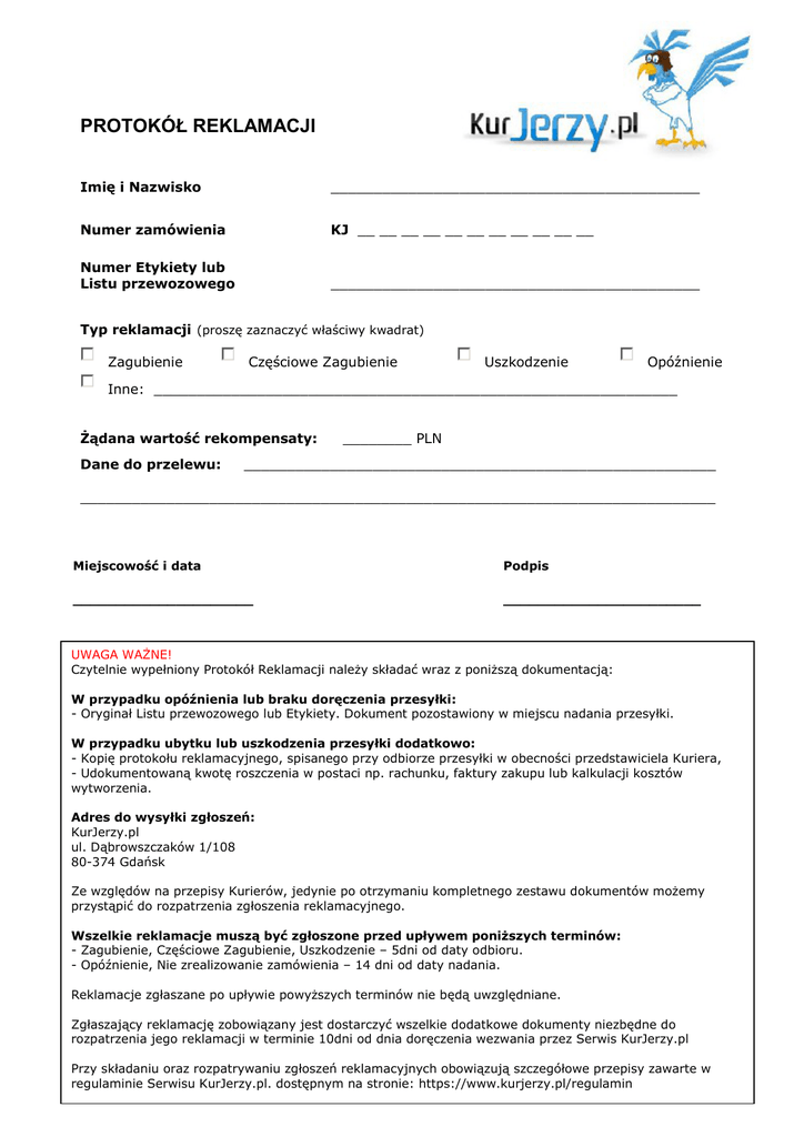 PROTOKÓŁ REKLAMACJI Imię i Nazwisko ___________________________________________ Numer zamówienia KJ __ __ __ __ __ __ __ __ __ __ __ Numer Etykiety lub Listu przewozowego ___________________________________________ Typ reklamacji (proszę zaznaczyć właściwy kwadrat) Zagubienie Częściowe Zagubienie Uszkodzenie Opóźnienie Inne: _____________________________________________________________ Żądana wartość rekompensaty: Dane do przelewu: ________ PLN _______________________________________________________ __________________________________________________________________________ Miejscowość i data Podpis _____________________ _______________________ UWAGA WAŻNE! Czytelnie wypełniony Protokół Reklamacji należy składać wraz z poniższą dokumentacją: W przypadku opóźnienia lub braku doręczenia przesyłki: - Oryginał Listu przewozowego lub Etykiety. Dokument pozostawiony w miejscu nadania przesyłki. W przypadku ubytku lub uszkodzenia przesyłki dodatkowo: - Kopię protokołu reklamacyjnego, spisanego przy odbiorze przesyłki w obecności przedstawiciela Kuriera, - Udokumentowaną kwotę roszczenia w postaci np. rachunku, faktury zakupu lub kalkulacji kosztów wytworzenia. Adres do wysyłki zgłoszeń: KurJerzy.pl ul. Dąbrowszczaków 1/108 80-374 Gdańsk Ze względów na przepisy Kurierów, jedynie po otrzymaniu kompletnego zestawu dokumentów możemy przystąpić do rozpatrzenia zgłoszenia reklamacyjnego. Wszelkie reklamacje muszą być zgłoszone przed upływem poniższych terminów: - Zagubienie, Częściowe Zagubienie, Uszkodzenie – 5dni od daty odbioru. - Opóźnienie, Nie zrealizowanie zamówienia – 14 dni od daty nadania. Reklamacje zgłaszane po upływie powyższych terminów nie będą uwzględniane. Zgłaszający reklamację zobowiązany jest dostarczyć wszelkie dodatkowe dokumenty niezbędne do rozpatrzenia jego reklamacji w terminie 10dni od dnia doręczenia wezwania przez Serwis KurJerzy.pl Przy składaniu oraz rozpatrywaniu zgłoszeń reklamacyjnych obowiązują szczegółowe przepisy zawarte w regulaminie Serwisu KurJerzy.pl. dostępnym na stronie: https://www.kurjerzy.pl/regulamin
