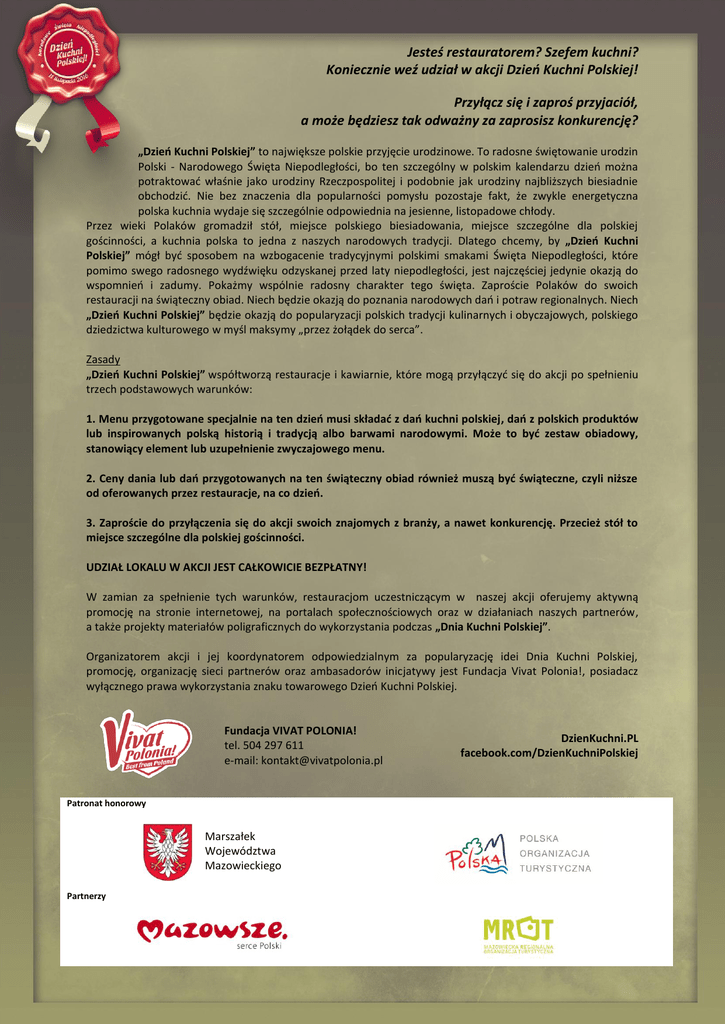 Jesteś restauratorem? Szefem kuchni? Koniecznie weź udział w akcji Dzień Kuchni Polskiej! Przyłącz się i zaproś przyjaciół, a może będziesz tak odważny za zaprosisz konkurencję? „Dzień Kuchni Polskiej” to największe polskie przyjęcie urodzinowe. To radosne świętowanie urodzin Polski - Narodowego Święta Niepodległości, bo ten szczególny w polskim kalendarzu dzień można potraktować właśnie jako urodziny Rzeczpospolitej i podobnie jak urodziny najbliższych biesiadnie obchodzić. Nie bez znaczenia dla popularności pomysłu pozostaje fakt, że zwykle energetyczna polska kuchnia wydaje się szczególnie odpowiednia na jesienne, listopadowe chłody. Przez wieki Polaków gromadził stół, miejsce polskiego biesiadowania, miejsce szczególne dla polskiej gościnności, a kuchnia polska to jedna z naszych narodowych tradycji. Dlatego chcemy, by „Dzień Kuchni Polskiej” mógł być sposobem na wzbogacenie tradycyjnymi polskimi smakami Święta Niepodległości, które pomimo swego radosnego wydźwięku odzyskanej przed laty niepodległości, jest najczęściej jedynie okazją do wspomnień i zadumy. Pokażmy wspólnie radosny charakter tego święta. Zaproście Polaków do swoich restauracji na świąteczny obiad. Niech będzie okazją do poznania narodowych dań i potraw regionalnych. Niech „Dzień Kuchni Polskiej” będzie okazją do popularyzacji polskich tradycji kulinarnych i obyczajowych, polskiego dziedzictwa kulturowego w myśl maksymy „przez żołądek do serca”. Zasady „Dzień Kuchni Polskiej” współtworzą restauracje i kawiarnie, które mogą przyłączyć się do akcji po spełnieniu trzech podstawowych warunków: 1. Menu przygotowane specjalnie na ten dzień musi składać z dań kuchni polskiej, dań z polskich produktów lub inspirowanych polską historią i tradycją albo barwami narodowymi. Może to być zestaw obiadowy, stanowiący element lub uzupełnienie zwyczajowego menu. 2. Ceny dania lub dań przygotowanych na ten świąteczny obiad również muszą być świąteczne, czyli niższe od oferowanych przez restauracje, na co dzień. 3. Zaproście do przyłączenia się do akcji swoich znajomych z branży, a nawet konkurencję. Przecież stół to miejsce szczególne dla polskiej gościnności. UDZIAŁ LOKALU W AKCJI JEST CAŁKOWICIE BEZPŁATNY! W zamian za spełnienie tych warunków, restauracjom uczestniczącym w naszej akcji oferujemy aktywną promocję na stronie internetowej, na portalach społecznościowych oraz w działaniach naszych partnerów, a także projekty materiałów poligraficznych do wykorzystania podczas „Dnia Kuchni Polskiej”. Organizatorem akcji i jej koordynatorem odpowiedzialnym za popularyzację idei Dnia Kuchni Polskiej, promocję, organizację sieci partnerów oraz ambasadorów inicjatywy jest Fundacja Vivat Polonia!, posiadacz wyłącznego prawa wykorzystania znaku towarowego Dzień Kuchni Polskiej. Fundacja VIVAT POLONIA! tel. 504 297 611 e-mail: [email protected] Patronat honorowy Marszałek Województwa Mazowieckiego Partnerzy DzienKuchni.PL facebook.com/DzienKuchniPolskiej