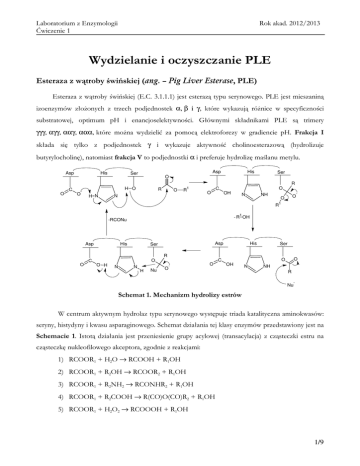 Laboratorium z Enzymologii Ćwiczenie 1 Rok akad. 2012/2013 Wydzielanie i oczyszczanie PLE Esteraza z wątroby świńskiej (ang. – Pig Liver Esterase, PLE) Esteraza z wątroby świńskiej (E.C. 3.1.1.1) jest esterazą typu serynowego. PLE jest mieszaniną izoenzymów złożonych z trzech podjednostek α, β i γ, które wykazują różnice w specyficzności substratowej, optimum pH i enancjoselektywności. Głównymi składnikami PLE są trimery γγγ, αγγ, ααγ, ααα, które można wydzielić za pomocą elektroforezy w gradiencie pH. Frakcja I składa się tylko z podjednostek γ i wykazuje aktywność cholinoesterazową (hydrolizuje butyrylocholinę), natomiast frakcja V to podjednostki α i preferuje hydrolizę maślanu metylu. Asp His Asp Ser His Ser O R C O H O - O H N R O 1 R N O C O OH N NH O O - 1 R 1 - R OH -RCONu Asp His Asp Ser His Ser R O O C O H N N H Nu O - O O O C OH N NH R Nu - Schemat 1. Mechanizm hydrolizy estrów W centrum aktywnym hydrolaz typu serynowego występuje triada katalityczna aminokwasów: seryny, histydyny i kwasu asparaginowego. Schemat działania tej klasy enzymów przedstawiony jest na Schemacie 1. Istotą działania jest przeniesienie grupy acylowej (transacylacja) z cząsteczki estru na cząsteczkę nukleofilowego akceptora, zgodnie z reakcjami: 1) RCOOR1 + H2O → RCOOH + R1OH 2) RCOOR1 + R2OH → RCOOR2 + R1OH 3) RCOOR1 + R2NH2 → RCONHR2 + R1OH 4) RCOOR1 + R2COOH → R(CO)O(CO)R2 + R1OH 5) RCOOR1 + H2O2 → RCOOOH + R1OH 1/9 Laboratorium z Enzymologii Ćwiczenie 1 Rok akad. 2012/2013 Jak widać z powyższych reakcji, PLE może katalizować reakcje hydrolizy, transesteryfikacji, tworzenia amidów, bezwodników kwasowych, nadkwasów. PLE charakteryzuje się dobrą stabilnością, stereoselektywnością, nie wymaga kofaktorów, a ponadto może być używana zarówno w środowisku wodnym jak i organicznym. Preparat handlowy PLE nie jest jednak tani, więc samodzielne wyodrębnienie enzymu z tkanki zwierzęcej pozwala na zredukowanie kosztów prowadzenia badań. Wiąże się to jednak z koniecznością monitorowania właściwości przy izolacji każdej nowej porcji preparatu, ponieważ parametry (aktywność, selektywność) mogą się zmieniać w zależności od źródła materiału biologicznego (rasy, wieku, diety itp.). PLE nie jest enzymem uniwersalnym. Najlepiej katalizuje reakcje dyssymetryzacji związków prochiralnych lub związków mezo. W wyniku tego typów reakcji z achiralnego substratu otrzymuje się optycznie czynny produkt, o wysokim nadmiarze enancjomerycznym (stosowne definicje w dalszej części instrukcji). Przykłady reakcji katalizowanych przez PLE przedstawione są na Schemacie 2. COOEt COOH W = 90% COOEt ee = 81% COOEt OAc OAc ee = 86% OAc OH Schemat 2. Reakcje katalizowane przez PLE Izolacja enzymów z materiału biologicznego Enzymy, naturalne katalizatory reakcji chemicznych, mogą być izolowane z bardzo różnorodnych źródeł, m. in. z mikroorganizmów (lipaza z Candida antarctica, lipaza z Pseudomonas cepacia), roślin (lipaza z kiełków pszenicy, amylazy z jęczmienia) i tkanek zwierzęcych (esteraza z wątroby świńskiej, lipaza z trzustki wieprzowej). Metody wydzielania enzymu z materiału biologicznego różnią się w zależności od źródła i rodzaju biokatalizatora, można jednak z reguły wyróżnić pewne etapy oczyszczania. 1. Rozbicie komórek w celu uwolnienia zawartych w nich białek. 2. Wydzielenie z lizatu frakcji białkowej. 3. Wydzielenie frakcji białek posiadających żądaną aktywność katalityczną. 4. Oznaczenie aktywności wydzielonych frakcji. 2/9 Laboratorium z Enzymologii Ćwiczenie 1 Rok akad. 2012/2013 Na każdym etapie wydzielania należy mieć na uwadze takie cechy enzymów jak nietrwałość w pH poniżej 5.0 i powyżej 9.0, łatwość ulegania denaturacji cieplnej i wrażliwość na obecność metali ciężkich. Enzymy w większości dobrze rozpuszczają się w wodzie i w buforach, niektóre rozpuszczają się tylko w rozcieńczonych roztworach soli, kwasów i zasad. O rozpuszczalności decyduje przede wszystkim zdolność do hydratacji, budowa chemiczna i parametry roztworu (obecne sole, pH). W roztworze wodnym cząsteczki białka otoczone są płaszczem wodnym tzw. wodą hydratacyjną. Hydratacja polega na elektrostatycznym oddziaływaniu dipoli wody z polarnymi łańcuchami bocznymi aminokwasów oraz z atomami O i N w wiązaniu peptydowym. Ilość wody hydratacyjnej zależy od natury białka i powoduje stabilizację struktury przestrzennej, ponieważ polarne łańcuchy boczne znajdują się nie tylko na powierzchni, ale też są schowane pomiędzy łańcuchami polipeptydowymi. Woda hydratacyjna wpływa więc na właściwości i strukturę białek, a enzymy pozbawione otoczki hydratacyjnej stają się nieaktywne. Część enzymów wymaga do działania niebiałkowych kofaktorów, których utrata w procesie oczyszczania prowadzi do inaktywacji enzymu. 1. Rozbicie komórek w celu uwolnienia zawartych w nich białek Enzymy mogą występować w komórkach w stanie wolnym, ale w większości przypadków są związane z pewnymi strukturami komórkowymi. Metody stosowane do uwalniania enzymów muszą skutecznie niszczyć komórki, ale jednocześnie powinny być na tyle delikatne, aby nie powodować ich dezaktywacji. Stosuje się różne techniki w zależności od materiału biologicznego z którym mamy do czynienia, najczęściej w przypadku tkanek jest to mechaniczna homogenizacja w młynkach wysokoobrotowych ale może to też być liza osmotyczna, cykliczne zamrażanie i rozmrażanie oraz rozbijanie ultradźwiękami. Homogenizację tkanek przeprowadza się najczęściej w roztworach buforowych i po odwirowaniu nierozpuszczalnych frakcji komórkowych otrzymuje się roztwór białek i innych związków nazywany supernatantem. Ponieważ roztwory takie są dość nietrwałe, więc najlepiej przechowywać je w stanie głębokiego zamrożenia (-78oC) z dodatkiem substancji krioochronn