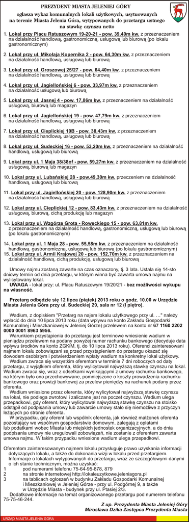 PREZYDENT MIASTA JELENIEJ GÓRY ogłasza wykaz komunalnych lokali użytkowych, usytuowanych na terenie Miasta Jelenia Góra, wytypowanych do przetargu ustnego na stawkę czynszu netto 1. Lokal przy Placu Ratuszowym 19-20-21 - pow. 39,40m kw. z przeznaczeniem na działalność handlową, gastronomiczną, usługową lub biurową (po lokalu gastronomicznym) 2. Lokal przy ul. Mikołaja Kopernika 2 - pow. 64,30m kw. z przeznaczeniem na działalność handlową, usługową lub biurową 3. Lokal przy ul. Groszowej 25/27 - pow. 64,40m kw. z przeznaczeniem na działalność handlową, usługową lub biurową 4. Lokal przy ul. Jagiellońskiej 6 - pow. 33,97m kw. z przeznaczeniem na działalność usługową lub biurową 5. Lokal przy ul. Jasnej 4 - pow. 17,86m kw. z przeznaczeniem na działalność usługową, biurową lub magazyn 6. Lokal przy ul. Jagiellońskiej 19 - pow. 47,79m kw. z przeznaczeniem na działalność handlową, usługową lub biurową 7. Lokal przy ul. Cieplickiej 10B - pow. 38,43m kw. z przeznaczeniem na działalność handlową, usługową lub biurową 8. Lokal przy ul. Sudeckiej 16 - pow. 53,20m kw. z przeznaczeniem na działalność handlową, usługową lub biurową 9. Lokal przy ul. 1 Maja 38/38of - pow. 59,27m kw. z przeznaczeniem na działalność usługową, biurową lub magazyn 10. Lokal przy ul. Lubańskiej 28 - pow.49,30m kw. przeczeniem na działalność handlową, usługową lub biurową 11. Lokal przy ul. Jagiellońskiej 20 - pow. 128,90m kw. z przeznaczeniem na działalność handlową, usługową lub biurową 12. Lokal przy ul. Cieplickiej 12 - pow. 83,43m kw. z przeznaczeniem na działalność usługową, biurową, cichą produkcję lub magazyn 13. Lokal przy ul. Wzgórze Grota - Roweckiego 15 - pow. 63,81m kw. z przeznaczeniem na działalność handlową, gastronomiczną, usługową lub biurową (po lokalu gastronomicznym) 14. Lokal przy ul. 1 Maja 28 - pow. 55,58m kw. z przeznaczeniem na działalność handlową, gastronomiczną, usługową lub biurową (po lokalu gastronomicznym) 15. Lokal przy ul. Armii Krajowej 20 - pow. 152,70m kw. z przeznaczeniem na działalność handlową, cichą produkcję, usługową lub biurową Umowy najmu zostaną zawarte na czas oznaczony, tj. 3 lata. Ustala się 14-sto dniowy termin od dnia przetargu, w którym winna być zawarta umowa najmu na wylicytowany lokal. UWAGA - lokal przy: ul. Placu Ratuszowym 19/20/21 - bez możliwości wykupu na własność. Przetarg odbędzie się 12 lipca (piątek) 2013 roku o godz. 10.00 w Urzędzie Miasta Jelenia Góra przy ul. Sudeckiej 29, sala nr 12 (I piętro). Wadium, z dopiskiem "Przetarg na najem lokalu użytkowego przy ul. …" należy wpłacić do dnia 10 lipca 2013 roku (data wpływu na konto Zakładu Gospodarki Komunalnej i Mieszkaniowej w Jeleniej Górze) przelewem na konto nr 67 1160 2202 0000 0001 8963 5956. Warunkiem przystąpienia do przetargu jest terminowe wniesienie wadium w pieniądzu przelewem na podany powyżej numer rachunku bankowego (decyduje data wpływu środków na konto ZGKiM, tj. do 10 lipca 2013 roku). Oferenci zainteresowani najmem lokalu zobowiązani są przed przystąpieniem do przetargu okazać się dowodem osobistym i potwierdzeniem wpłaty wadium na konkretny lokal użytkowy. Wadium zwraca się wszystkim oferentom w terminie 7 dni roboczych od daty przetargu, z wyjątkiem oferenta, który wylicytował najwyższą stawkę czynszu na lokal. Wadium zwraca się, wraz z odsetkami wynikającymi z umowy rachunku bankowego, na którym było ono przechowywane, pomniejszone o koszty prowadzenia rachunku bankowego oraz prowizji bankowej za przelew pieniędzy na rachunek podany przez oferenta. Wadium wniesione przez oferenta, który wylicytował najwyższą stawkę czynszu na lokal, nie podlega zwrotowi i zaliczane jest na poczet czynszu. Wadium ulega przepadkowi, gdy oferent, który wylicytował najwyższą stawkę czynszu na stoisko odstąpił od podpisania umowy lub zawarcie umowy stało się niemożliwe z przyczyn leżących po stronie oferenta. W przypadku, gdy oferent lub wspólnik oferenta, jak również małżonek oferenta pozostający we wspólnym gospodarstwie domowym, zalegają z opłatami lub podatkami wobec Miasta lub miejskich jednostek organizacyjnych, a do dnia podpisania umowy nie uregulowali zobowiązań, nie zostanie z oferentem zawarta umowa najmu. W takim przypadku wniesione wadium ulega przepadkowi. Oferentom zainteresowanym najmem lokalu przysługuje prawo uzyskania informacji dotyczących lokalu, a także do dokonania wizji w lokalu przed przetargiem. Informacje o lokalach wytypowanych do przetargu, wraz ze szczegółowymi danymi o ich stanie technicznym, można uzyskać: 1 pod numerami telefonu 75-64-95-878, 879 2 na stronie internetowej http://lokaleuzytkowe.jeleniagora.pl 3 na tablicach ogłoszeń w budynku Zakładu Gospodarki Komunalnej i Mieszkaniowej w Jeleniej Górze - przy ul. Podgórnej 9, a także w Urzędzie Miasta - budynek przy ul. Ptasiej 2/3. Dodatkowe informacje na temat organizowanego przetargu pod numerem telefonu 75-75-46-244. Z up. Prezydenta Miasta Jeleniej Góry Mirosława Dzika Zastępca Prezydenta Miasta URZĄD MIASTA JELENIA GÓRA