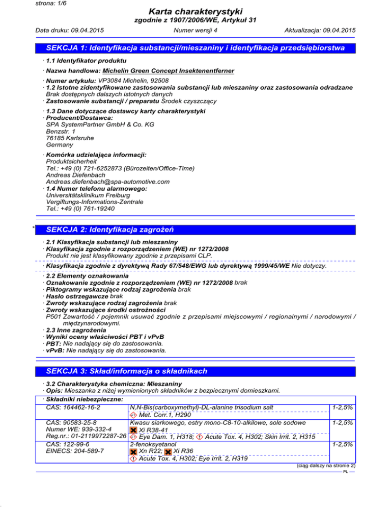 40.0.1 strona: 1/6 Karta charakterystyki zgodnie z 1907/2006/WE, Artykuł 31 Data druku: 09.04.2015 Numer wersji 4 Aktualizacja: 09.04.2015 SEKCJA 1: Identyfikacja substancji/mieszaniny i identyfikacja przedsiębiorstwa · 1.1 Identyfikator produktu · Nazwa handlowa: Michelin Green Concept Insektenentferner · Numer artykułu: VP3084 Michelin, 92508 · 1.2 Istotne zidentyfikowane zastosowania substancji lub mieszaniny oraz zastosowania odradzane Brak dostępnych dalszych istotnych danych · Zastosowanie substancji / preparatu Środek czyszczący · 1.3 Dane dotyczące dostawcy karty charakterystyki · Producent/Dostawca: SPA SystemPartner GmbH & Co. KG Benzstr. 1 76185 Karlsruhe Germany · Komórka udzielająca informacji: Produktsicherheit Tel.: +49 (0) 721-6252873 (Bürozeiten/Office-Time) Andreas Diefenbach [email protected] · 1.4 Numer telefonu alarmowego: Universitätsklinikum Freiburg Vergiftungs-Informations-Zentrale Tel.: +49 (0) 761-19240 * SEKCJA 2: Identyfikacja zagrożeń · 2.1 Klasyfikacja substancji lub mieszaniny · Klasyfikacja zgodnie z rozporządzeniem (WE) nr 1272/2008 Produkt nie jest klasyfikowany zgodnie z przepisami CLP. · Klasyfikacja zgodnie z dyrektywą Rady 67/548/EWG lub dyrektywą 1999/45/WE Nie dotyczy. · 2.2 Elementy oznakowania · Oznakowanie zgodnie z rozporządzeniem (WE) nr 1272/2008 brak · Piktogramy wskazujące rodzaj zagrożenia brak · Hasło ostrzegawcze brak · Zwroty wskazujące rodzaj zagrożenia brak · Zwroty wskazujące środki ostrożności P501 Zawartość / pojemnik usuwać zgodnie z przepisami miejscowymi / regionalnymi / narodowymi / międzynarodowymi. · 2.3 Inne zagrożenia · Wyniki oceny właściwości PBT i vPvB · PBT: Nie nadający się do zastosowania. · vPvB: Nie nadający się do zastosowania. SEKCJA 3: Skład/informacja o składnikach · 3.2 Charakterystyka chemiczna: Mieszaniny · Opis: Mieszanka z niżej wymienionych składników z bezpiecznymi domieszkami. · Składniki niebezpieczne: CAS: 164462-16-2 N,N-Bis(carboxymethyl)-DL-alanine trisodium salt Met. Corr.1, H290 CAS: 90583-25-8 Kwasu siarkowego, estry mono-C8-10-alkilowe, sole sodowe Numer WE: 939-332-4 Xi R38-41 Reg.nr.: 01-2119972287-26 Eye Dam. 1, H318; Acute Tox. 4, H302; Skin Irrit. 2, H315 CAS: 122-99-6 2-fenoksyetanol Xn R22; Xi R36 EINECS: 204-589-7 Acute Tox. 4, H302; Eye Irrit. 2, H319 1-2,5% 1-2,5% 1-2,5% (ciąg dalszy na stronie 2) PL 40.0.1 strona: 2/6 Karta charakterystyki zgodnie z 1907/2006/WE, Artykuł 31 Data druku: 09.04.2015 Numer wersji 4 Aktualizacja: 09.04.2015 Nazwa handlowa: Michelin Green Concept Insektenentferner (ciąg dalszy od strony 1) · Wskazówki dodatkowe: Pełna treść przytoczonych wskazówek dotyczących zagrożeń znajduje się w rozdziale 16. SEKCJA 4: Środki pierwszej pomocy · 4.1 Opis środków pierwszej pomocy · Wskazówki ogólne: Środki specjalne nie są konieczne. · Po wdychaniu: Dostarczyć świeże powietrze, w razie dolegliwości wezwać lekarza. · Po styczności ze skórą: Ogólnie produkt nie działa drażniąco na skórę. Natychmiast zmyć wodą i mydłem i dobrze spłukać. · Po styczności z okiem: Płukać oczy z otwartą powieką przez kilka minut pod bieżącą wodą. · Po przełknięciu: Przy trwałych dolegliwościach porozumieć się z lekarzem. · 4.2 Najważniejsze ostre i opóźnione objawy oraz skutki narażenia Brak dostępnych dalszych istotnych danych · 4.3 Wskazania dotyczące wszelkiej natychmiastowej pomocy lekarskiej i szczególnego postępowania z poszkodowanym Brak dostępnych dalszych istotnych danych SEKCJA 5: Postępowanie w przypadku pożaru · 5.1 Środki gaśnicze · Przydatne środki gaśnicze: CO₂, proszek gaśniczy lub strumień wody. Większy pożar zwalczać strumieniem wody lub pianą odporną na działanie alkoholu. · 5.2 Szczególne zagrożenia związane z substancją lub mieszaniną Brak dostępnych dalszych istotnych danych · 5.3 Informacje dla straży pożarnej · Specjalne wyposażenie ochronne: Środki specjalne nie są konieczne. SEKCJA 6: Postępowanie w przypadku niezamierzonego uwolnienia do środowiska · 6.1 Indywidualne środki ostrożności, wyposażenie ochronne i procedury w sytuacjach awaryjnych Nie konieczne. · 6.2 Środki ostrożności w zakresie ochrony środowiska: Rozcieńczyć dużą ilością wody. Nie dopuścić do przeniknięcia do kanalizacji /wód powierzchniowych /wód gruntowych. · 6.3 Metody i materiały zapobiegające rozprzestrzenianiu się skażenia i służące do usuwania skażenia: Zebrać za pomocą materiału wiążącego ciecze (piasek, ziemia okrzemkowa, materiał wiążący kwasy, materiał wiążący uniwersalny, trociny). · 6.4 Odniesienia do innych sekcji Nie powstają żadne materiały niebezpieczne. Informacje na temat bezpiecznej obsługi patrz rozdział 7. Informacje na temat osobistego wyposażenia ochronnego patrz rozdział 8. Informacje na temat utylizacji patrz rozdział 13. SEKCJA 7: Postępowanie z substancjami i mieszaninami oraz ich magazynowanie · 7.1 Środki ostrożności dotyczące bezpiecznego postępowania Środki specjalne nie są konieczne. · Wskazówki dla ochrony przeciwpożarowej i przeciwwybuchowej: Nie są potrzebne szczególne zabiegi. (ciąg dalszy na stronie 3) PL 40.0.1 strona: 3/6 Karta charakterystyki zgodnie z 1907/2006/WE, Artykuł 31 Data druku: 09.04.2015 Numer wersji 4 Aktualizacja: 09.04.2015 Nazwa handlowa: Michelin Green Concept Insektenentferner (ciąg dalszy od strony 2) · 7.2 Warunki bezpiecznego magazynowania, łącznie z informacjami dotyczącymi wszelkich wzajemnych niezgodności · Składowanie: · Wymagania w stosunku do pomieszczeń składowych i zbiorników: Brak szczególnych wymagań. · Wskazówki odnośnie wspólnego składowania: Nie konieczne. · Dalsze wskazówki odnośnie warunków składowania: Brak. · 7.3 Szczególne zastosowanie(-a) końcowe Brak dostępnych dalszych istotnych danych SEKCJA 8: Kontrola narażenia/środki ochrony indywidualnej · Dodatko