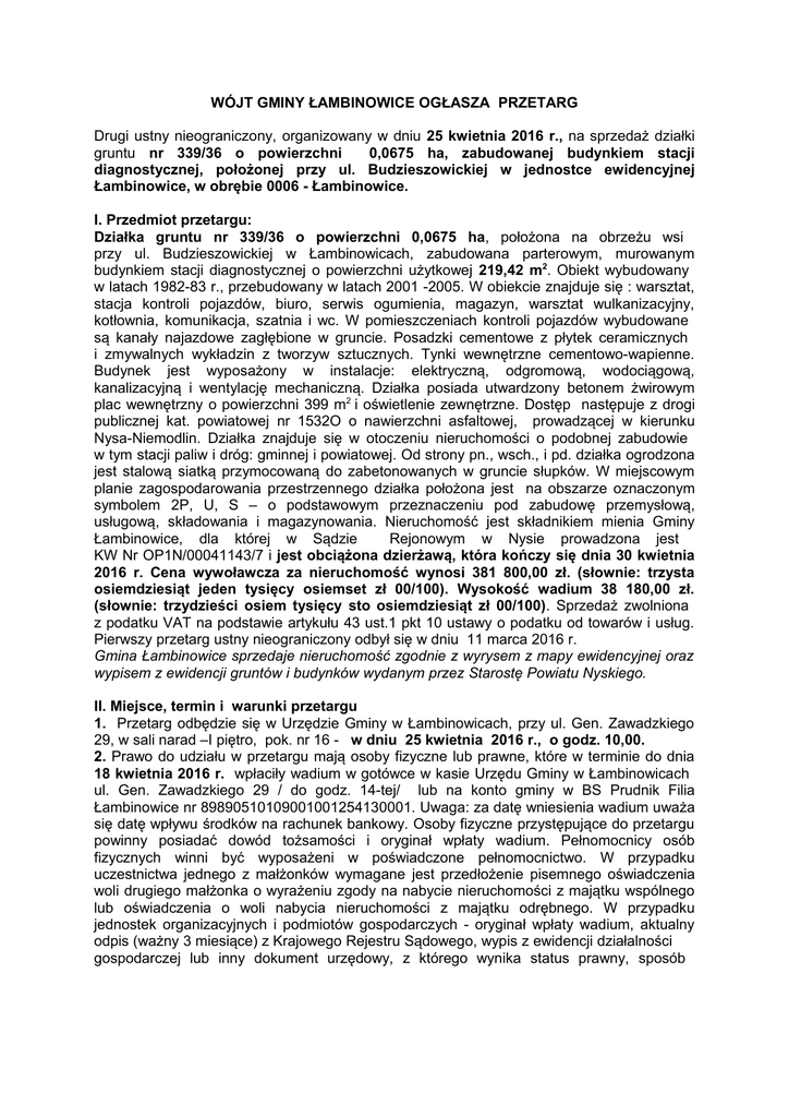 WÓJT GMINY ŁAMBINOWICE OGŁASZA PRZETARG Drugi ustny nieograniczony, organizowany w dniu 25 kwietnia 2016 r., na sprzedaż działki gruntu nr 339/36 o powierzchni 0,0675 ha, zabudowanej budynkiem stacji diagnostycznej, położonej przy ul. Budzieszowickiej w jednostce ewidencyjnej Łambinowice, w obrębie 0006 - Łambinowice. I. Przedmiot przetargu: Działka gruntu nr 339/36 o powierzchni 0,0675 ha, położona na obrzeżu wsi przy ul. Budzieszowickiej w Łambinowicach, zabudowana parterowym, murowanym budynkiem stacji diagnostycznej o powierzchni użytkowej 219,42 m2. Obiekt wybudowany w latach 1982-83 r., przebudowany w latach 2001 -2005. W obiekcie znajduje się : warsztat, stacja kontroli pojazdów, biuro, serwis ogumienia, magazyn, warsztat wulkanizacyjny, kotłownia, komunikacja, szatnia i wc. W pomieszczeniach kontroli pojazdów wybudowane są kanały najazdowe zagłębione w gruncie. Posadzki cementowe z płytek ceramicznych i zmywalnych wykładzin z tworzyw sztucznych. Tynki wewnętrzne cementowo-wapienne. Budynek jest wyposażony w instalacje: elektryczną, odgromową, wodociągową, kanalizacyjną i wentylację mechaniczną. Działka posiada utwardzony betonem żwirowym plac wewnętrzny o powierzchni 399 m2 i oświetlenie zewnętrzne. Dostęp następuje z drogi publicznej kat. powiatowej nr 1532O o nawierzchni asfaltowej, prowadzącej w kierunku Nysa-Niemodlin. Działka znajduje się w otoczeniu nieruchomości o podobnej zabudowie w tym stacji paliw i dróg: gminnej i powiatowej. Od strony pn., wsch., i pd. działka ogrodzona jest stalową siatką przymocowaną do zabetonowanych w gruncie słupków. W miejscowym planie zagospodarowania przestrzennego działka położona jest na obszarze oznaczonym symbolem 2P, U, S – o podstawowym przeznaczeniu pod zabudowę przemysłową, usługową, składowania i magazynowania. Nieruchomość jest składnikiem mienia Gminy Łambinowice, dla której w Sądzie Rejonowym w Nysie prowadzona jest KW Nr OP1N/00041143/7 i jest obciążona dzierżawą, która kończy się dnia 30 kwietnia 2016 r. Cena wywoławcza za nieruchomość wynosi 381 800,00 zł. (słownie: trzysta osiemdziesiąt jeden tysięcy osiemset zł 00/100). Wysokość wadium 38 180,00 zł. (słownie: trzydzieści osiem tysięcy sto osiemdziesiąt zł 00/100). Sprzedaż zwolniona z podatku VAT na podstawie artykułu 43 ust.1 pkt 10 ustawy o podatku od towarów i usług. Pierwszy przetarg ustny nieograniczony odbył się w dniu 11 marca 2016 r. Gmina Łambinowice sprzedaje nieruchomość zgodnie z wyrysem z mapy ewidencyjnej oraz wypisem z ewidencji gruntów i budynków wydanym przez Starostę Powiatu Nyskiego. II. Miejsce, termin i warunki przetargu 1. Przetarg odbędzie się w Urzędzie Gminy w Łambinowicach, przy ul. Gen. Zawadzkiego 29, w sali narad –I piętro, pok. nr 16 - w dniu 25 kwietnia 2016 r., o godz. 10,00. 2. Prawo do udziału w przetargu mają osoby fizyczne lub prawne, które w terminie do dnia 18 kwietnia 2016 r. wpłaciły wadium w gotówce w kasie Urzędu Gminy w Łambinowicach ul. Gen. Zawadzkiego 29 / do godz. 14-tej/ lub na konto gminy w BS Prudnik Filia Łambinowice nr 89890510109001001254130001. Uwaga: za datę wniesienia wadium uważa się datę wpływu środków na rachunek bankowy. Osoby fizyczne przystępujące do przetargu powinny posiadać dowód tożsamości i oryginał wpłaty wadium. Pełnomocnicy osób fizycznych winni być wyposażeni w poświadczone pełnomocnictwo. W przypadku uczestnictwa jednego z małżonków wymagane jest przedłożenie pisemnego oświadczenia woli drugiego małżonka o wyrażeniu zgody na nabycie nieruchomości z majątku wspólnego lub oświadczenia o woli nabycia nieruchomości z majątku odrębnego. W przypadku jednostek organizacyjnych i podmiotów gospodarczych - oryginał wpłaty wadium, aktualny odpis (ważny 3 miesiące) z Krajowego Rejestru Sądowego, wypis z ewidencji działalności gospodarczej lub inny dokument urzędowy, z którego wynika status prawny, sposób -2reprezentacji i imiona oraz nazwiska osób uprawnionych do reprezentacji; pełnomocnictwo w przypadku osób reprezentujących osobę prawną; dokument potwierdzający uzyskanie swobodnej zgody na nabycie nieruchomości będącej przedmiotem przetargu. 3. Wadium wniesione w pieniądzu przez uczestnika przetargu, który przetarg wygrał, zalicza się na poczet ceny nabycia nieruchomości. Pozostałym uczestnikom przetargu wadium zostaje zwrócone bezpośrednio po odwołaniu lub zamknięciu przetargu, jednak nie później niż przed upływem trzech dni od dnia odwołania lub zamknięcia przetargu. 4. Uczestnicy przetargu składają pisemne oświadczenia o zapoznaniu się z przedmiotem sprzedaży, znajomości granic nieruchomości, braku zastrzeżeń do przedmiotu sprzedaży , nabyciu nieruchomości w stanie istniejącym na podstawie dokumentów wydanych z ewidencji gruntów i budynków (pełna treść oświadczeń dostępna przed otwarciem przetargu). 5. Dowód wpłaty wadium podlega przedłożeniu komisji przetargowej przed otwarciem przetargu. 6.Wadium przepada na rzecz sprzedawcy w razie uchylania się nabywcy od zawarcia umowy przenoszącej własność nieruchomości. 7.Ustalony w przetargu nabywca zobowiązany jest do dokonania wpłaty ceny nabycia nie później niż na dzień przed zawarciem umowy notarialnej przenoszącej własność oraz pokrycia wszelkich opłat związanych ze sporządzeniem umowy . 8. Ogłoszenie o przetargu zostaje podane do publicznej wiadomości poprzez umieszczenie na tablicy ogłoszeń w siedzibie Urzędu Gminy w Łambinowicach, na stronie internetowej Urzędu: www.lambinowice.pl, w Biuletynie Informacji Publicznej pod adresem: www.bip.lambinowice.pl, w Nowej Trybunie Opolskiej wydanie z dnia 25.03.2016 r. 9. Szczegółowe informacje można uzyskać w siedzibie Urzędu Gminy Łambinowice, ul. Gen. Zawadzkiego 29, pok. nr 2 I piętro, lub telefonicznie - 077 4311300, 301, wew. 211. Wójt /- Tomasz Karpiński Łambinowice,