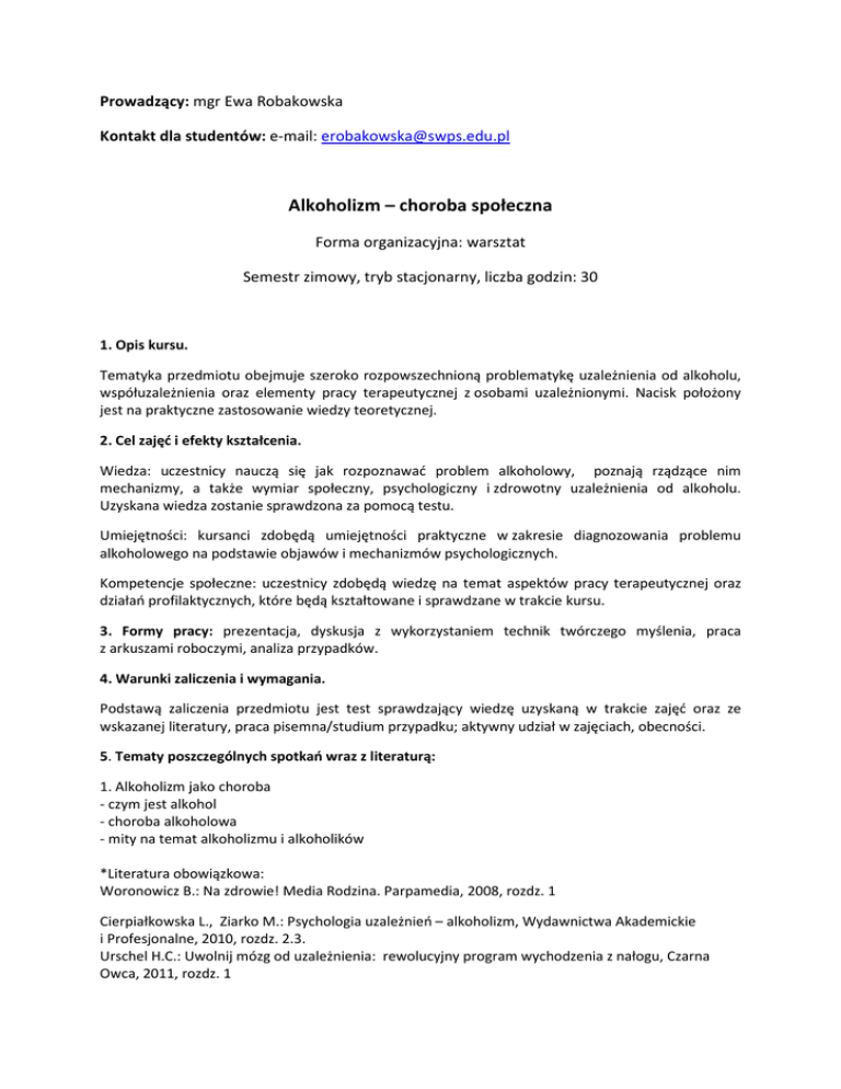 Prowadzący: mgr Ewa Robakowska Kontakt dla studentów: e-mail: [email protected] Alkoholizm – choroba społeczna Forma organizacyjna: warsztat Semestr zimowy, tryb stacjonarny, liczba godzin: 30 1. Opis kursu. Tematyka przedmiotu obejmuje szeroko rozpowszechnioną problematykę uzależnienia od alkoholu, współuzależnienia oraz elementy pracy terapeutycznej z osobami uzależnionymi. Nacisk położony jest na praktyczne zastosowanie wiedzy teoretycznej. 2. Cel zajęć i efekty kształcenia. Wiedza: uczestnicy nauczą się jak rozpoznawać problem alkoholowy, poznają rządzące nim mechanizmy, a także wymiar społeczny, psychologiczny i zdrowotny uzależnienia od alkoholu. Uzyskana wiedza zostanie sprawdzona za pomocą testu. Umiejętności: kursanci zdobędą umiejętności praktyczne w zakresie diagnozowania problemu alkoholowego na podstawie objawów i mechanizmów psychologicznych. Kompetencje społeczne: uczestnicy zdobędą wiedzę na temat aspektów pracy terapeutycznej oraz działań profilaktycznych, które będą kształtowane i sprawdzane w trakcie kursu. 3. Formy pracy: prezentacja, dyskusja z wykorzystaniem technik twórczego myślenia, praca z arkuszami roboczymi, analiza przypadków. 4. Warunki zaliczenia i wymagania. Podstawą zaliczenia przedmiotu jest test sprawdzający wiedzę uzyskaną w trakcie zajęć oraz ze wskazanej literatury, praca pisemna/studium przypadku; aktywny udział w zajęciach, obecności. 5. Tematy poszczególnych spotkań wraz z literaturą: 1. Alkoholizm jako choroba - czym jest alkohol - choroba alkoholowa - mity na temat alkoholizmu i alkoholików *Literatura obowiązkowa: Woronowicz B.: Na zdrowie! Media Rodzina. Parpamedia, 2008, rozdz. 1 Cierpiałkowska L., Ziarko M.: Psychologia uzależnień – alkoholizm, Wydawnictwa Akademickie i Profesjonalne, 2010, rozdz. 2.3. Urschel H.C.: Uwolnij mózg od uzależnienia: rewolucyjny program wychodzenia z nałogu, Czarna Owca, 2011, rozdz. 1 Literatura uzupełniająca: Lazarus A.A., Colman A.E.: Psychopatologia, Zysk i S-ka, Poznań, 2011, rozdz. 5 – Alkoholizm 2. Etiologia problemu alkoholowego - czynniki sprzyjające uzależnieniu - droga do uzależnienia - picie ryzykowne i nadużywanie alkoholu *Literatura obowiązkowa: Woronowicz B.: Na zdrowie! Media Rodzina. Parpamedia, 2008, rozdz. 3, 4, 7 Margasiński A.: Rodzina alkoholowa z uzależnionym w leczeniu, Impuls, 2010, rozdz.1 Cierpiałkowska L., Ziarko M.: Psychologia uzależnień – alkoholizm, Wydawnictwa Akademickie i Profesjonalne, 2010, rozdz. 3.5. Będkowska-Korpała B.: Uzależnienia w praktyce klinicznej, PARPAMEDIA, Warszawa, 2009, rozdz. 2 Literatura uzupełniająca: Teesson M., Degenhardt L., Hall W.: Uzależnienia, GWP, Sopot, 2005, rozdz. 4 3. Objawy choroby alkoholowej - kryteria uzależnienia - rozpoznawanie problemu - zjawisko głodu alkoholowego: objawy, radzenie sobie *Literatura obowiązkowa: Chlebio-Abed D .: Pierwotna profilaktyka uzależnienia od alkoholu, Śląsk, Katowice, 2000, str. 35-36 Cierpiałkowska L., Ziarko M.: Psychologia uzależnień – alkoholizm, Wydawnictwa Akademickie i Profesjonalne, 2010, rozdz. 2.4., 2.7. Woronowicz B.: Na zdrowie! Media Rodzina. Parpamedia, 2008, rozdz. 6 4., 5. Fazy rozwoju uzależnienia od alkoholu - etapy choroby alkoholowej - błędne koło uzależnienia - projekcja filmu z zakresu problematyki uzależnień *Literatura obowiązkowa: Chlebio-Abed D .: Pierwotna profilaktyka uzależnienia od alkoholu, Śląsk, Katowice, 2000, str. 37-38 Margasiński A.: Rodzina alkoholowa z uzależnionym w leczeniu, Impuls, 2010, rozdz. 1 Chodkiewicz J.: Odbić się od dna, UŁ, 2012, str. 45-52 6., 7. Mechanizmy uzależnienia od alkoholu. Emocje i alkohol. - psychologiczne mechanizmy alkoholizmu - rozpoznawanie uzależnienia na podstawie rządzących nim mechanizmów - wpływ alkoholu na życie emocjonalne - rozpoznawanie uczuć - radzenie sobie z emocjami *Literatura obowiązkowa: Jampolsky L.: Leczenie uzależnionego umysłu, Santorski & Co, Warszawa, 2004, str. 36-43, 45-65 Urschel H.C.: Uwolnij mózg od uzależnienia: rewolucyjny program wychodzenia z nałogu, Czarna Owca, 2011, rozdz. 2 i 6 Chodkiewicz J.: Odbić się od dna, UŁ, 1012, str. 64-70 Literatura uzupełniająca: Potter-Efron R.P.: Złość, alkoholizm i inne uzależnienia, PTP, 1994 8, 9. Współuzależnienie i problemy społeczne wynikające z uzależnienia - istota współuzależnienia - rodzina z problemem alkoholowym - DDA - problemy prawne, materialne i zawodowe osoby uzależnionej *Literatura obowiązkowa: Beattie M.: Koniec współuzależnienia, Media Rodzina, Poznań, 2003, rozdz. 3, 4 Margasiński A.: Rodzina alkoholowa z uzależnionym w leczeniu, Impuls, 2010, rozdz. 3.4, 4, 5, 6 Cierpiałkowska L., Ziarko M.: Psychologia uzależnień – alkoholizm, Wydawnictwa Akademickie i Profesjonalne, 2010, rozdz. 4.4., 4.5. Chlebio-Abed D .: Pierwotna profilaktyka uzależnienia od alkoholu, Śląsk, Katowice, 2000, str. 42-69 Woronowicz B.: Na zdrowie! Media Rodzina. Parpamedia, 2008, rozdz. 25, 26 Woititz J.G.: Dorosłe dzieci alkoholików, Akuracik, Warszawa, 2000, str. 32-65 Literatura uzupełniająca: Woydyłło E.: Rak duszy. O alkoholiźmie, Wydawnictwo Literackie, 2009, str. 81-89 Urschel H.C.: Uwolnij mózg od uzależnienia: rewolucyjny program wychodzenia z nałogu, Czarna Owca, 2011, rozdz.8 10. Zdrowotne konsekwencje nadużywania alkoholu - wpływ alkoholu na organizm - szkody zdrowotne wyrządzane przez alkohol - zespoły psychopatologiczne *Literatura obowiązkowa: Woronowicz B.: Na zdrowie! Media Rodzina. Parpamedia, 2008, rozdz. 5 Teesson M., Degenhardt L., Hall W.: Uzależnienia, GWP, Sopot, 2005, str. 31-34 Cierpiałkowska L., Ziarko M.: Psychologia uzależnień – alkoholizm, Wydawnictwa Akademickie i Profesjonalne, 2010, rozdz. 1.3, 1.4. Literatura uzupełniająca: red. Pużyński S., Rybakowski J., Wciórka J.: Psychiatria. T. 2, Psychiatria kliniczna, Elsevier Urban & Partner, 2011, rozdz. 3.4. Chlebio-Ab
